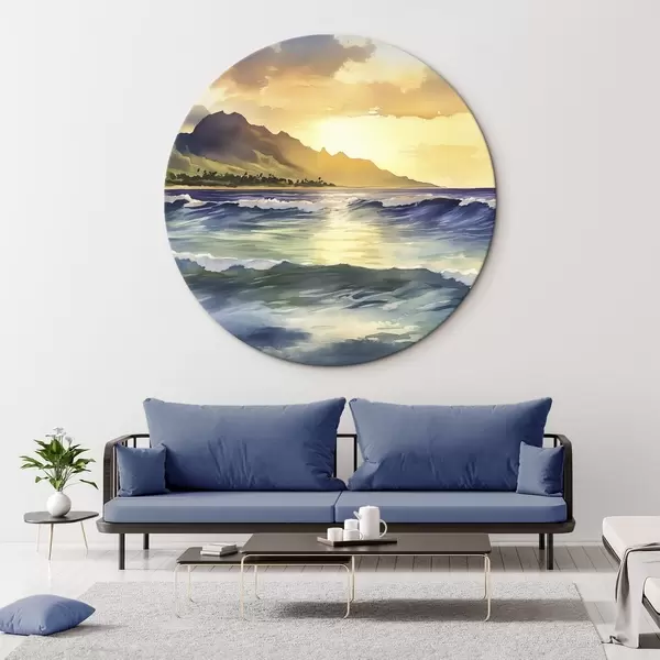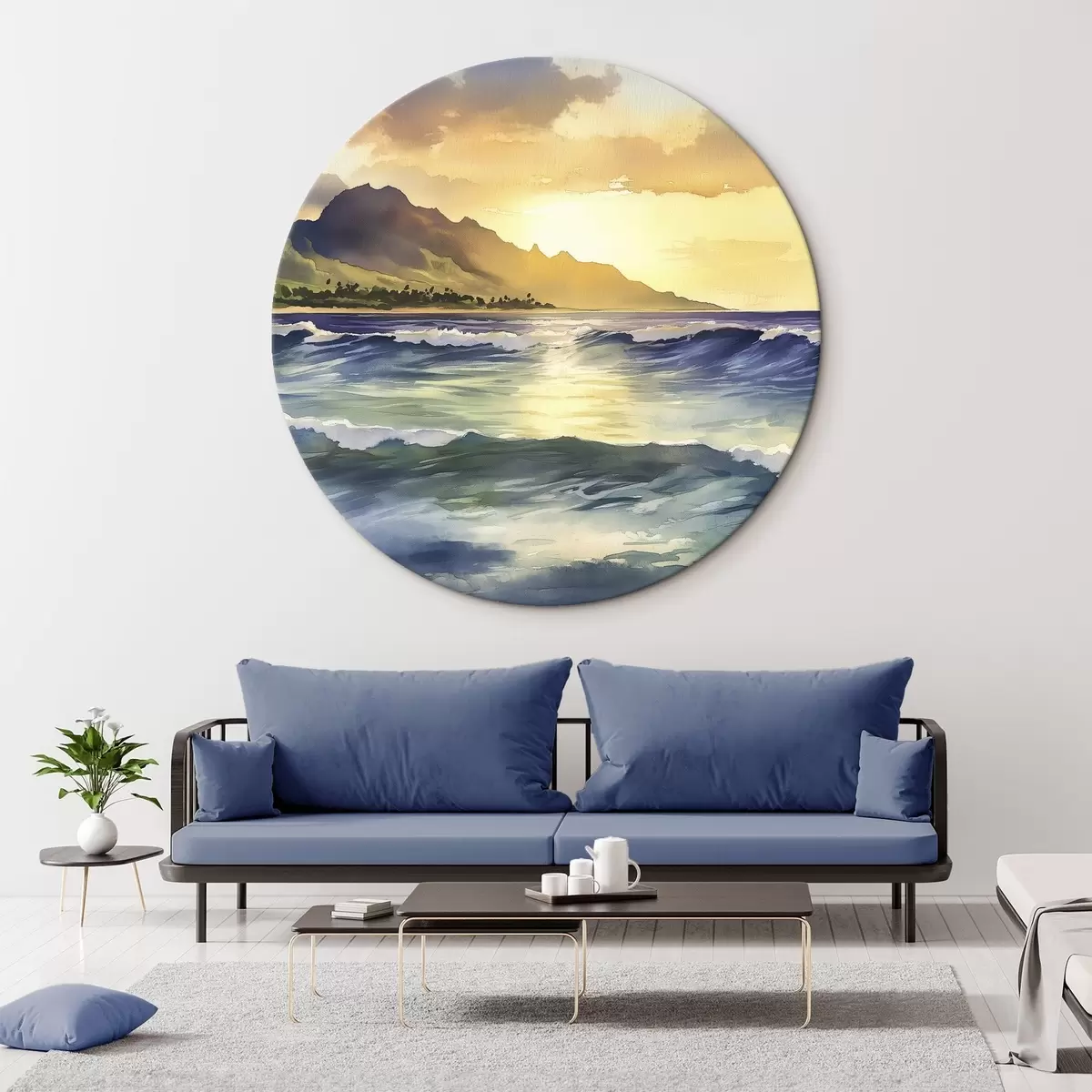 Tableaux ronds Vagues de l'océan, coucher de soleil, style aquarelle, nature r44147