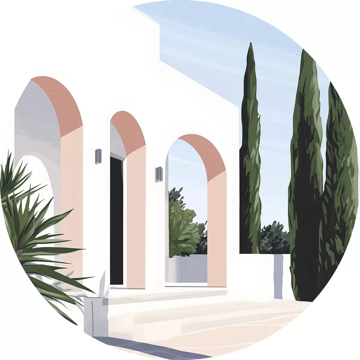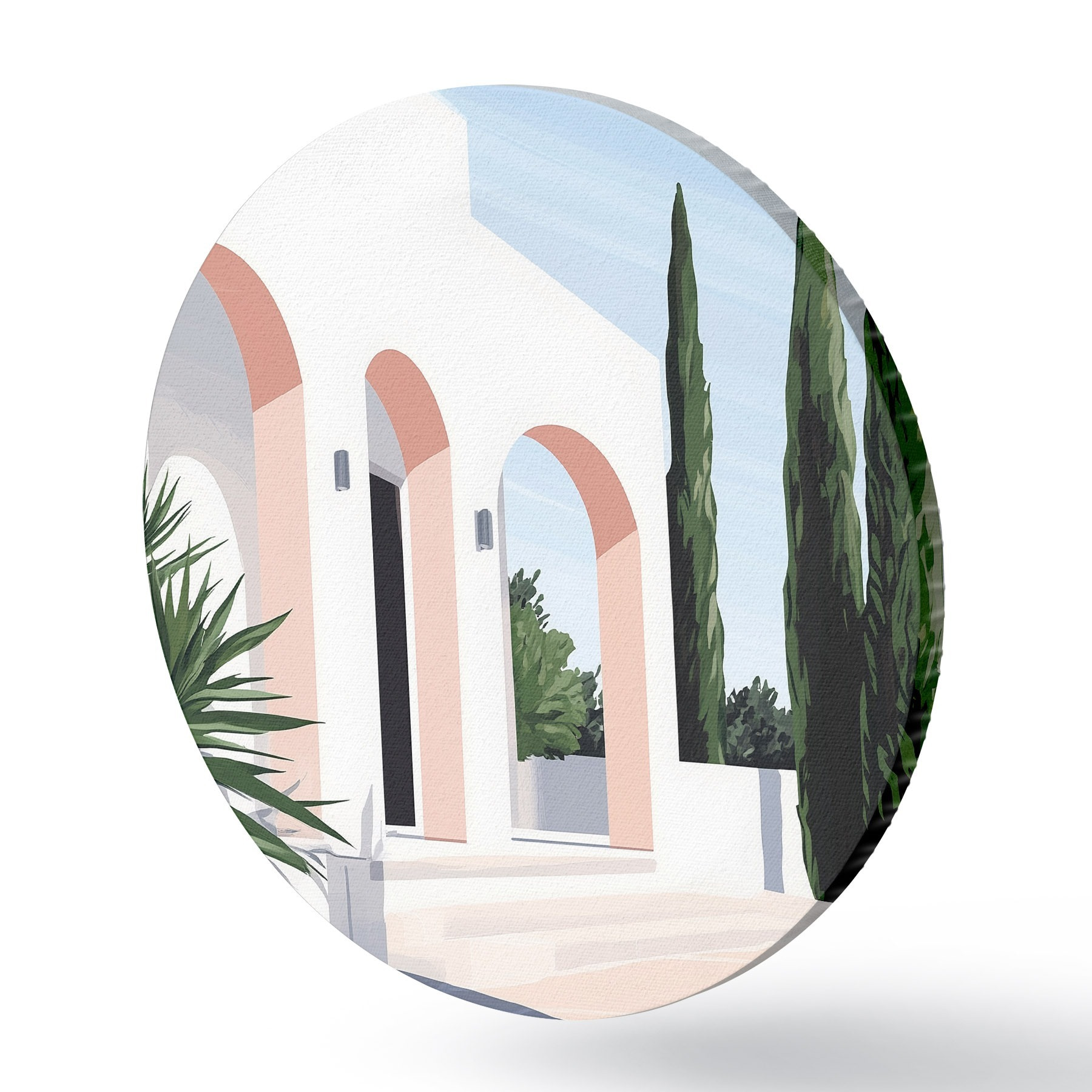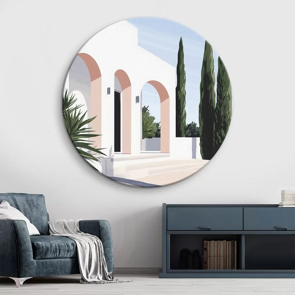 Tableaux ronds Villa blanche avec arches et jardin tropical, méditerranéenne, style plat r44153