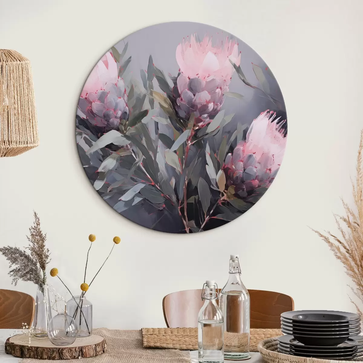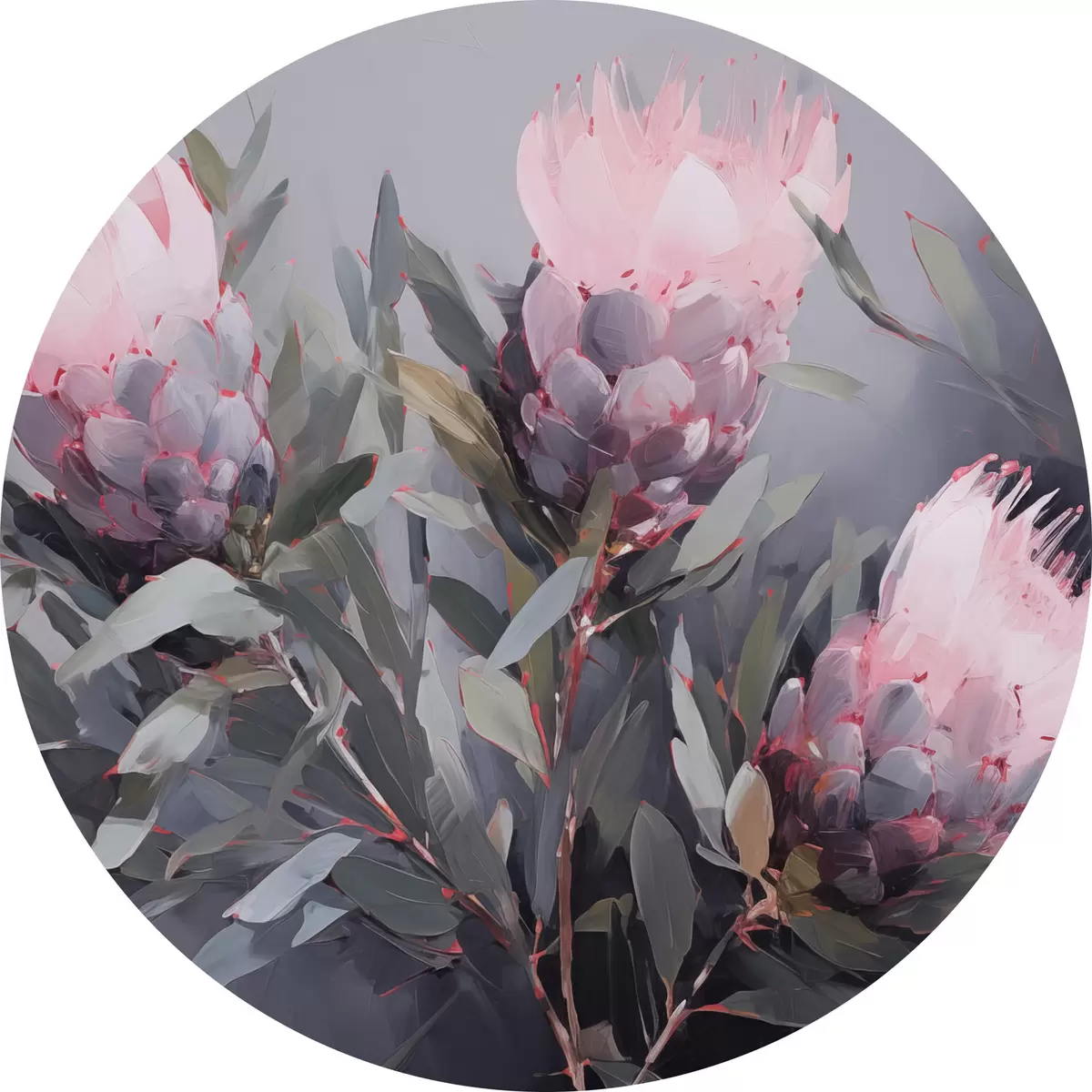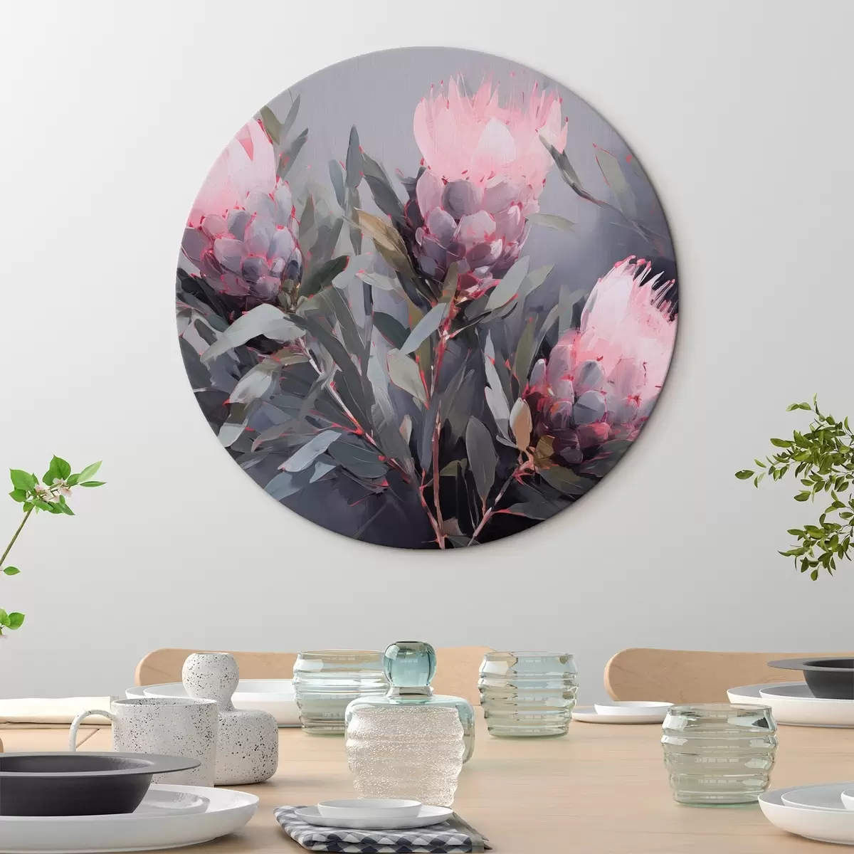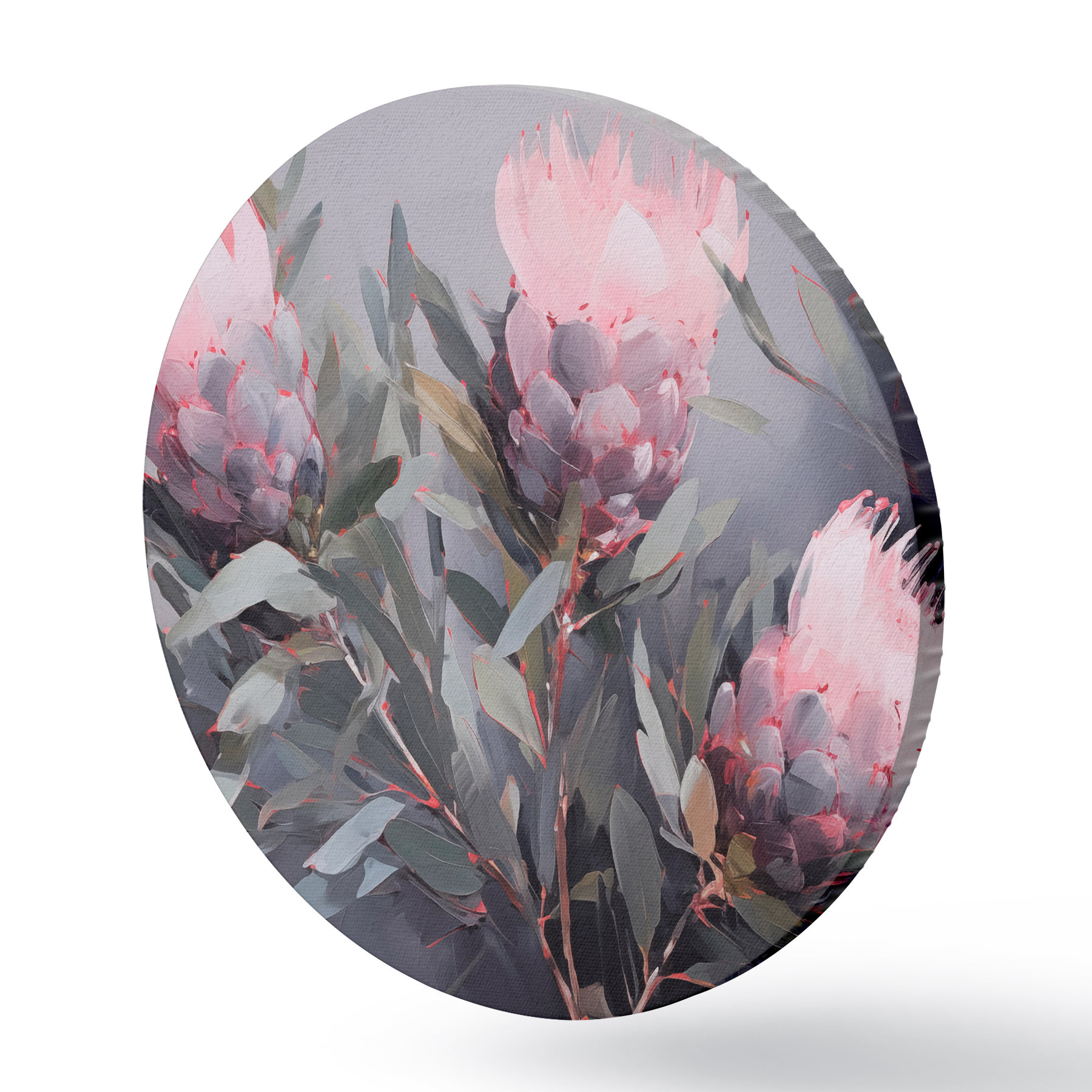 Tableaux ronds Fleurs de protea roses avec feuilles vertes, coups de pinceau doux, couleurs sombres, composition élégante r44400