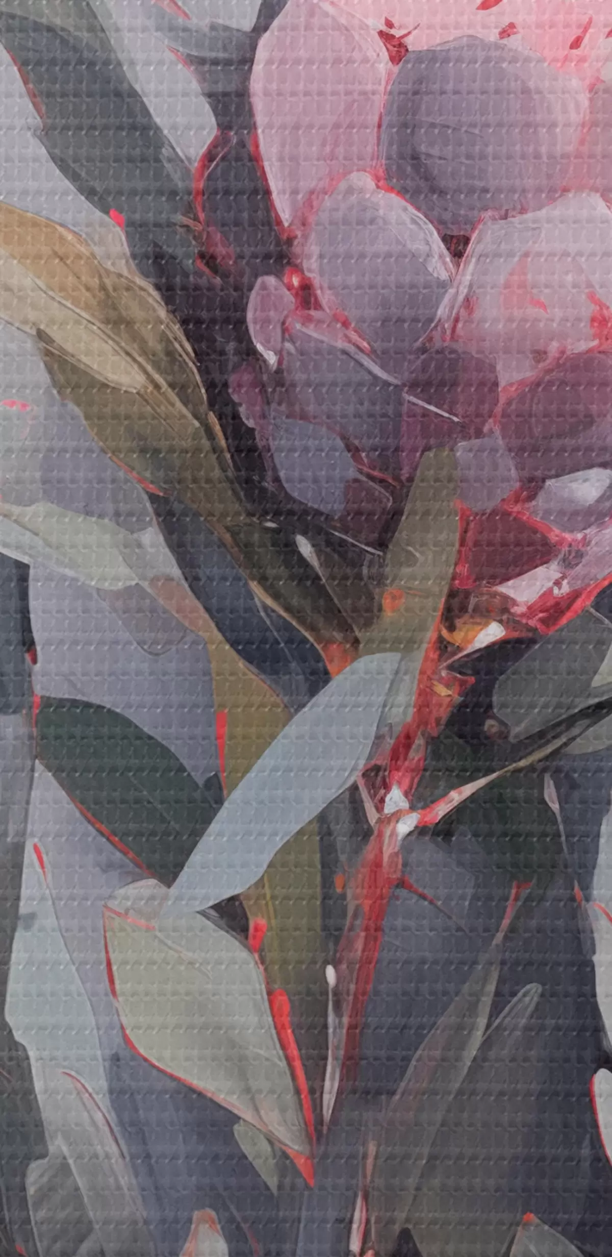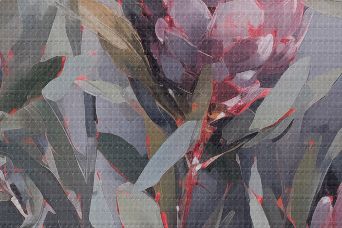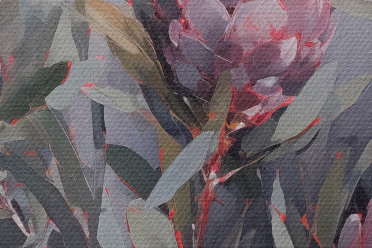 Image Fleurs de protea roses avec feuilles vertes, coups de pinceau doux, couleurs sombres, composition élégante Nr r44400