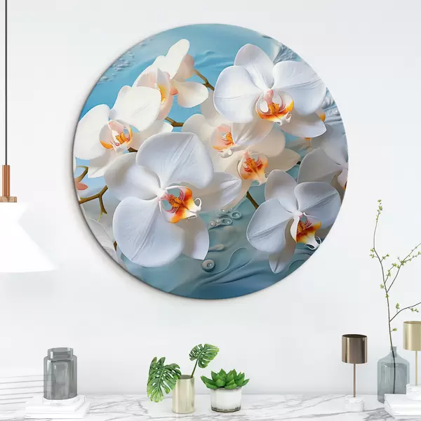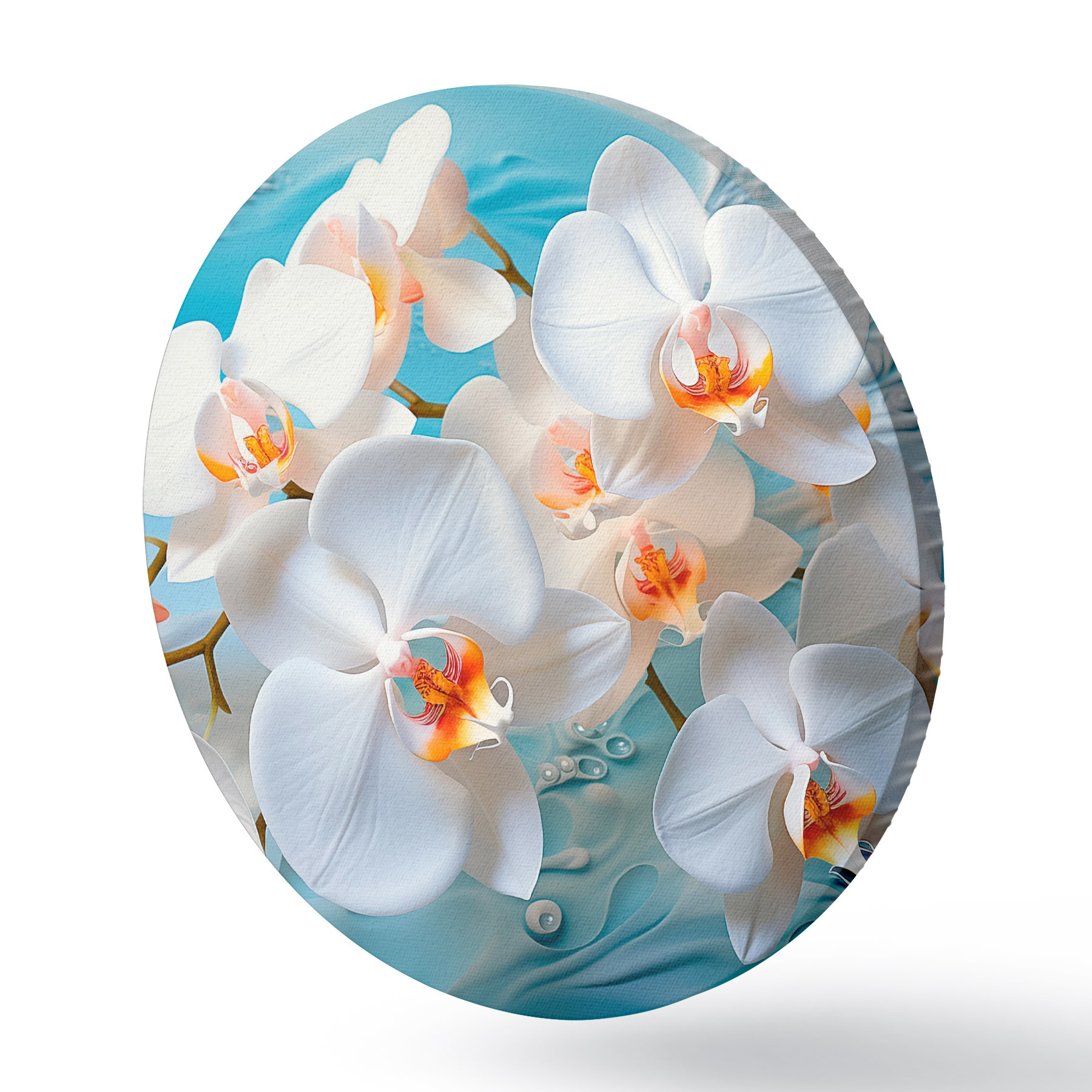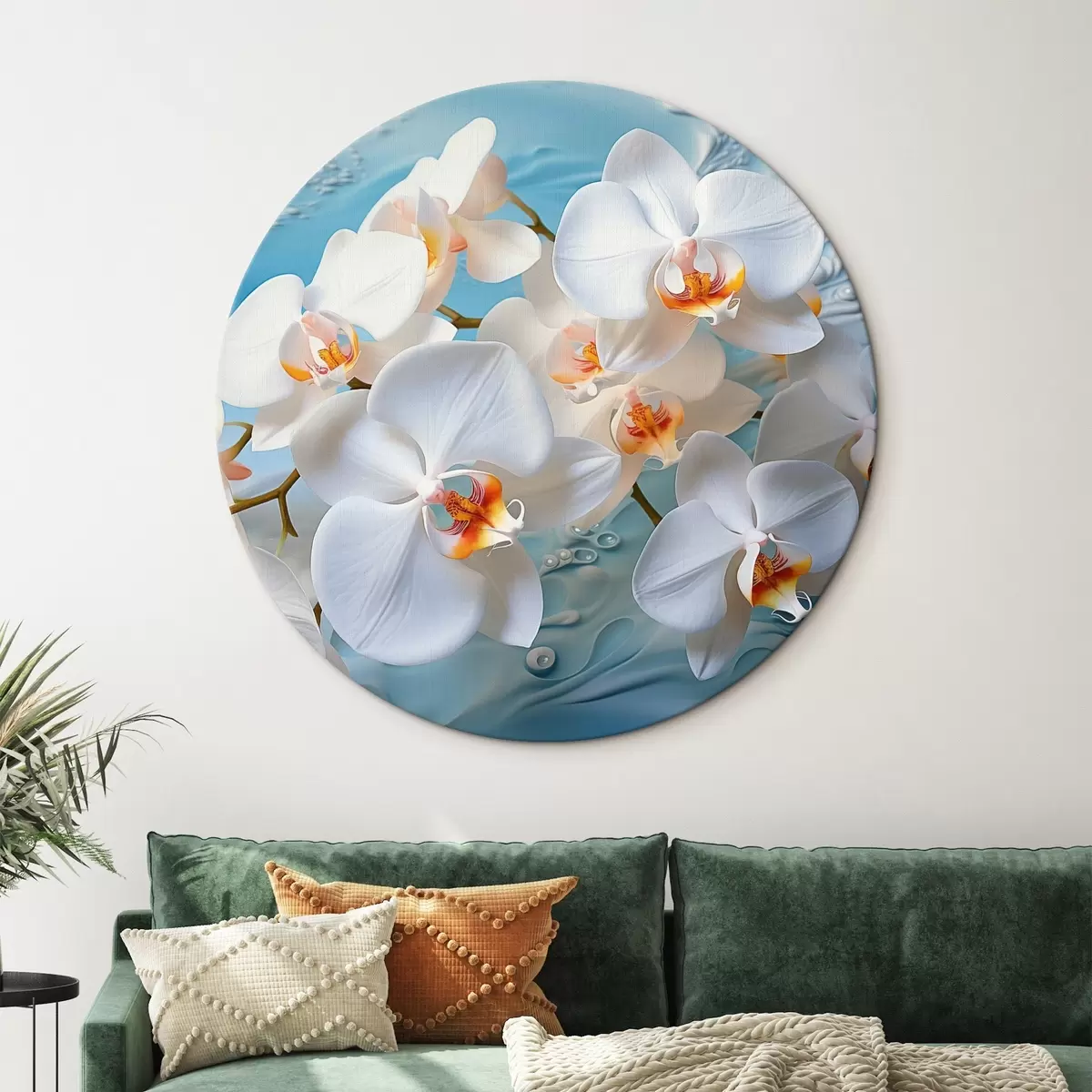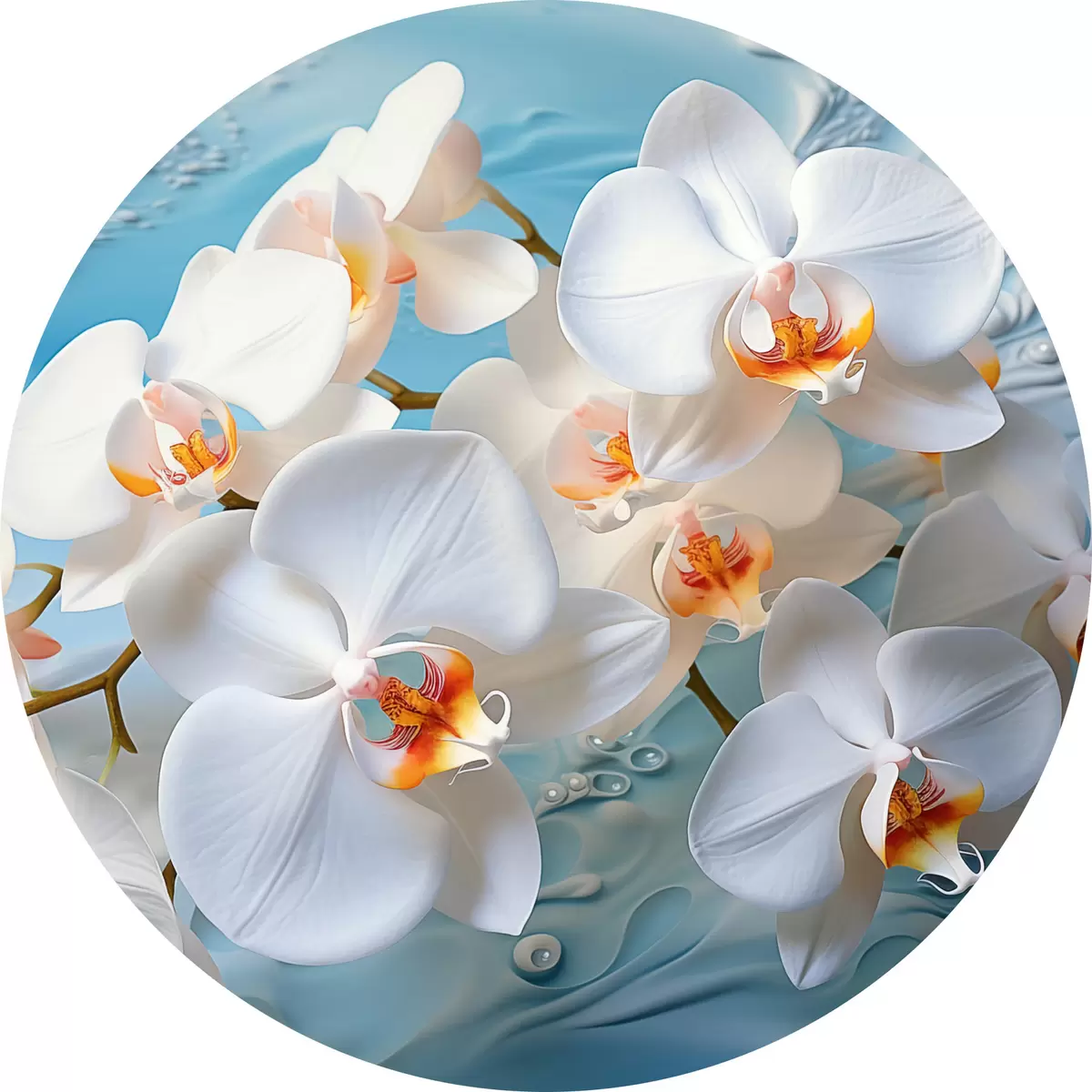 Tableaux ronds Orchidées blanches, disposées sur une surface bleu clair avec des gouttelettes d'eau, éclairage doux r44401