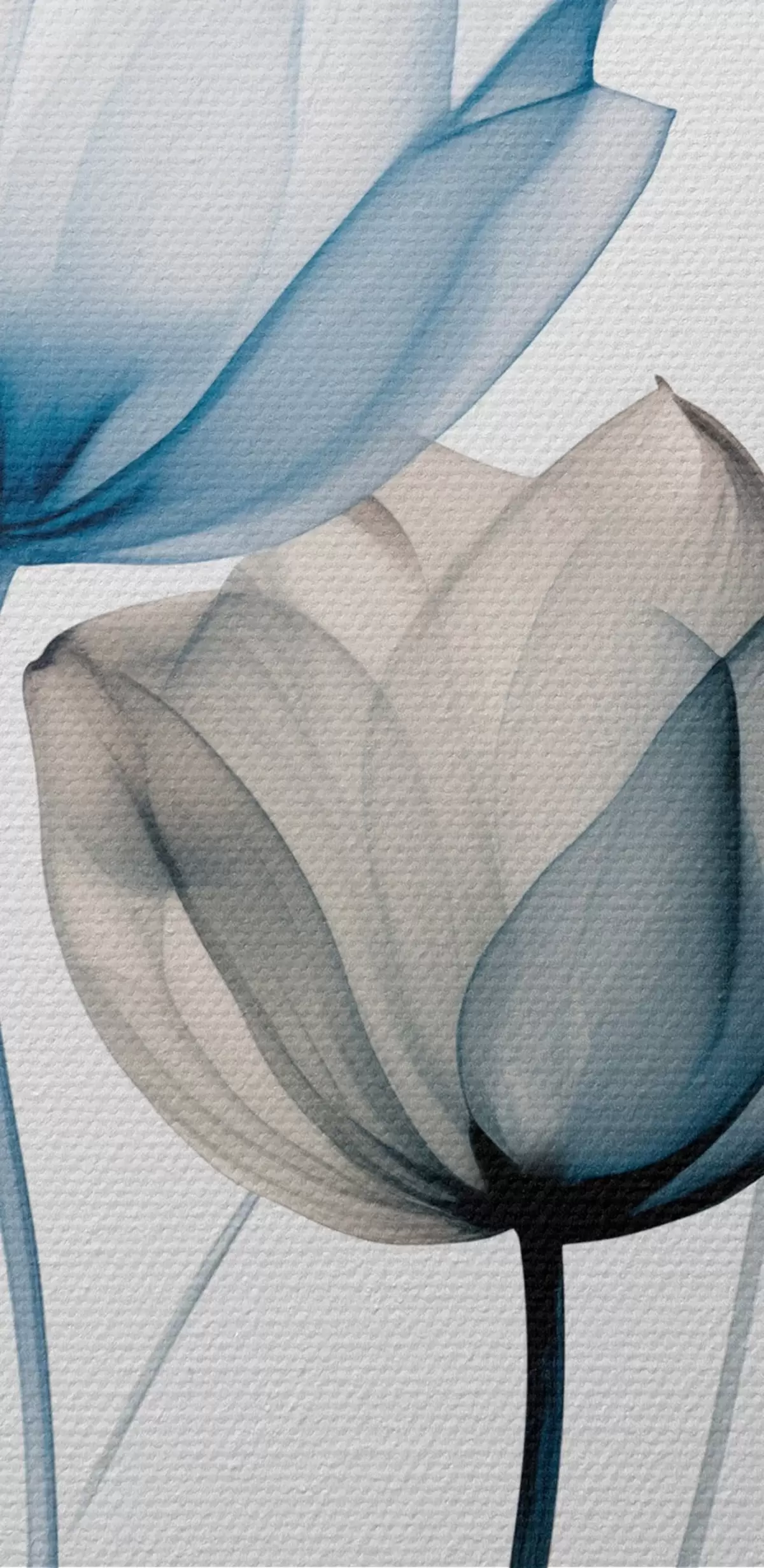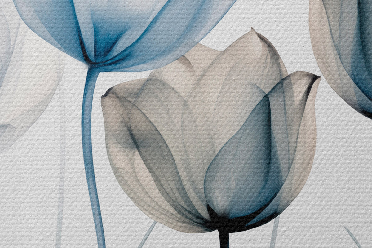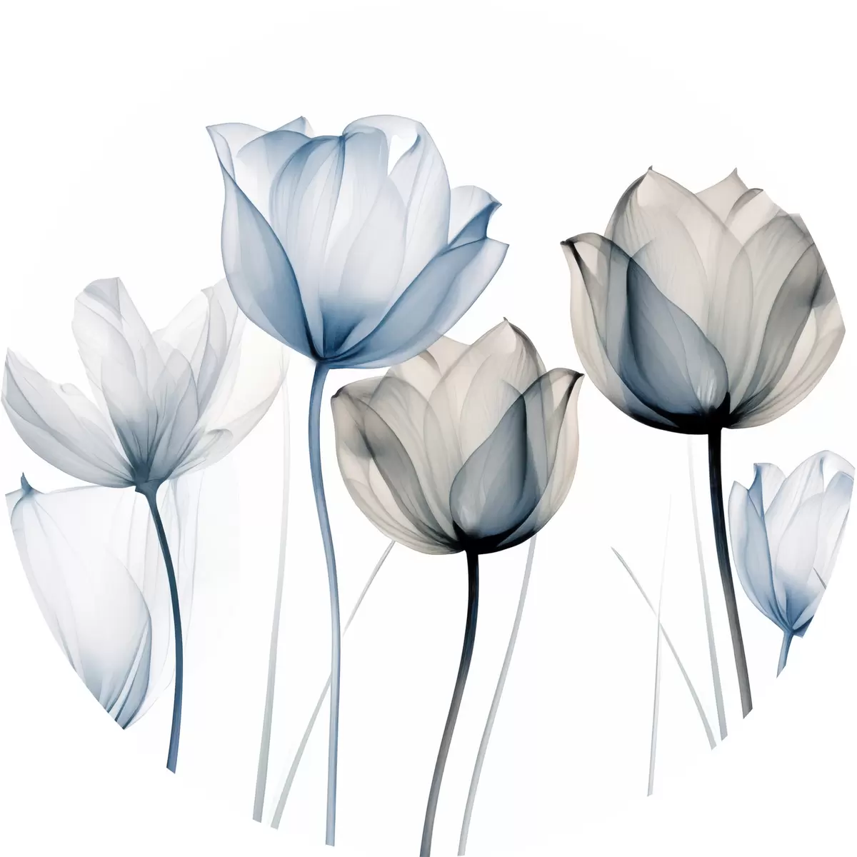 Image Tulipes bleues et blanches translucides à longues tiges, sur fond blanc uni Nr r44409