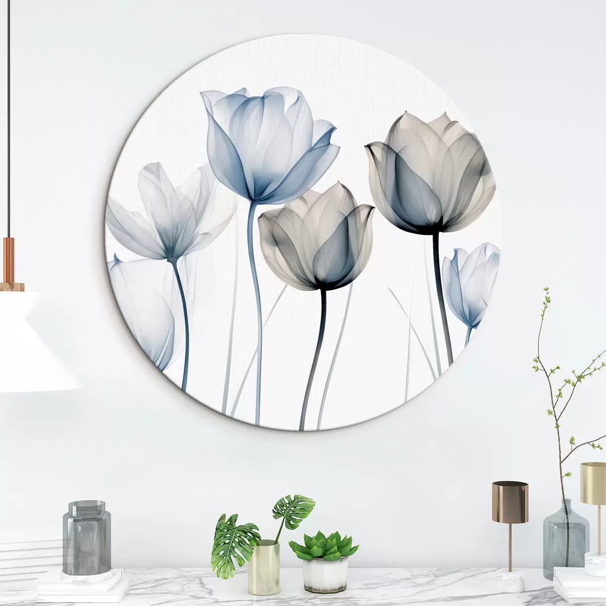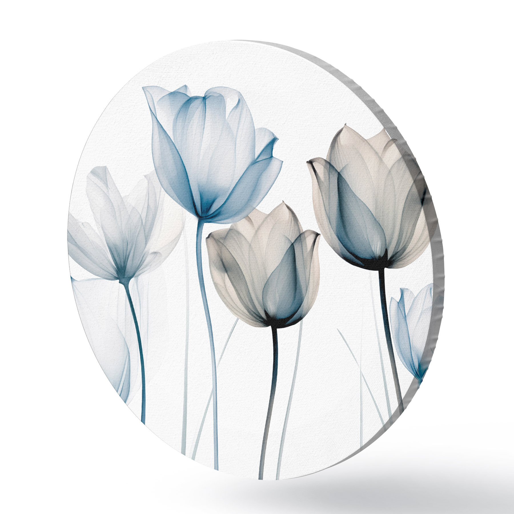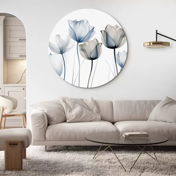 Tableaux ronds Tulipes bleues et blanches translucides à longues tiges, sur fond blanc uni r44409