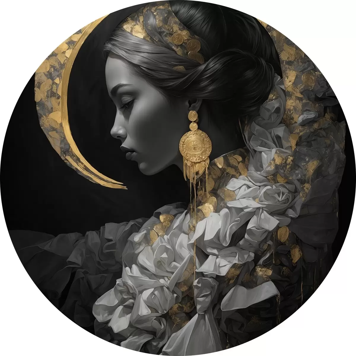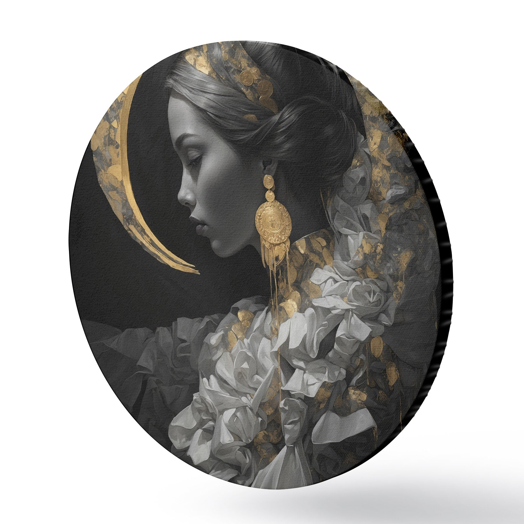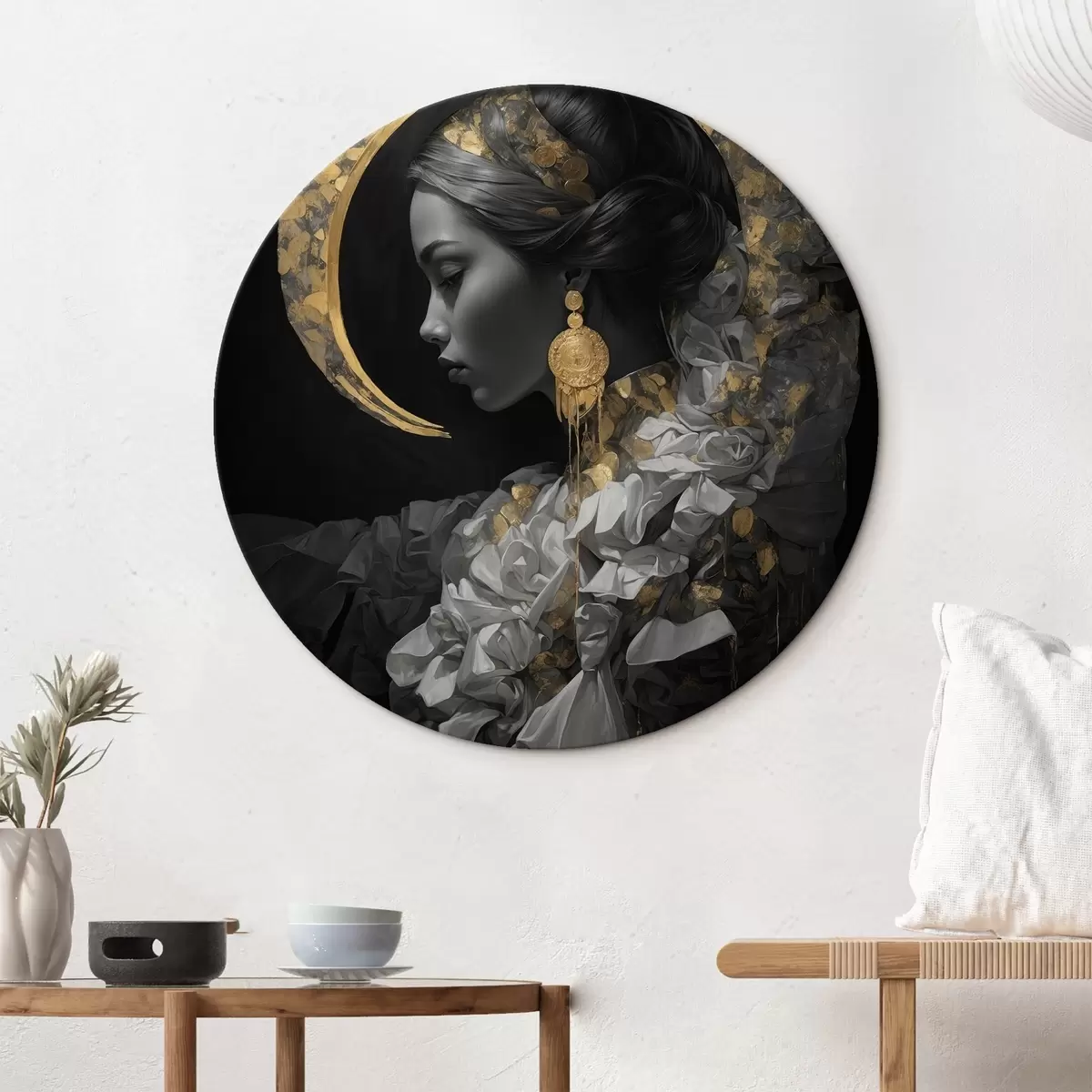 Tableaux ronds Fille et croissant de lune jaune sur fond noir r44449