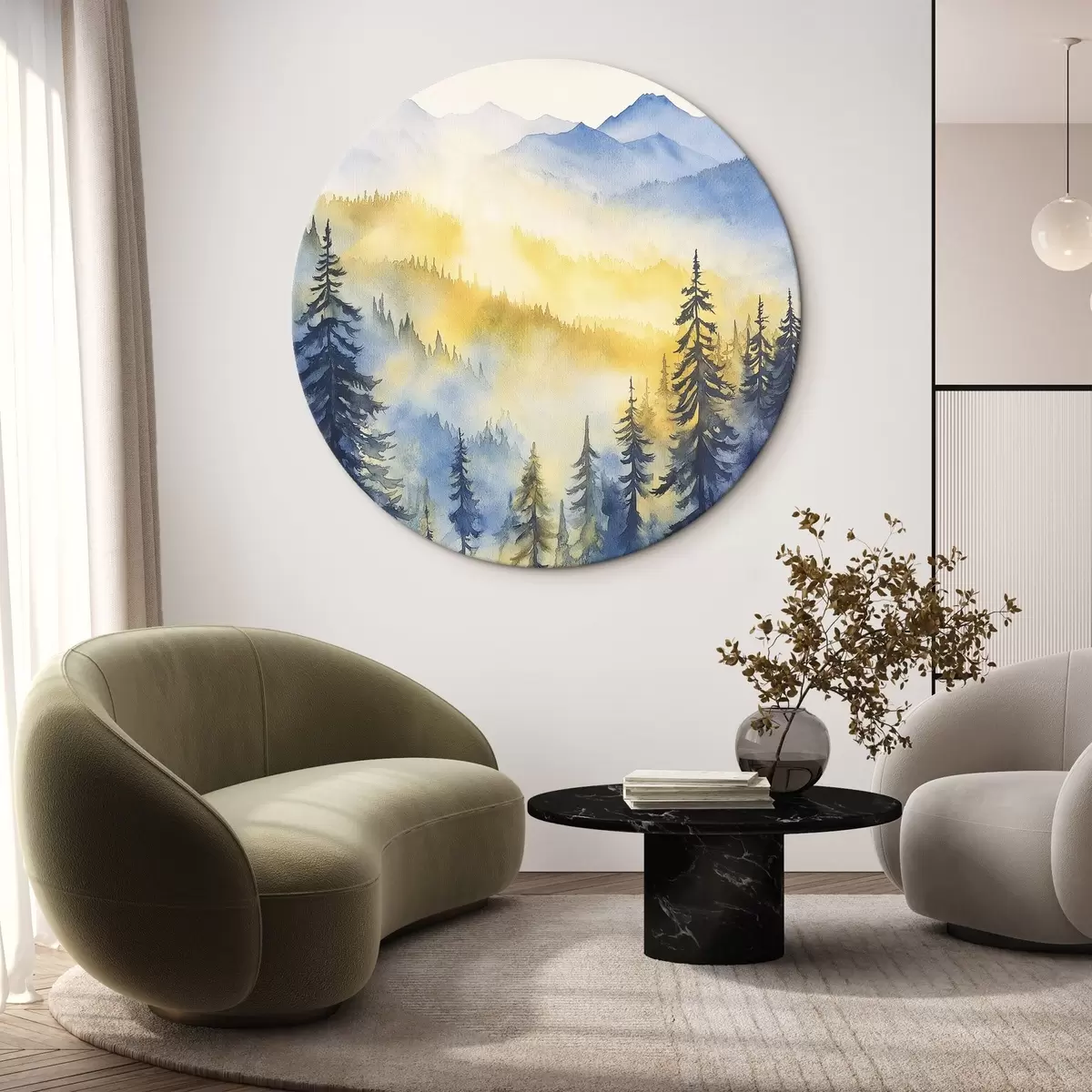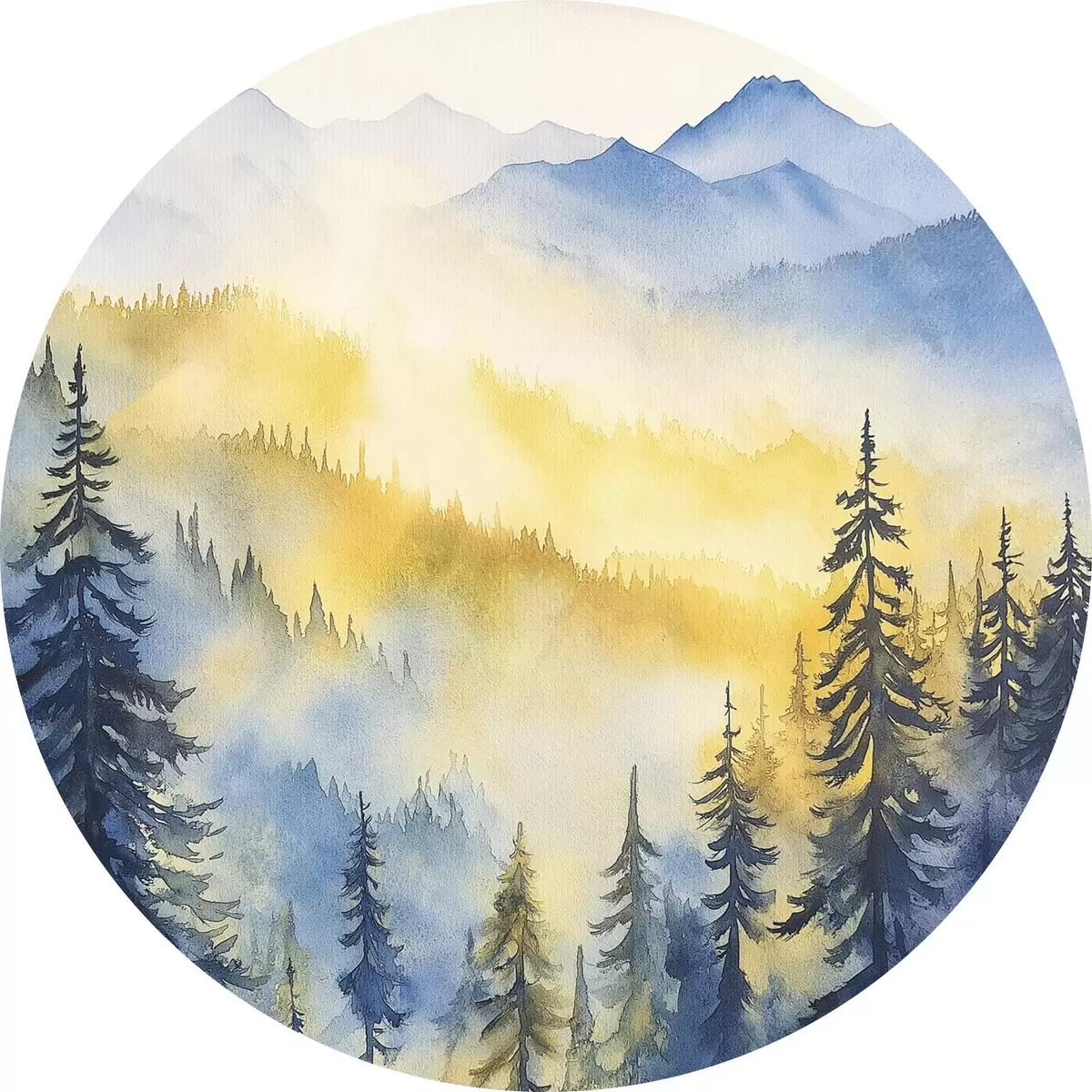 Tableaux ronds Montagnes brumeuses au lever du soleil, forêts de pins, couleurs bleues et jaunes r44602