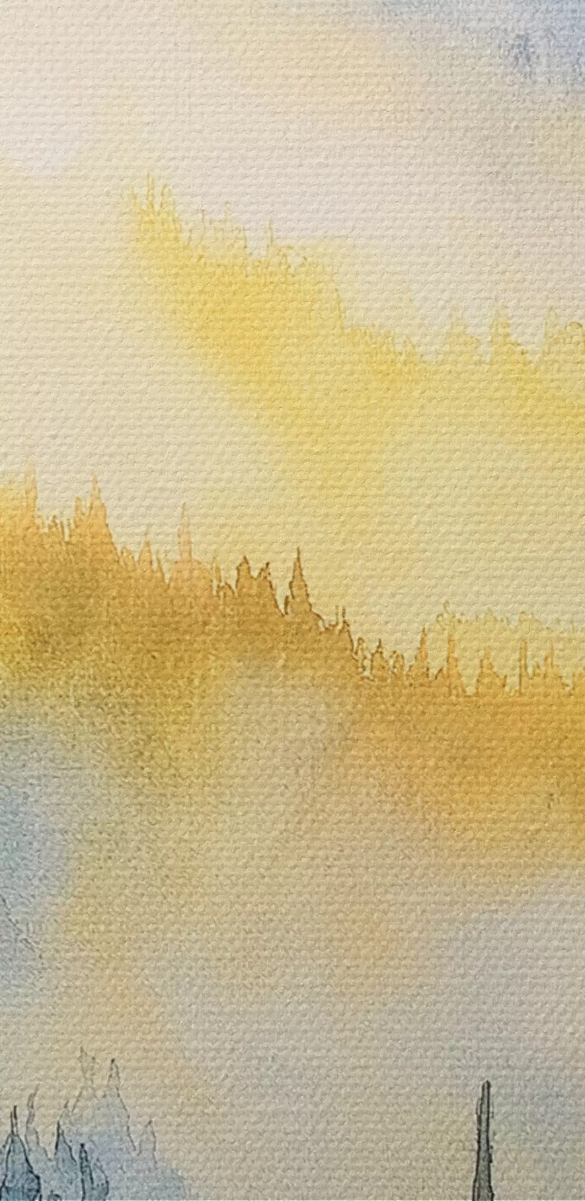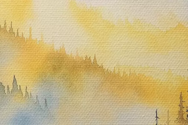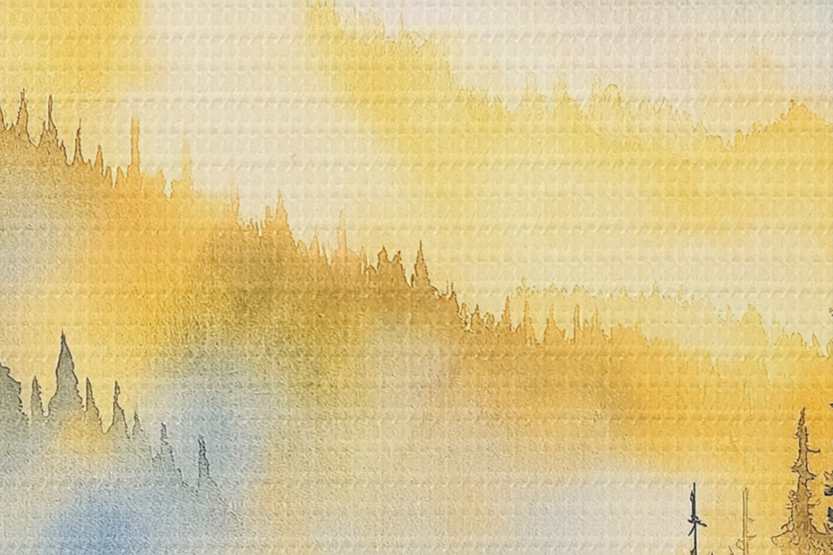 Image Montagnes brumeuses au lever du soleil, forêts de pins, couleurs bleues et jaunes Nr r44602