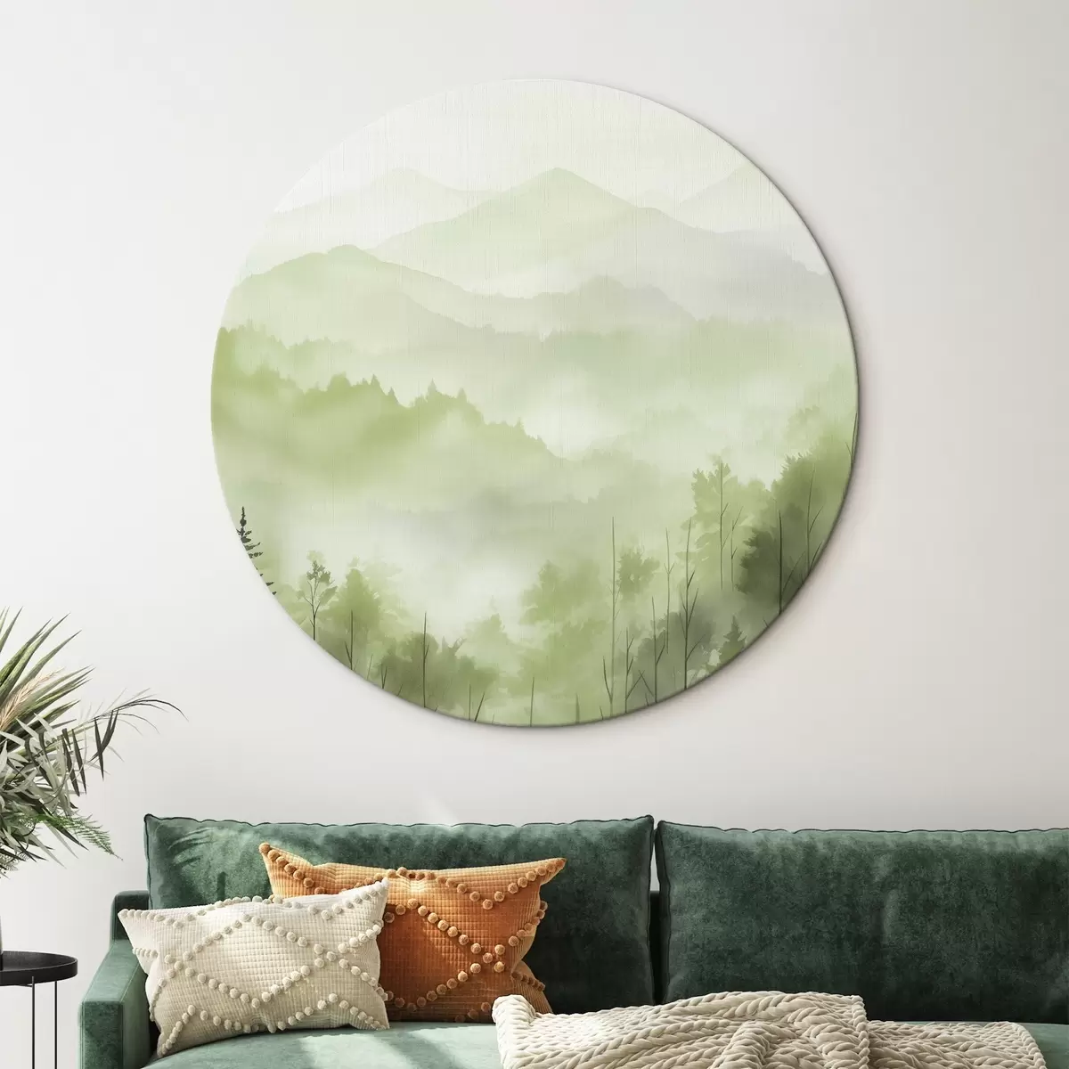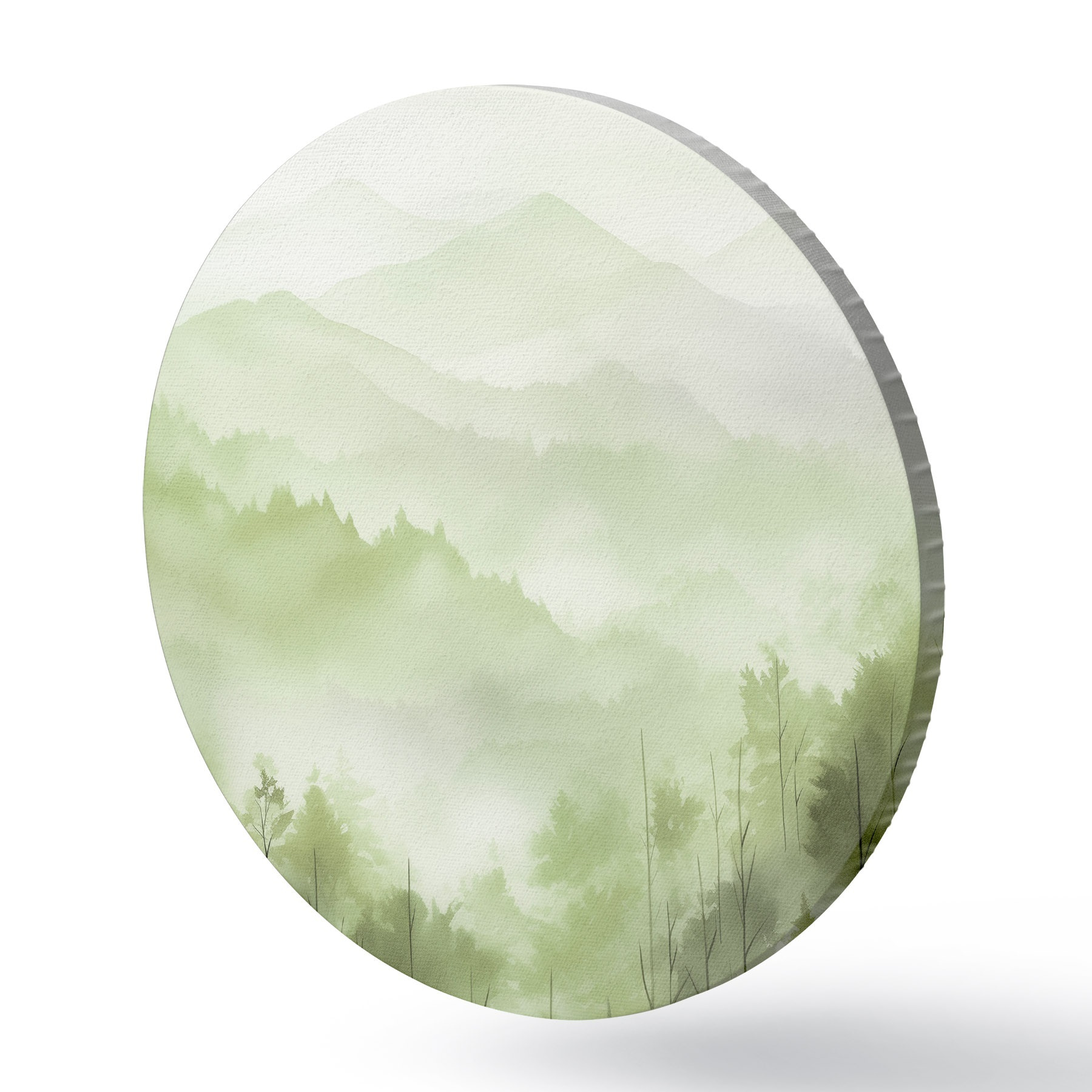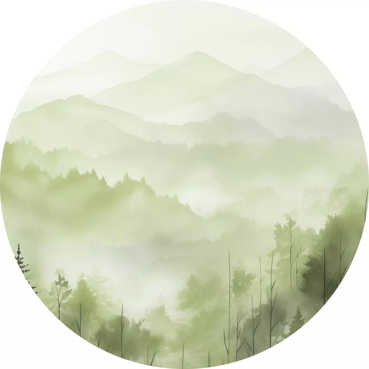 Tableaux ronds Montagnes avec paysage forestier, couleurs vertes, style aquarelle r44606
