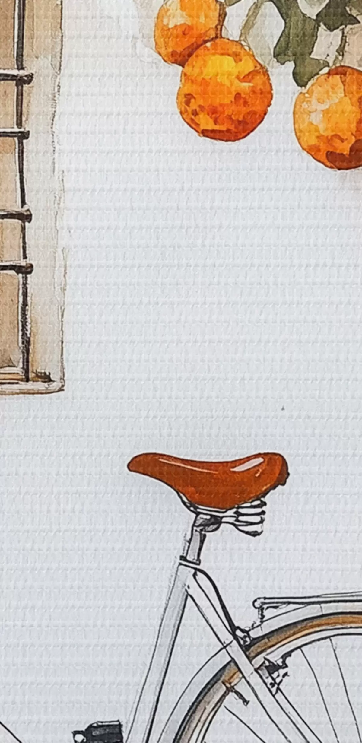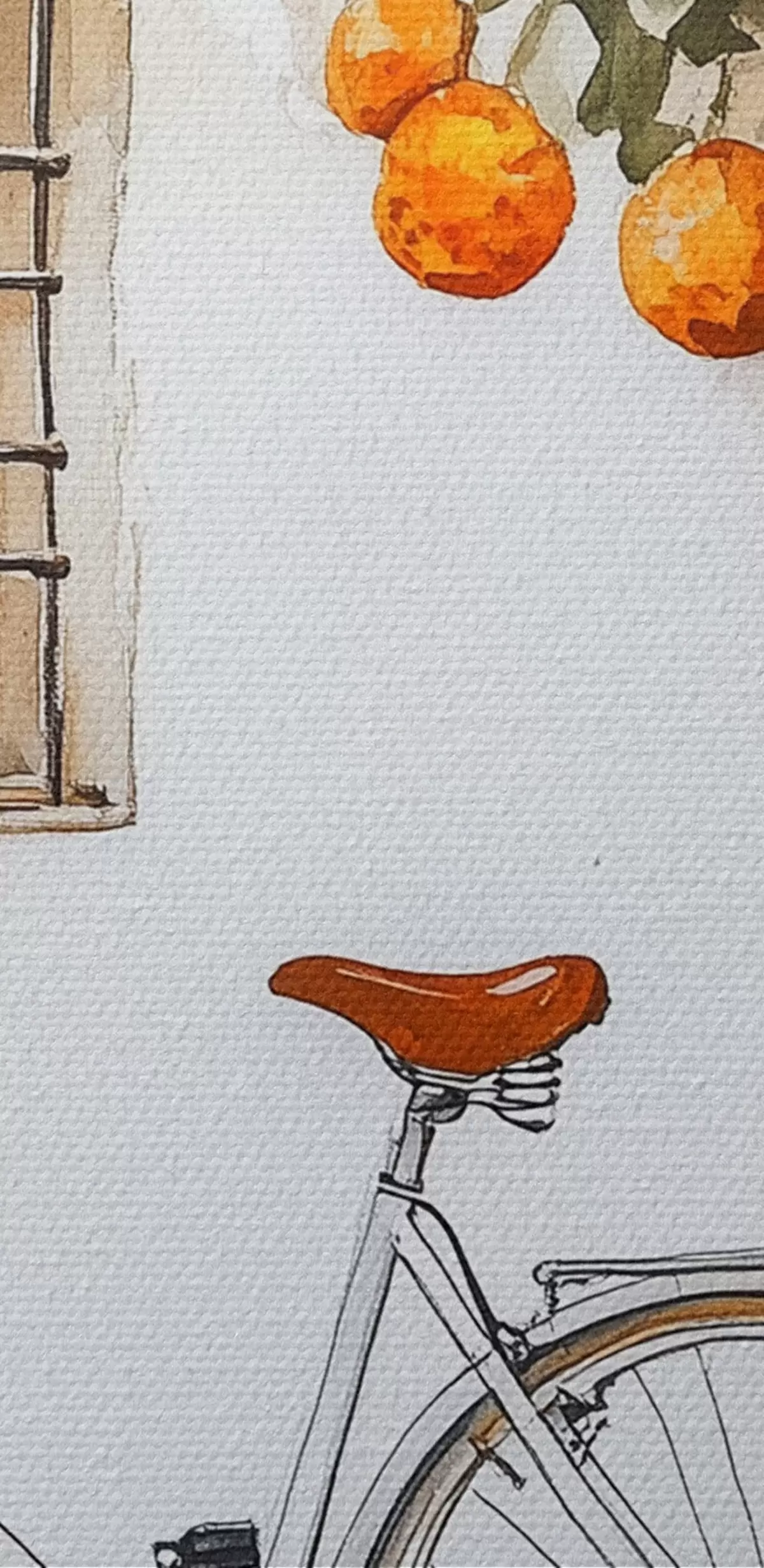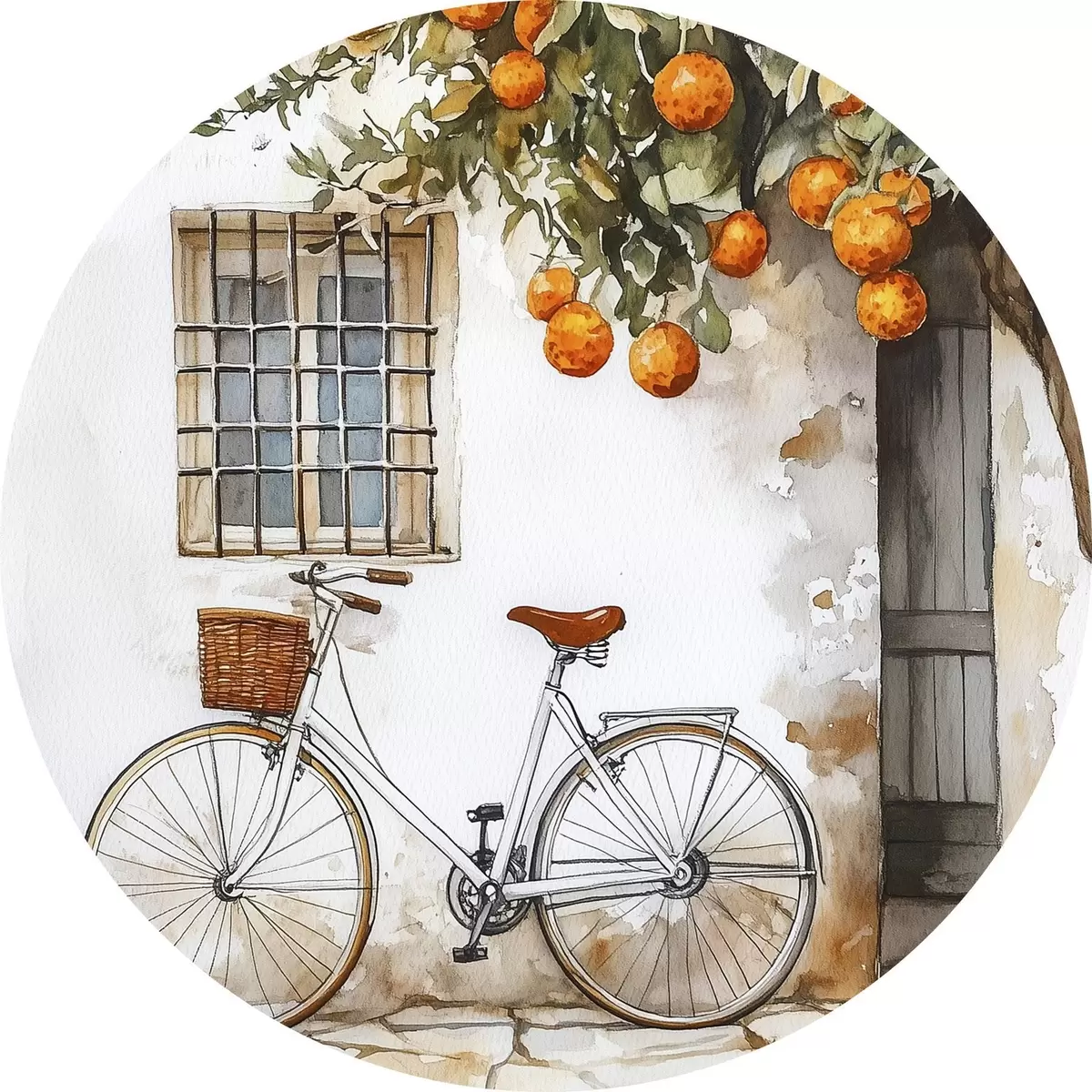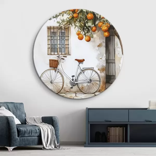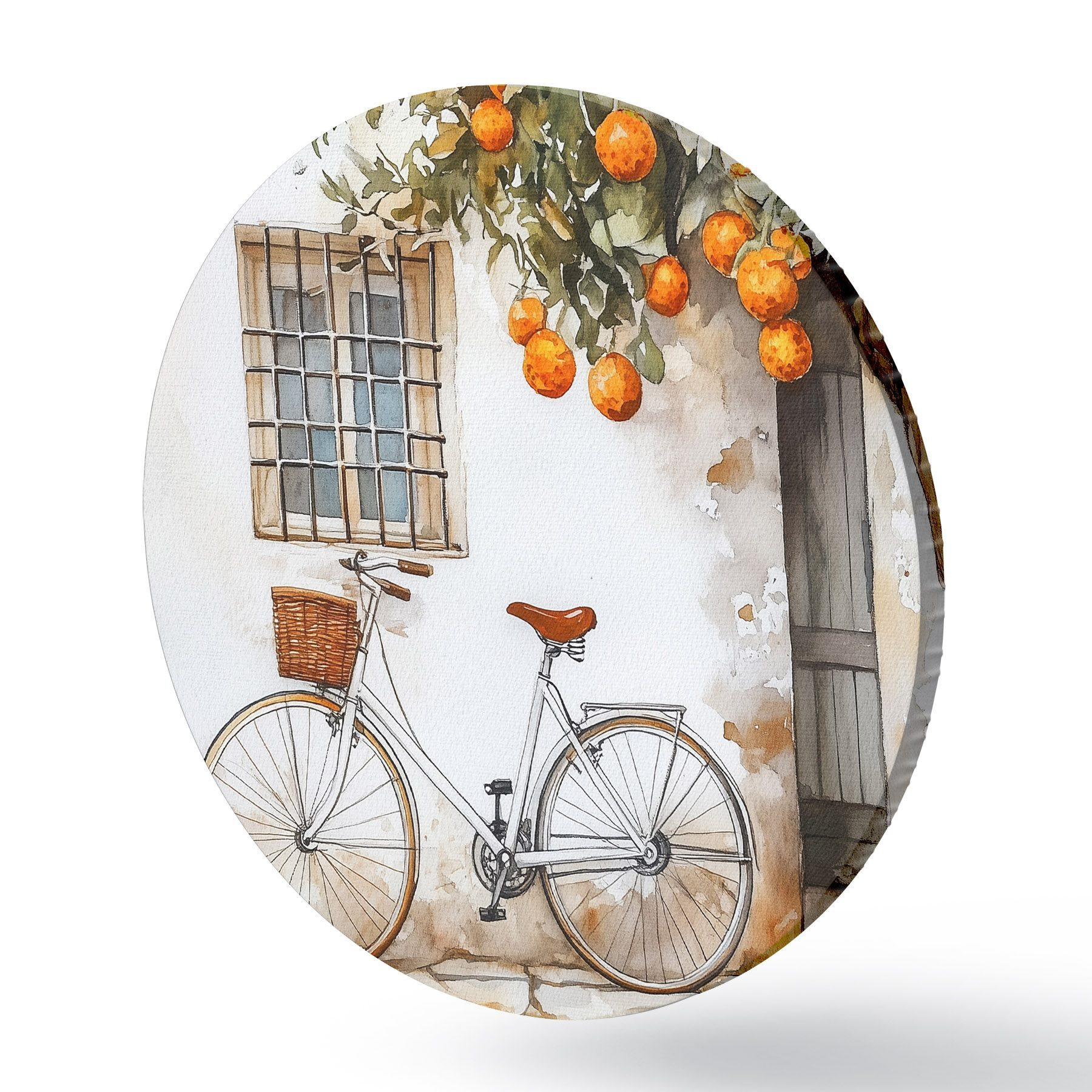 Tableaux ronds Maison blanche méditerranéenne avec oranger et bicyclette r44610