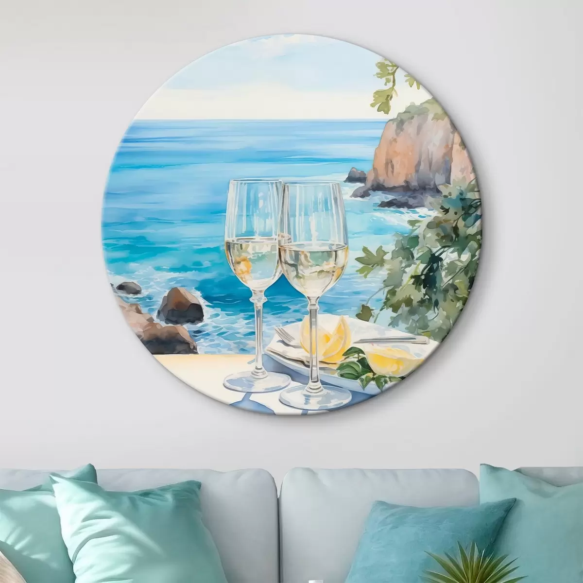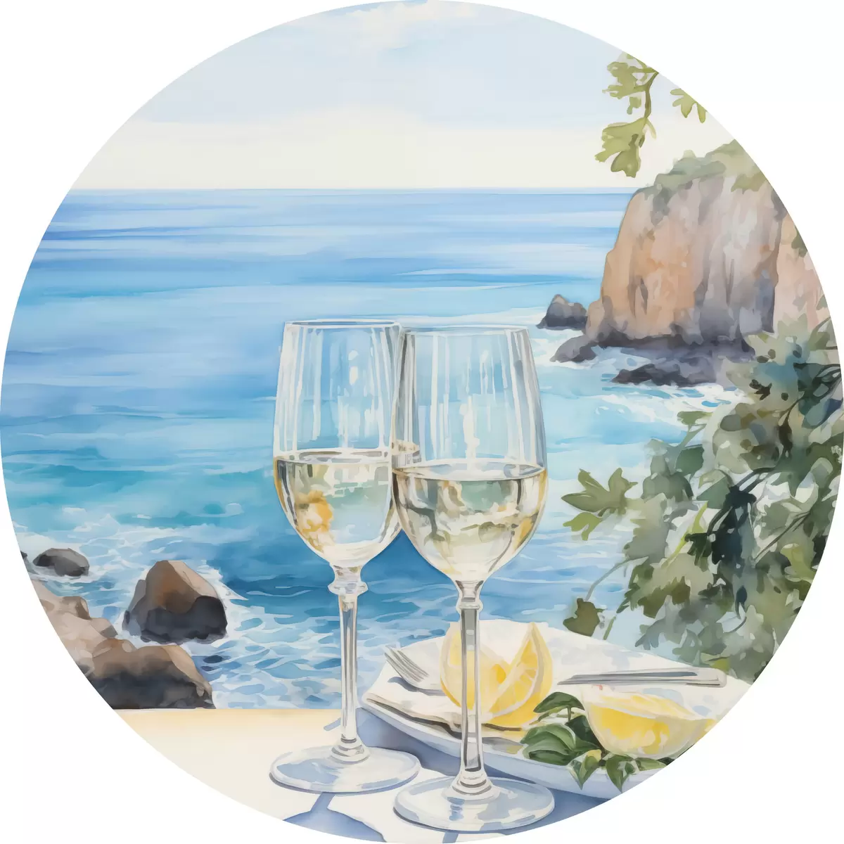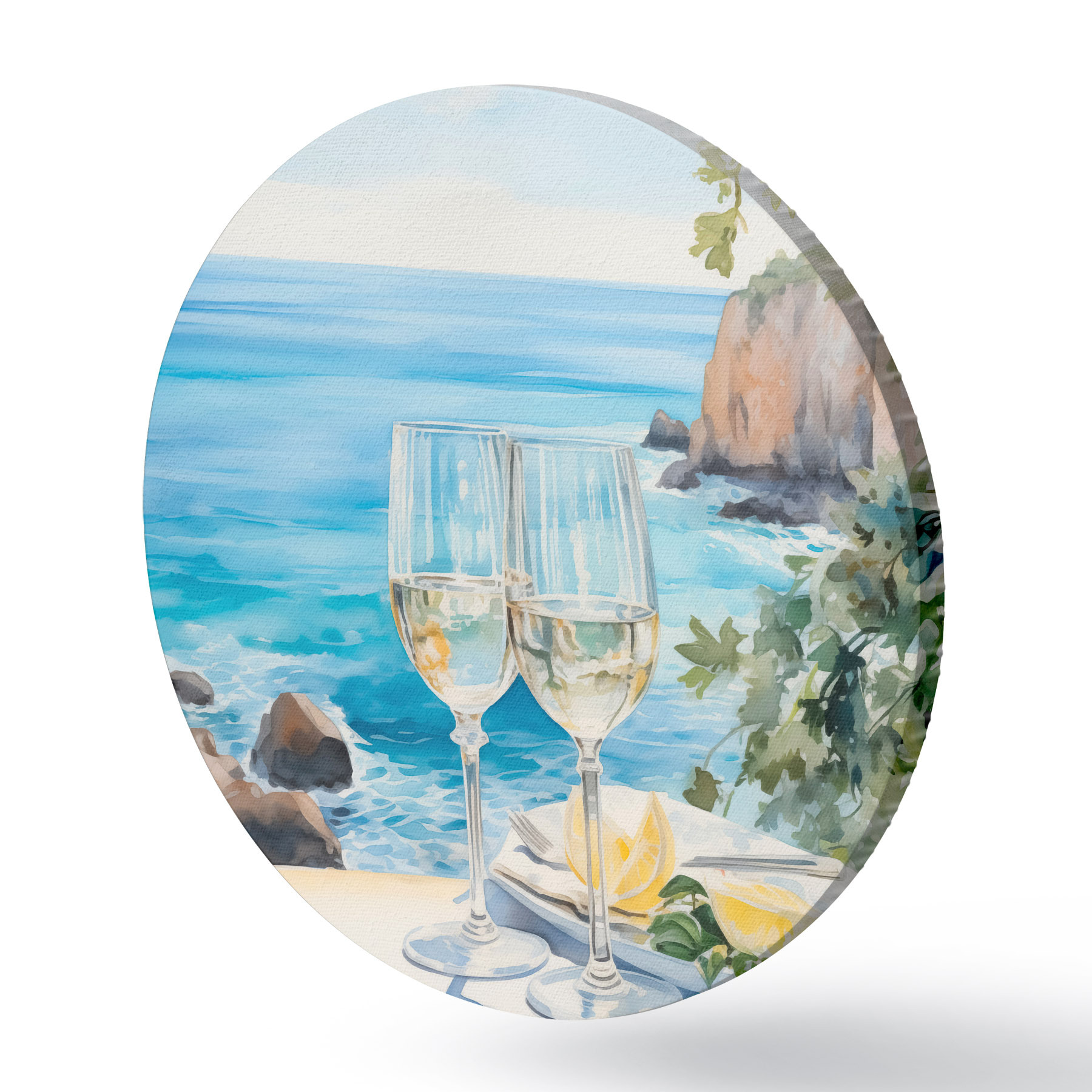 Tableaux ronds Verres de vin contre la mer r44644