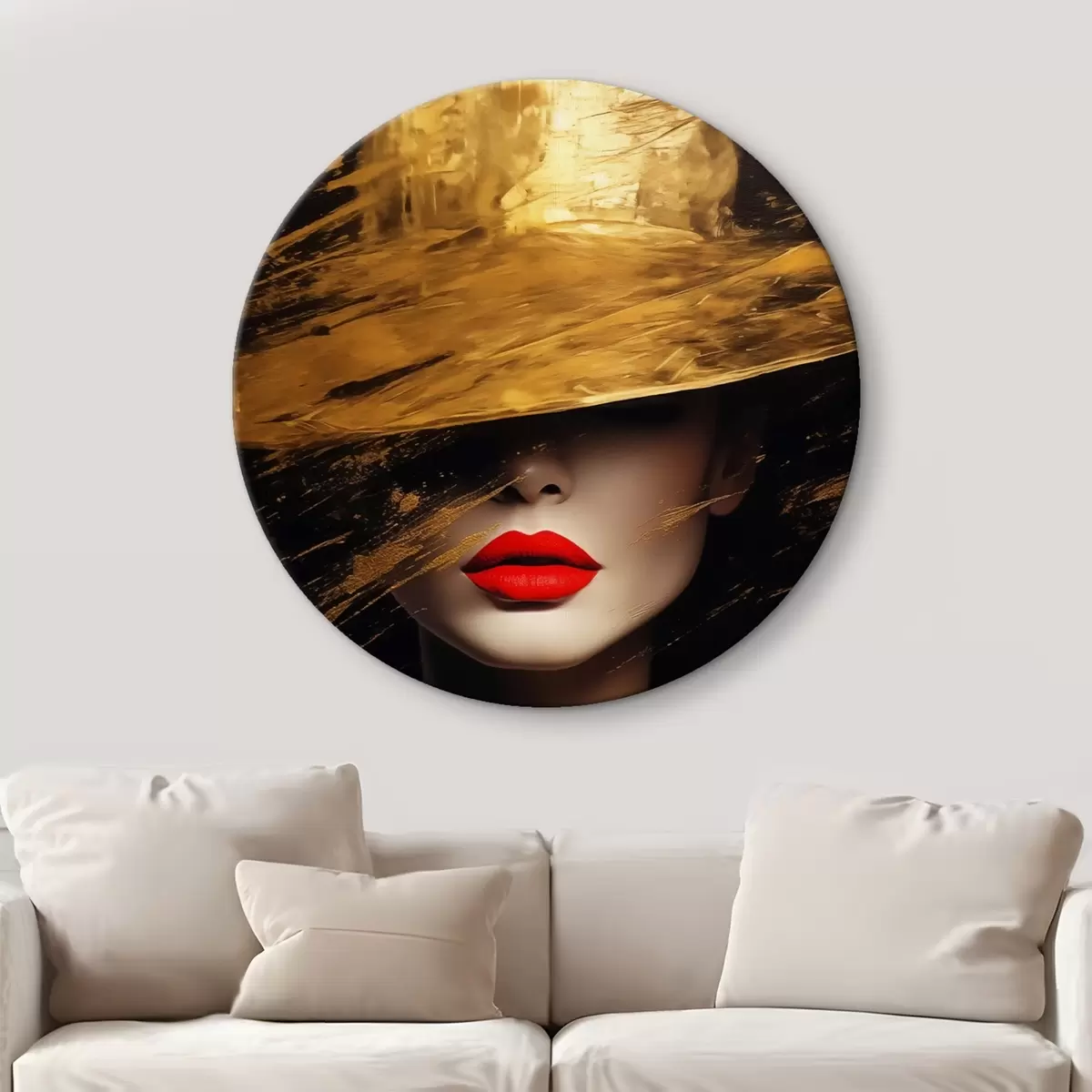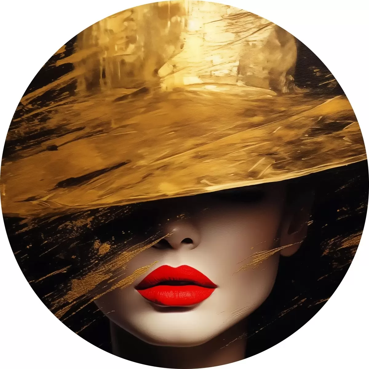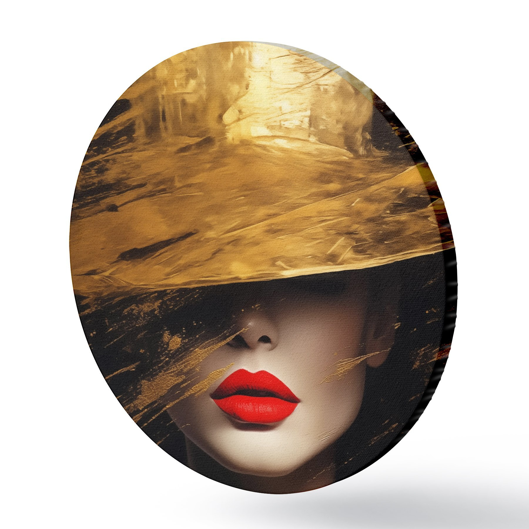Tableaux ronds Visage féminin avec rouge à lèvres rouge sous un chapeau large r44691