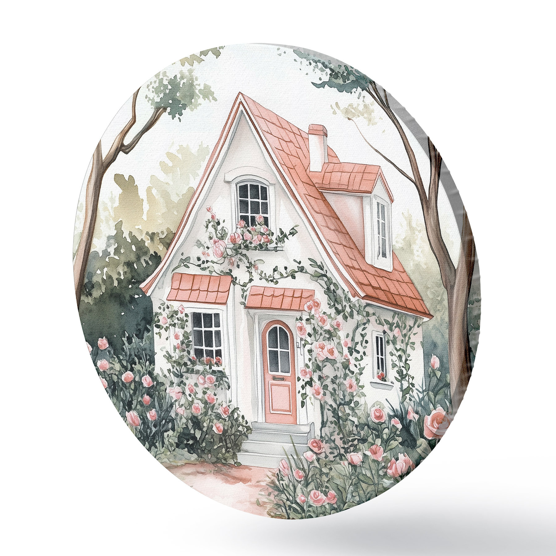 Tableaux ronds Maison blanche avec jardin de roses dans les bois r44716