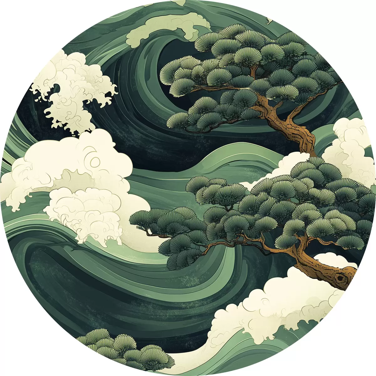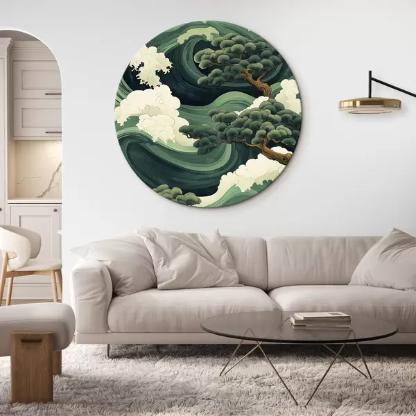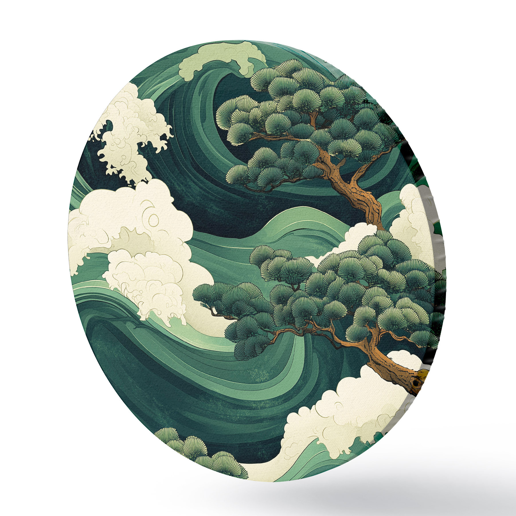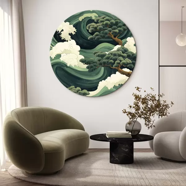 Tableaux ronds Dessin de style chinois avec des vagues et des pins r44719
