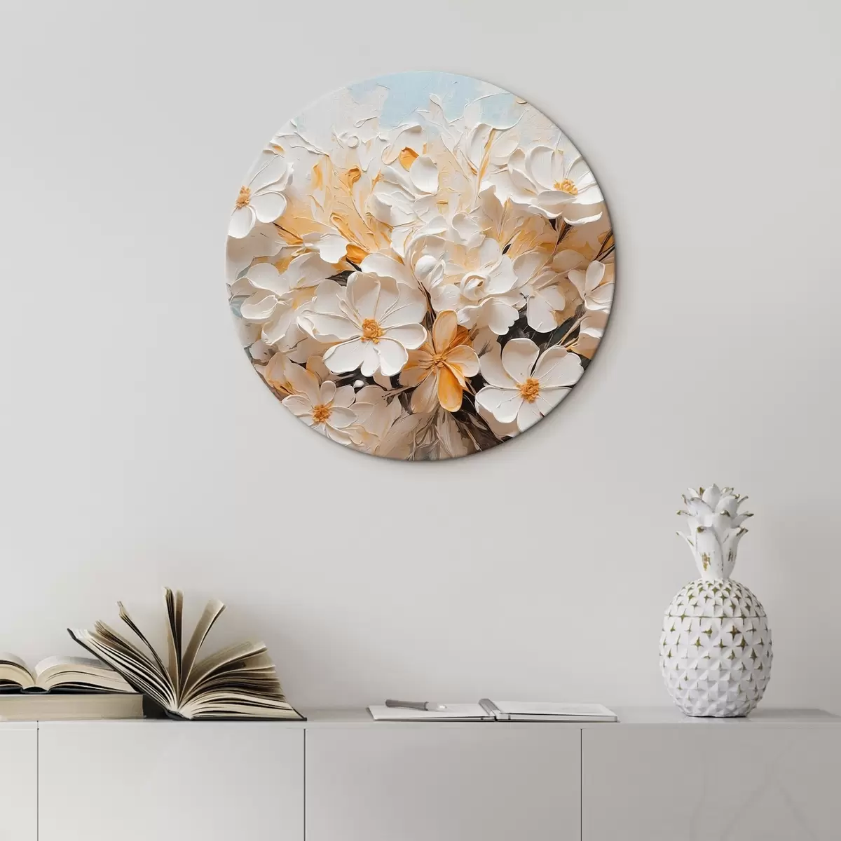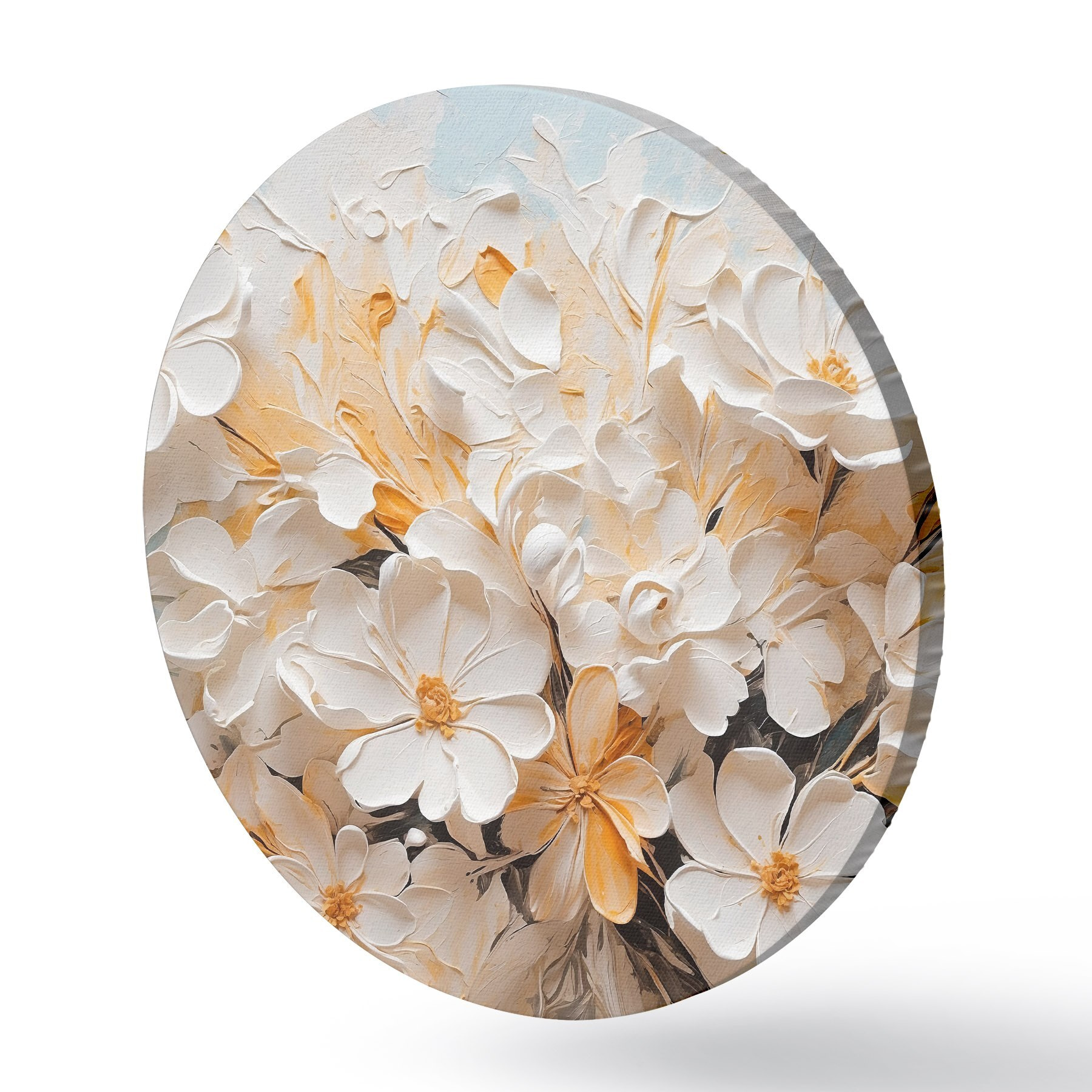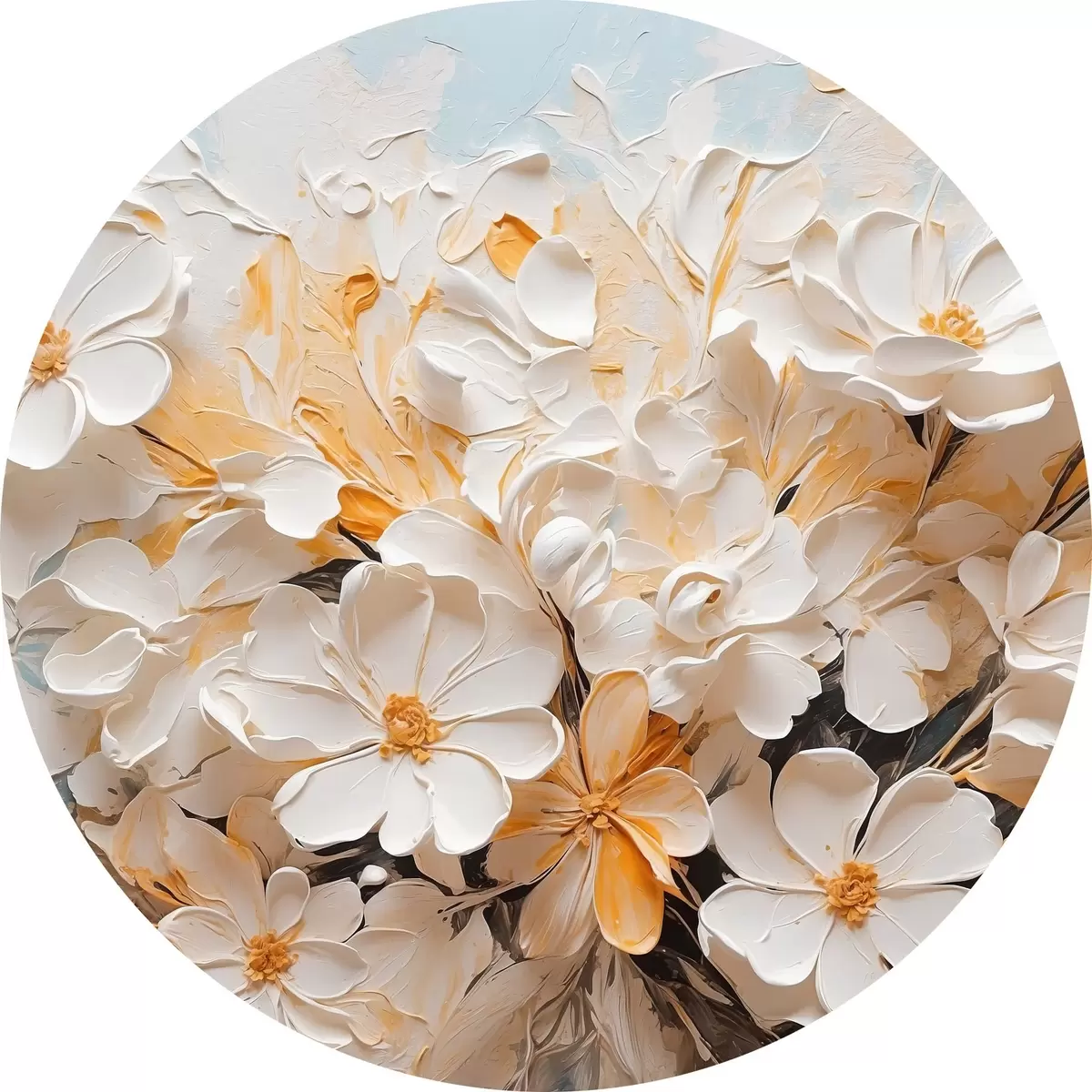 Tableaux ronds Fleurs blanches et pêche sur fond bleu avec des pastels r44879