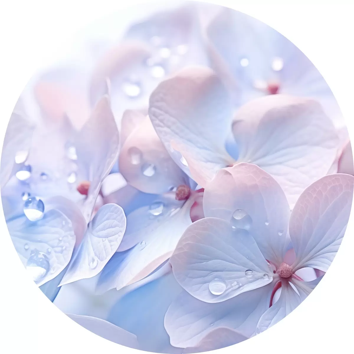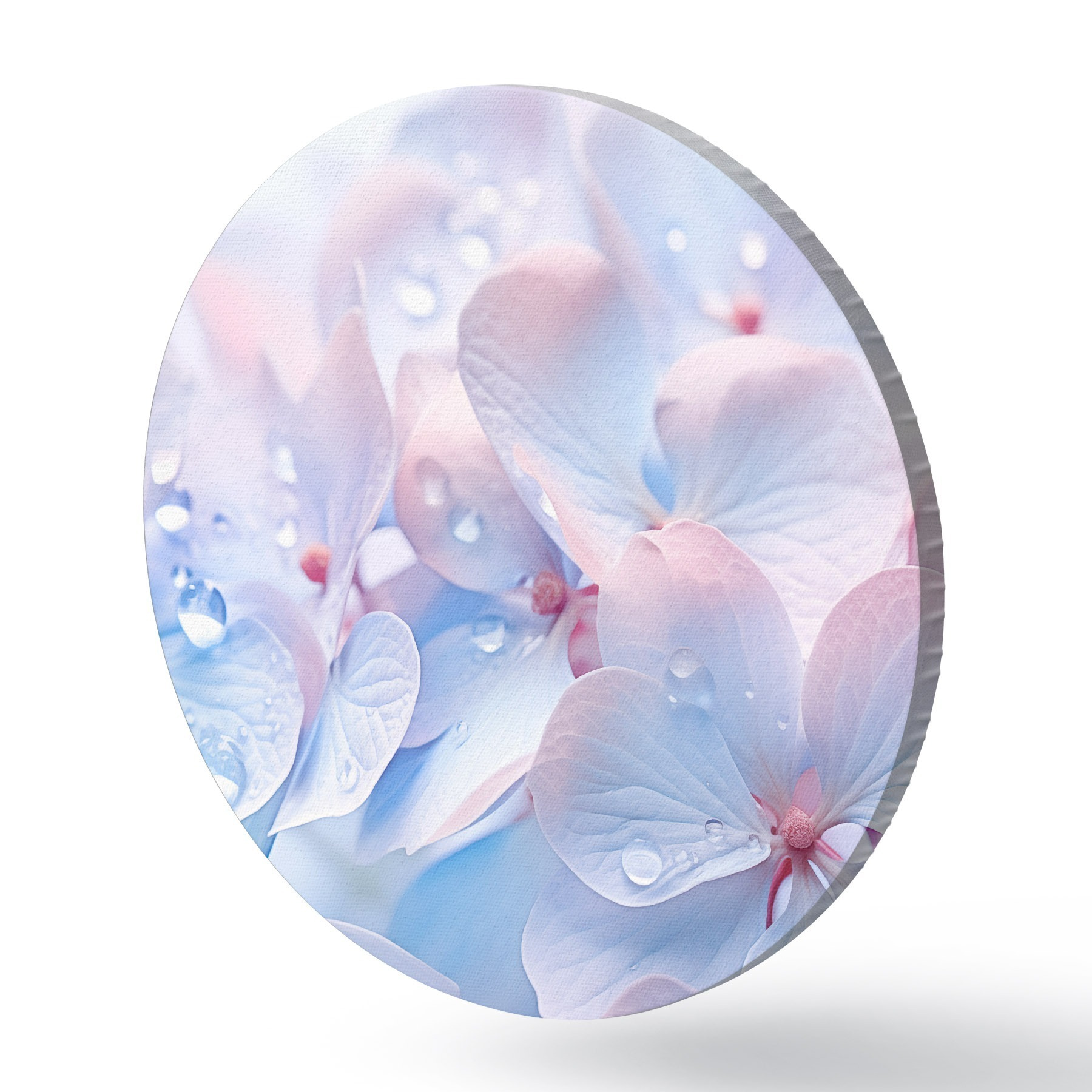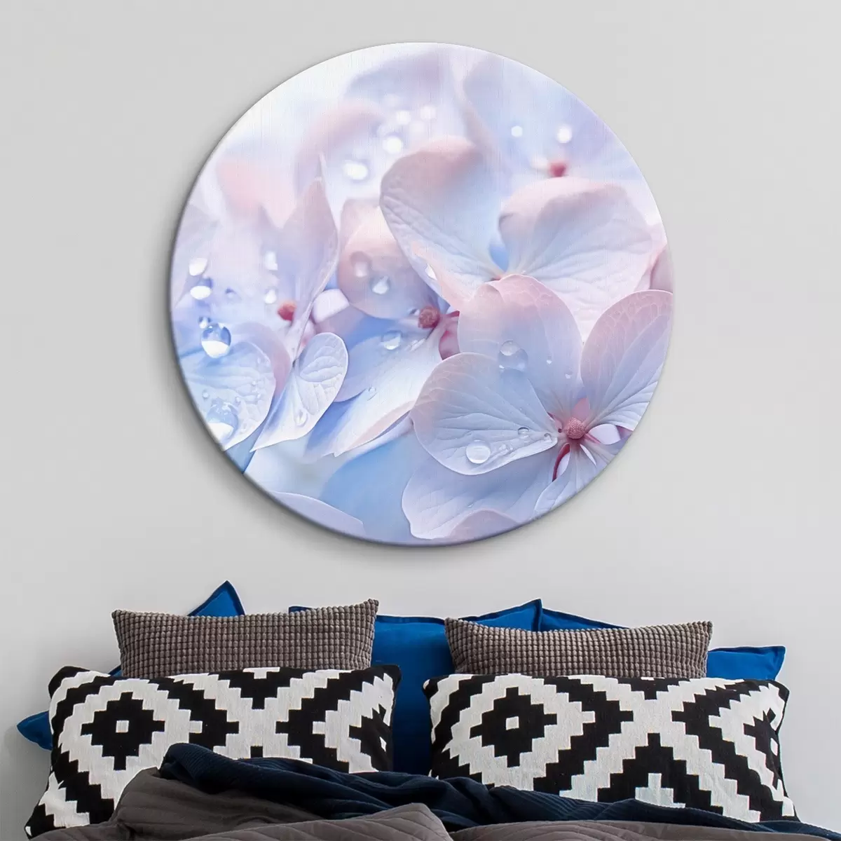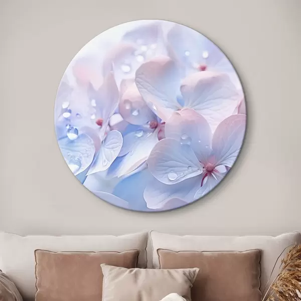 Tableaux ronds Fleurs d'hortensia avec des gouttes d'eau sur les pétales délicats, couleurs pastel douces, tons bleu clair et rose r44929