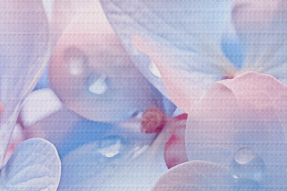 Image Fleurs d'hortensia avec des gouttes d'eau sur les pétales délicats, couleurs pastel douces, tons bleu clair et rose Nr r44929