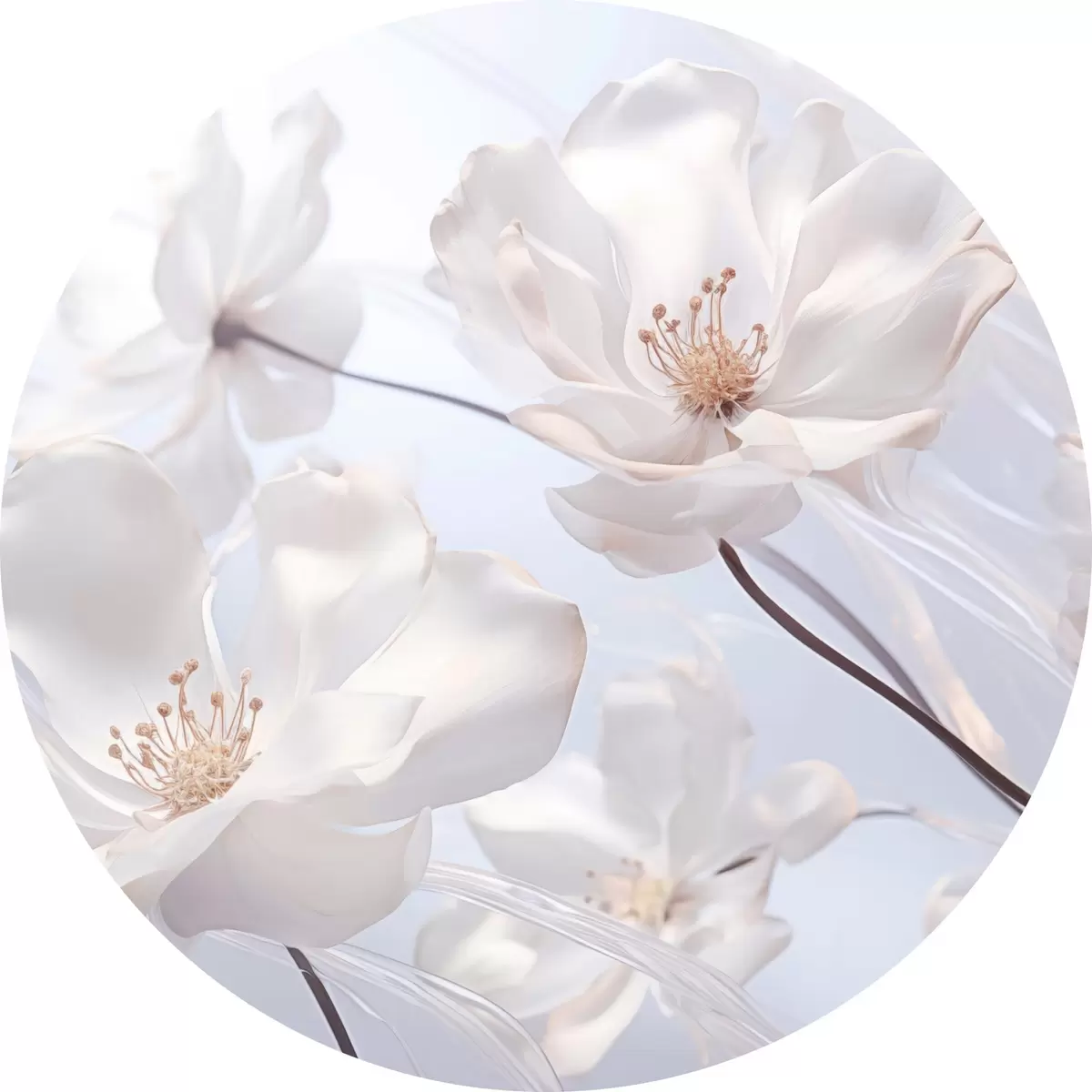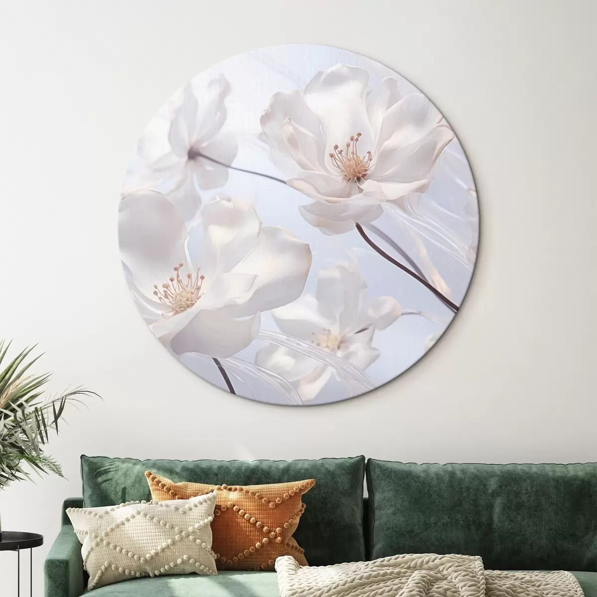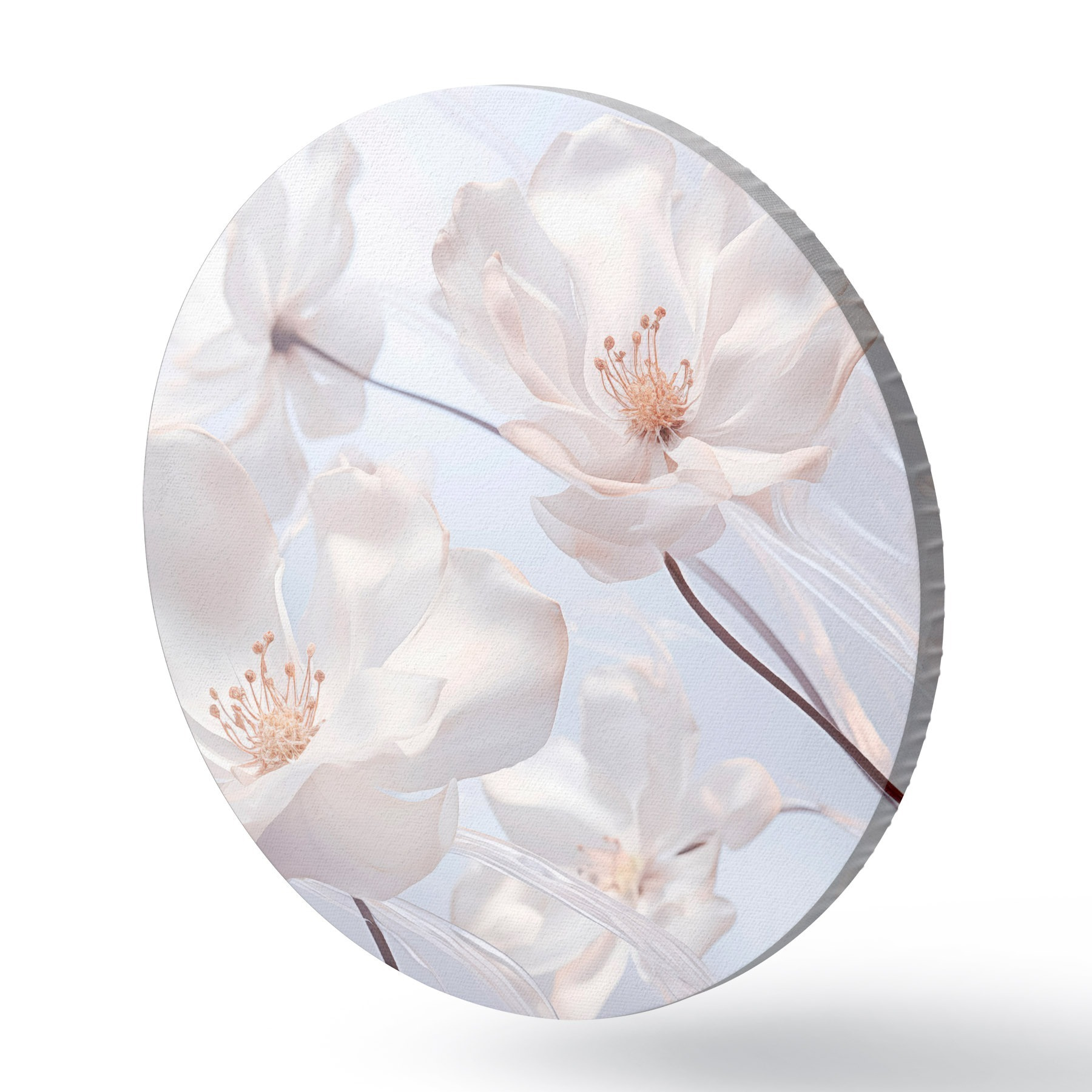Tableaux ronds Fleurs blanches aux pétales translucides, fond bleu clair doux, élégant, romantique, délicat, rêveur r44931