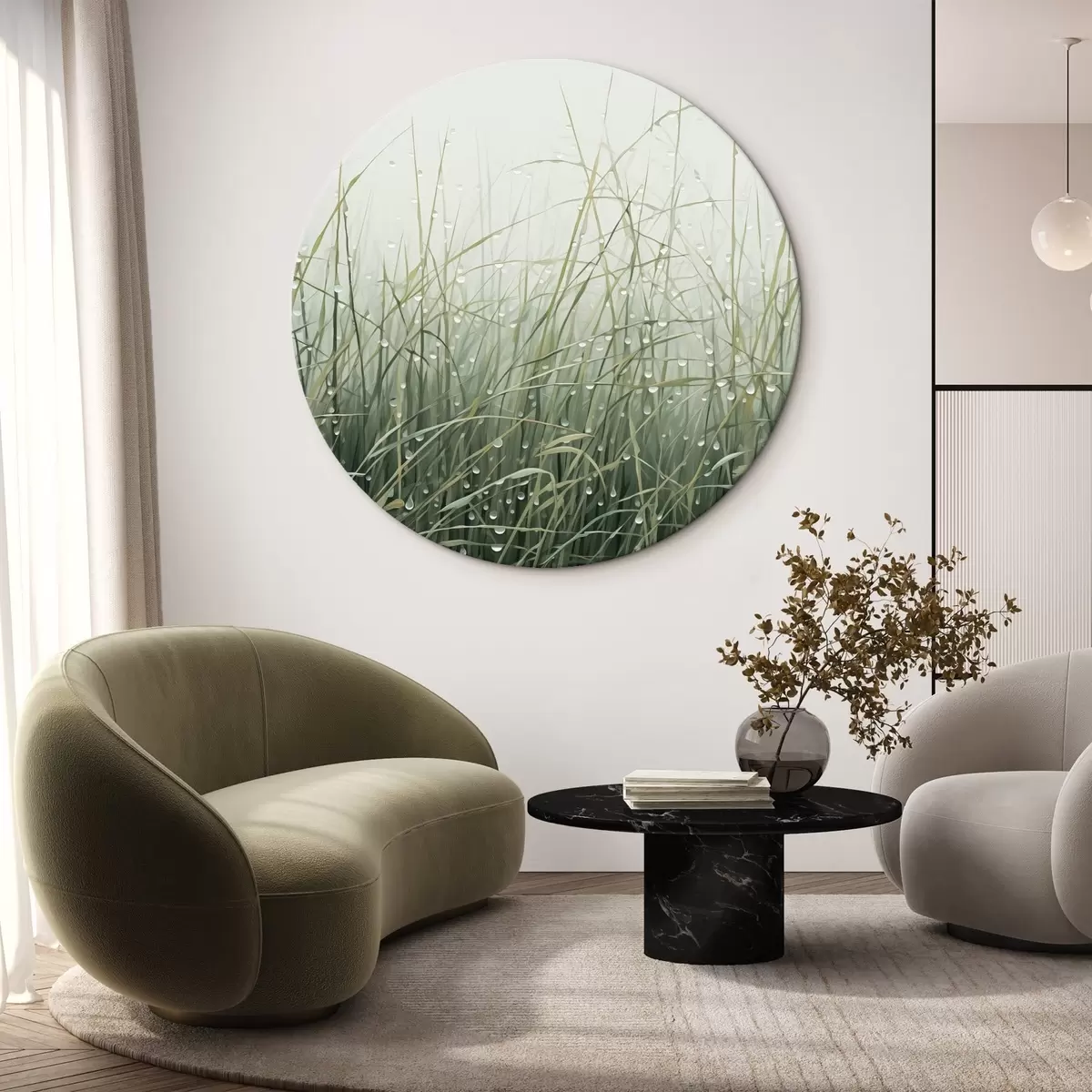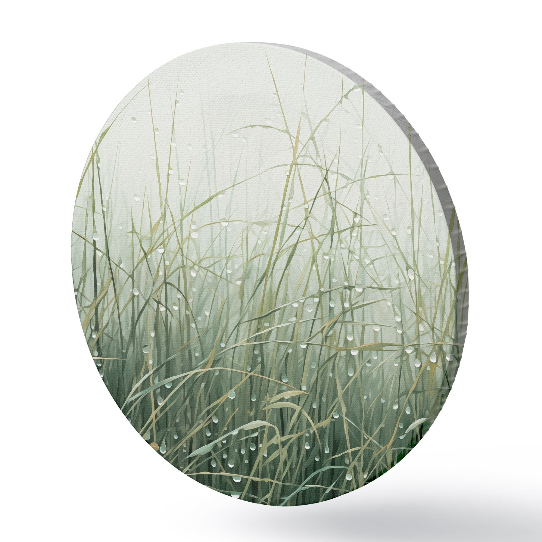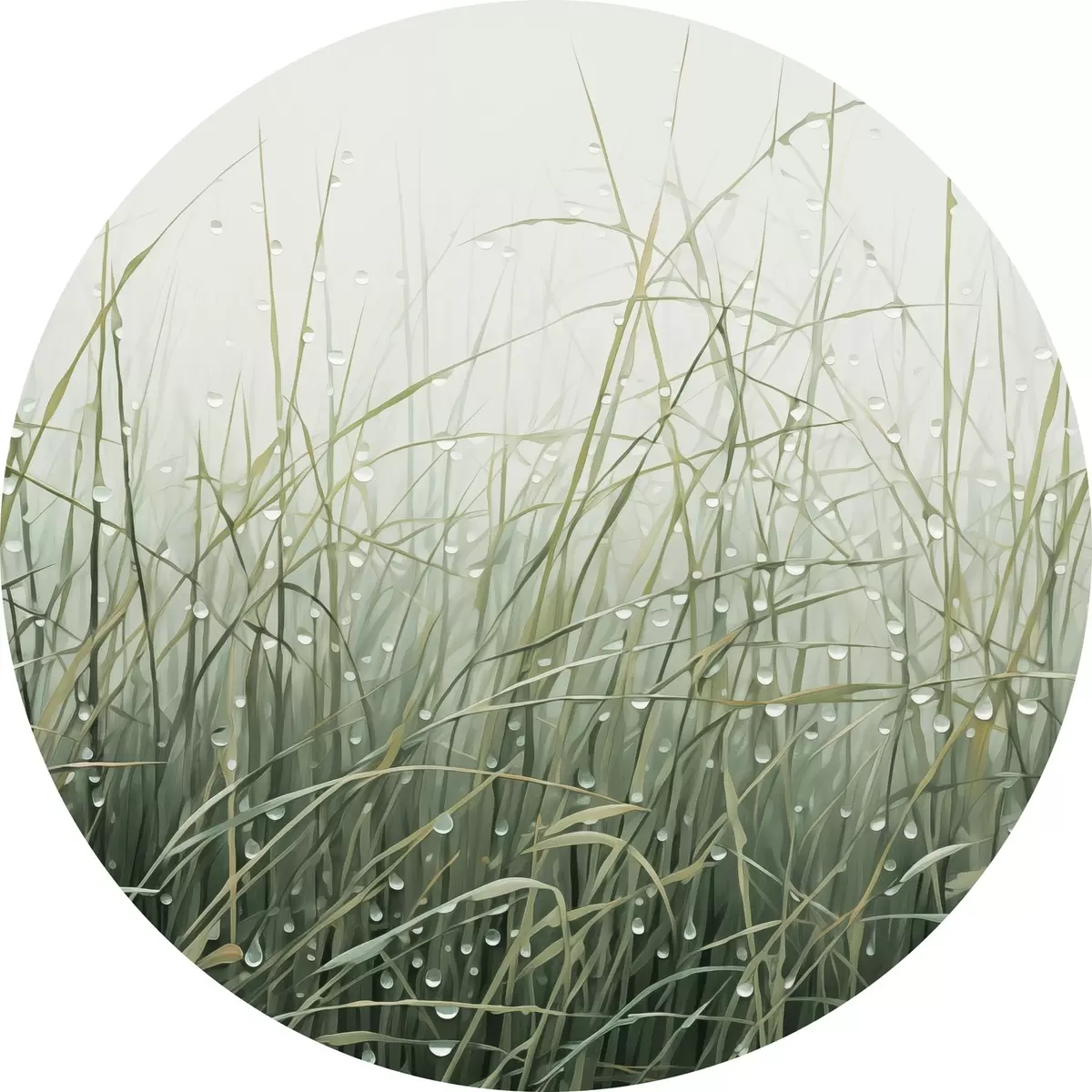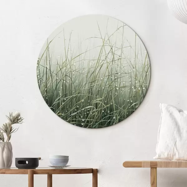 Tableaux ronds Herbe avec gouttes d'eau, nuances de vert, lumière douce, fond brumeux, style abstrait minimaliste texturé r44932