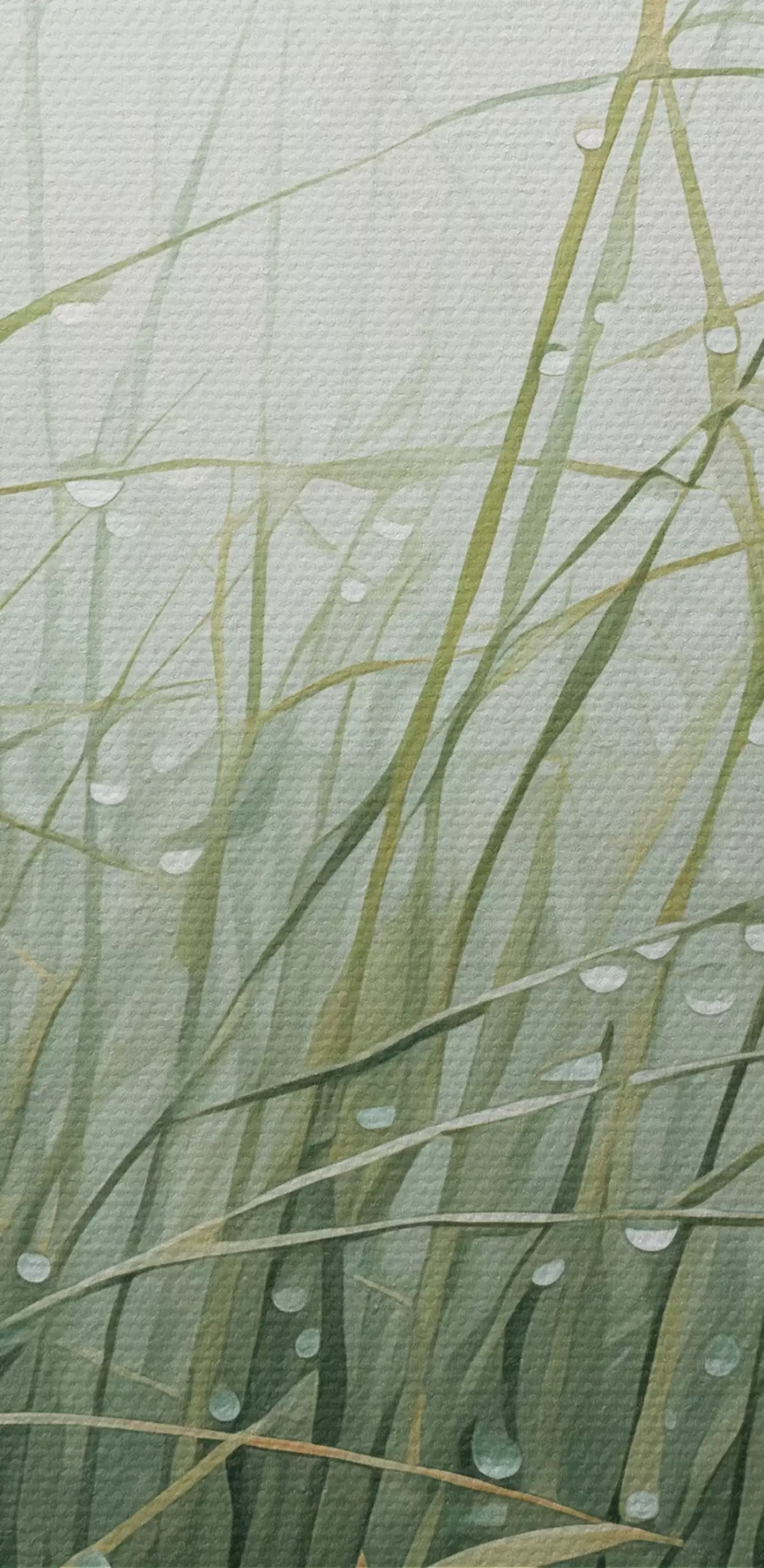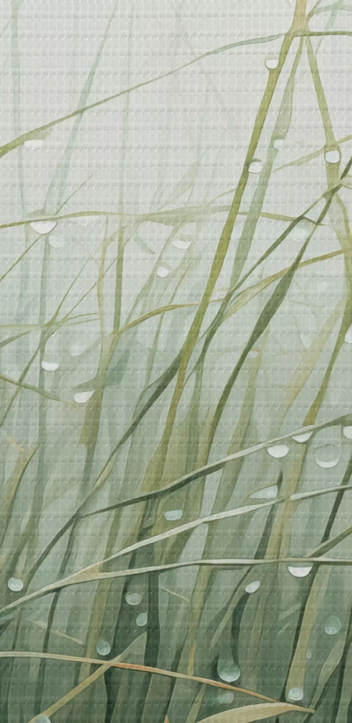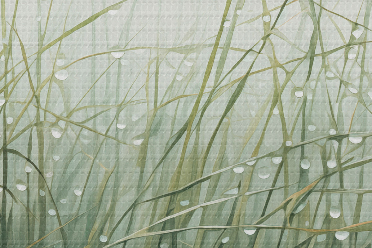 Image Herbe avec gouttes d'eau, nuances de vert, lumière douce, fond brumeux, style abstrait minimaliste texturé Nr r44932