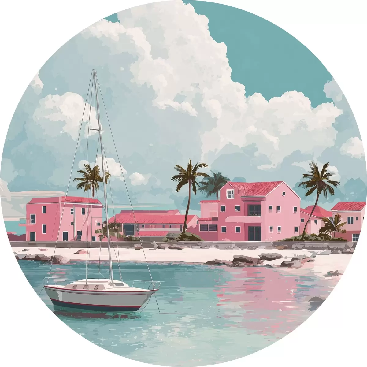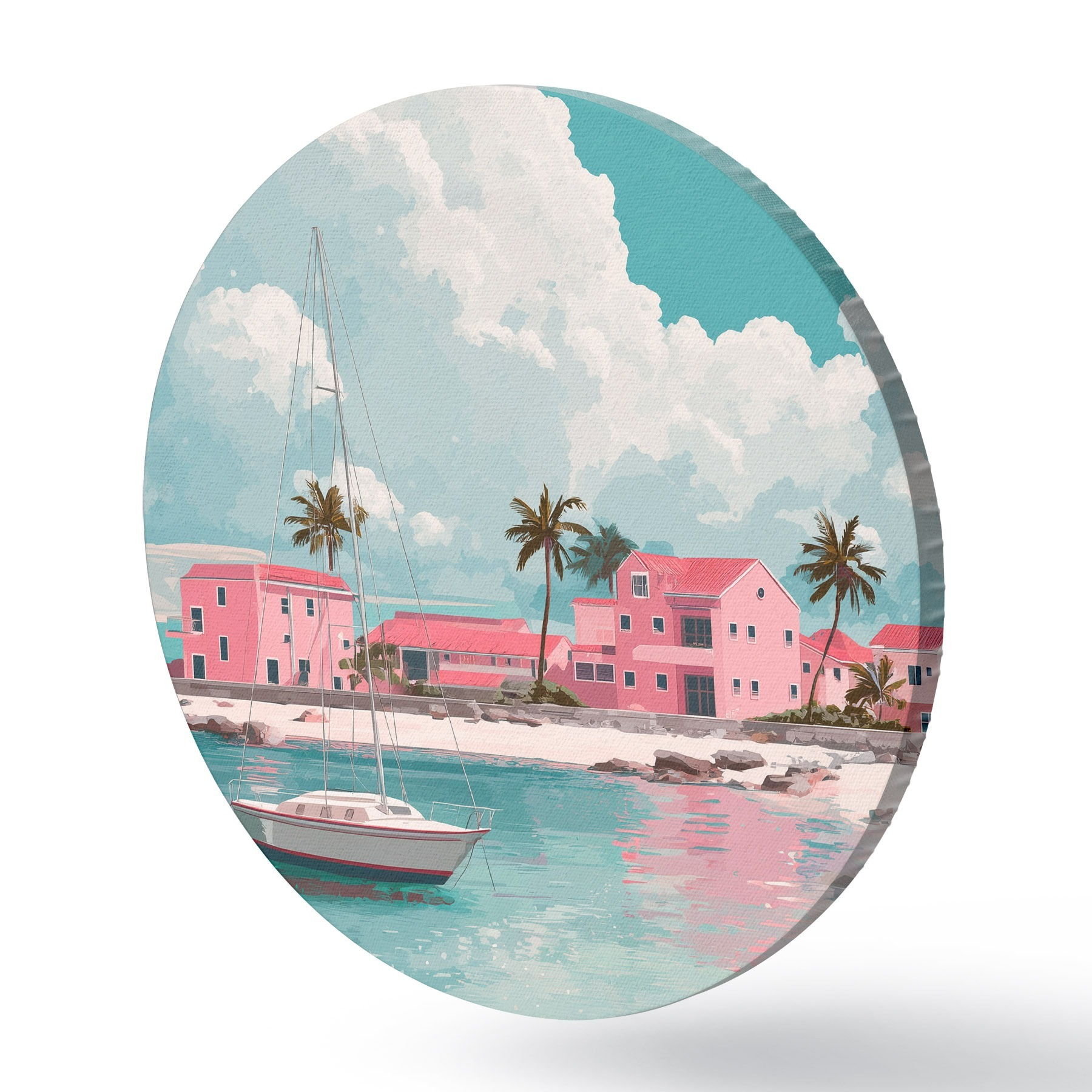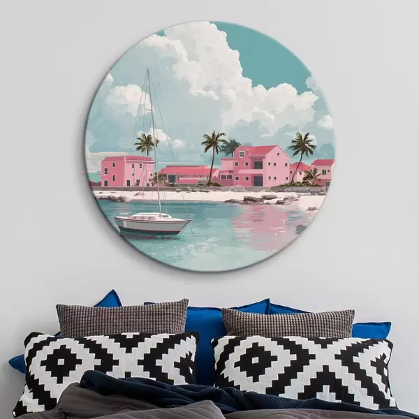 Tableaux ronds Plage rose avec soleil éclatant, voilier et maisons r44986