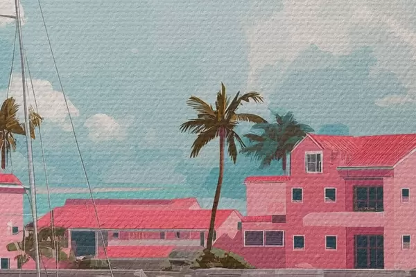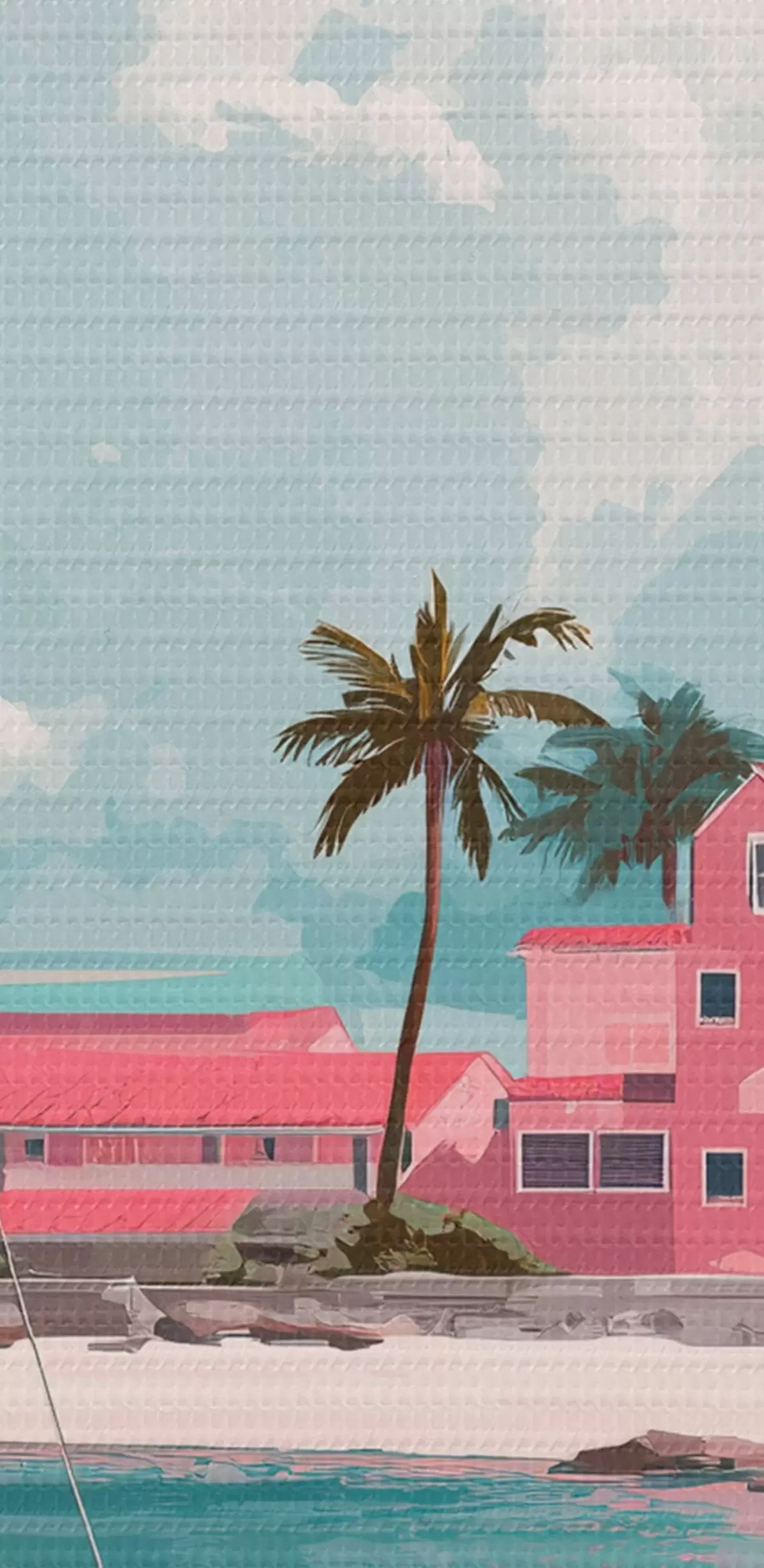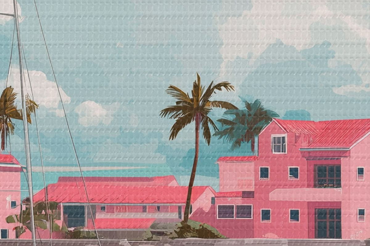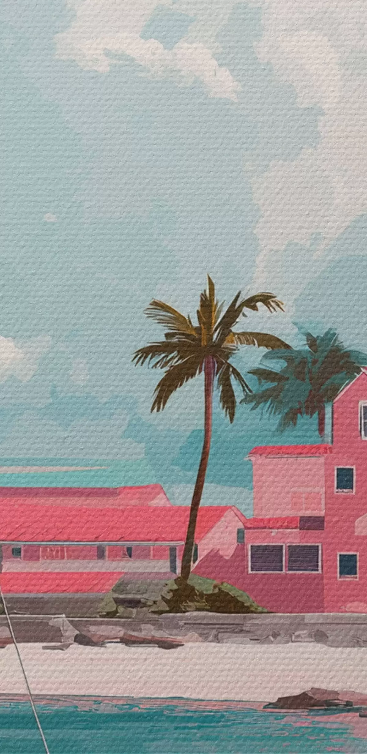 Image Plage rose avec soleil éclatant, voilier et maisons Nr r44986