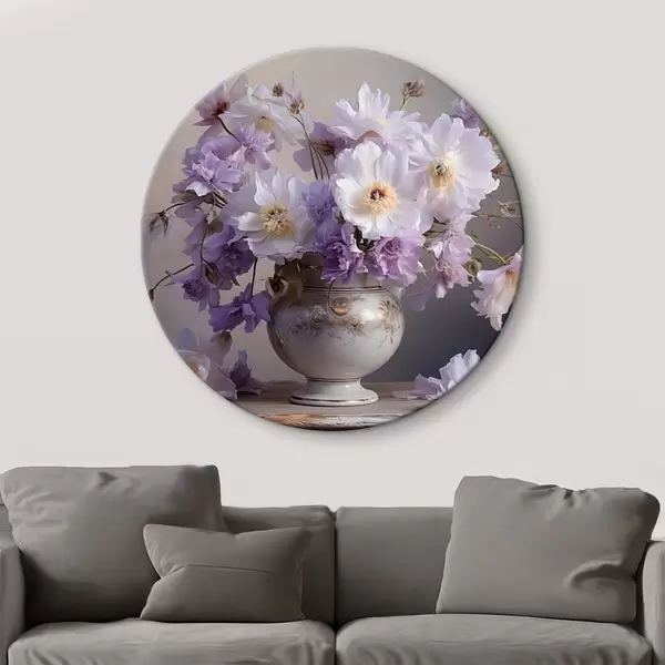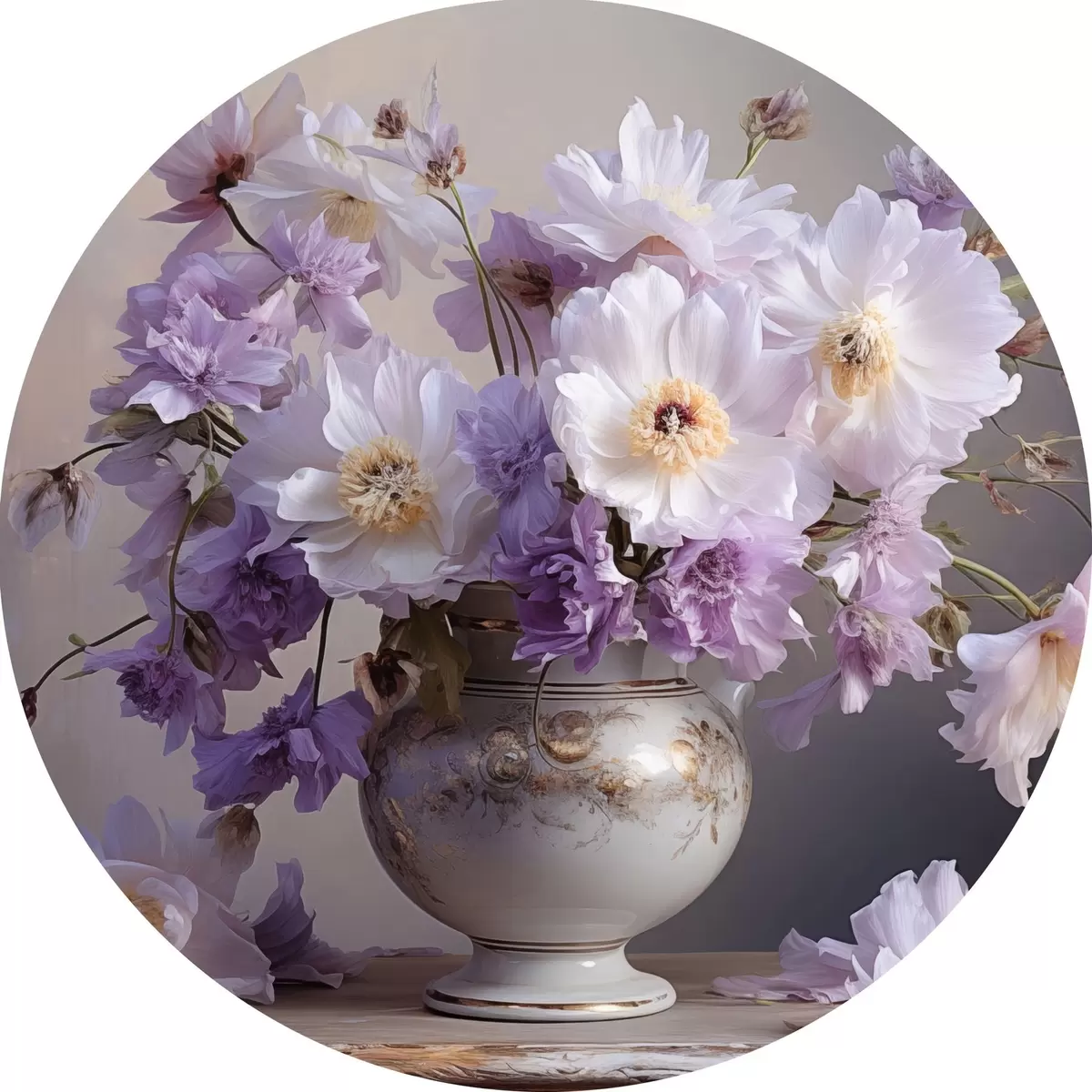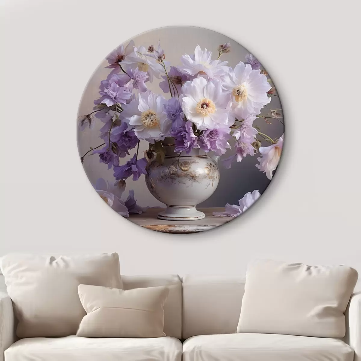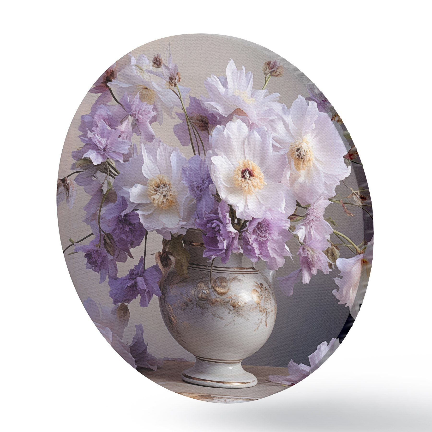 Tableaux ronds Nature morte florale : fleurs blanches et violettes dans un style artistique r45058