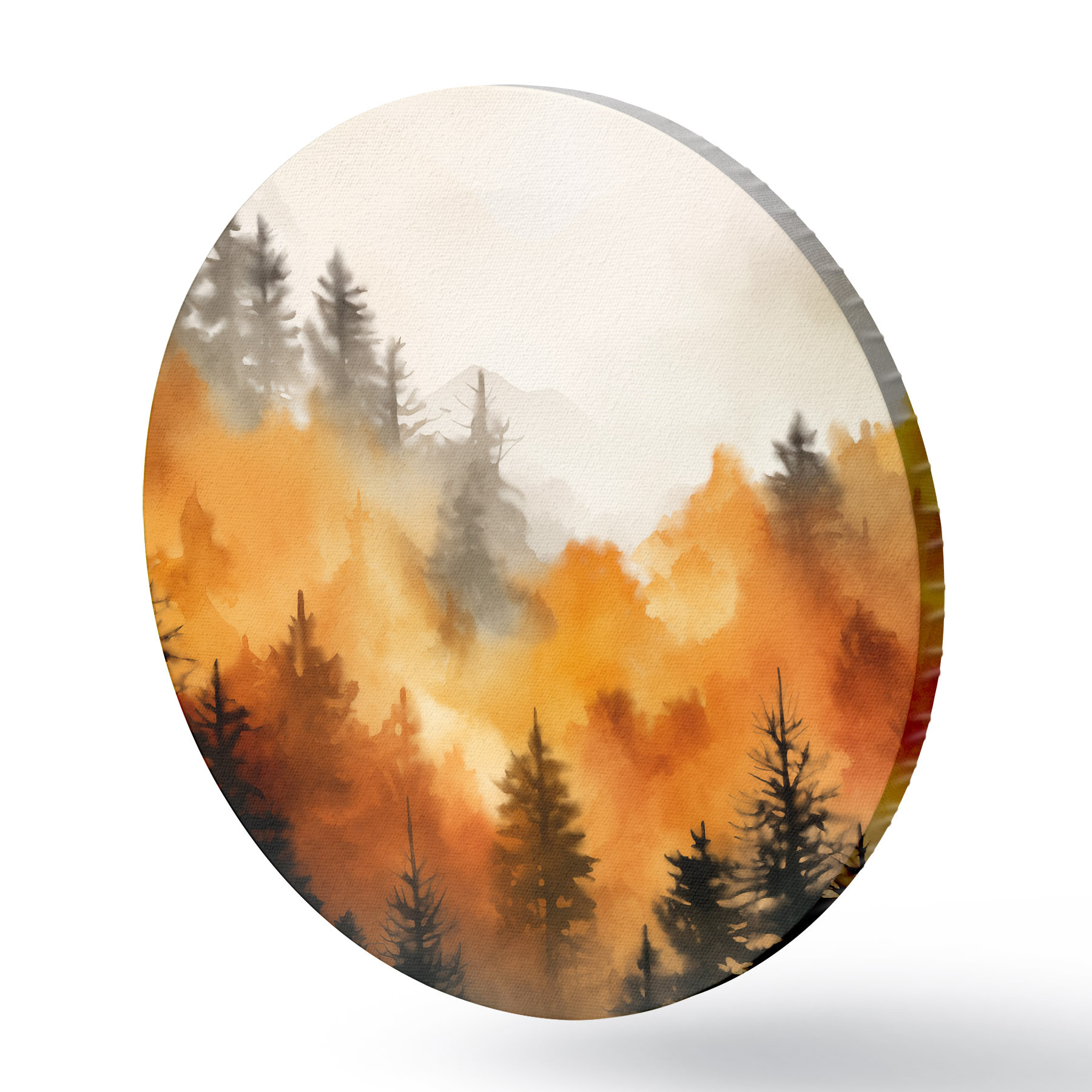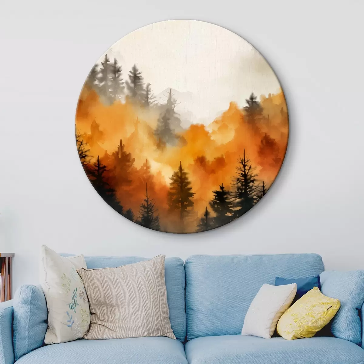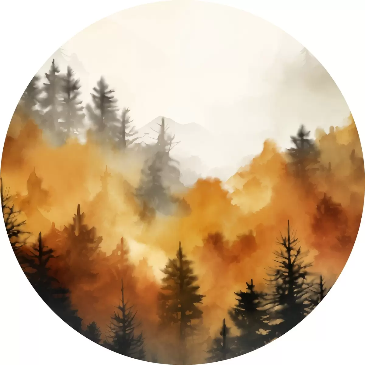 Tableaux ronds Peinture aquarelle d'un paysage imitant une forêt avec de grands pins et des montagnes en arrière-plan r45169