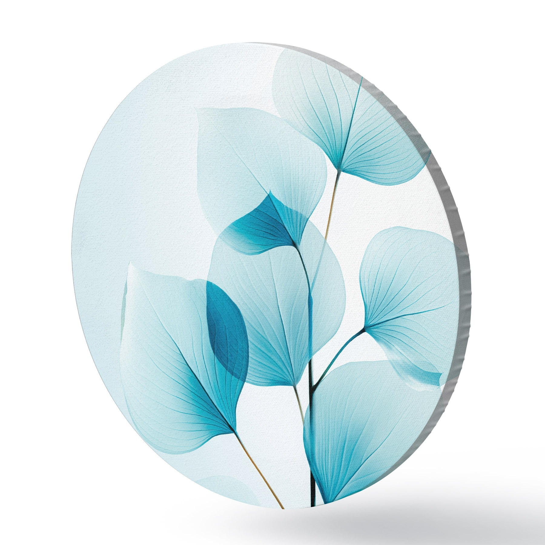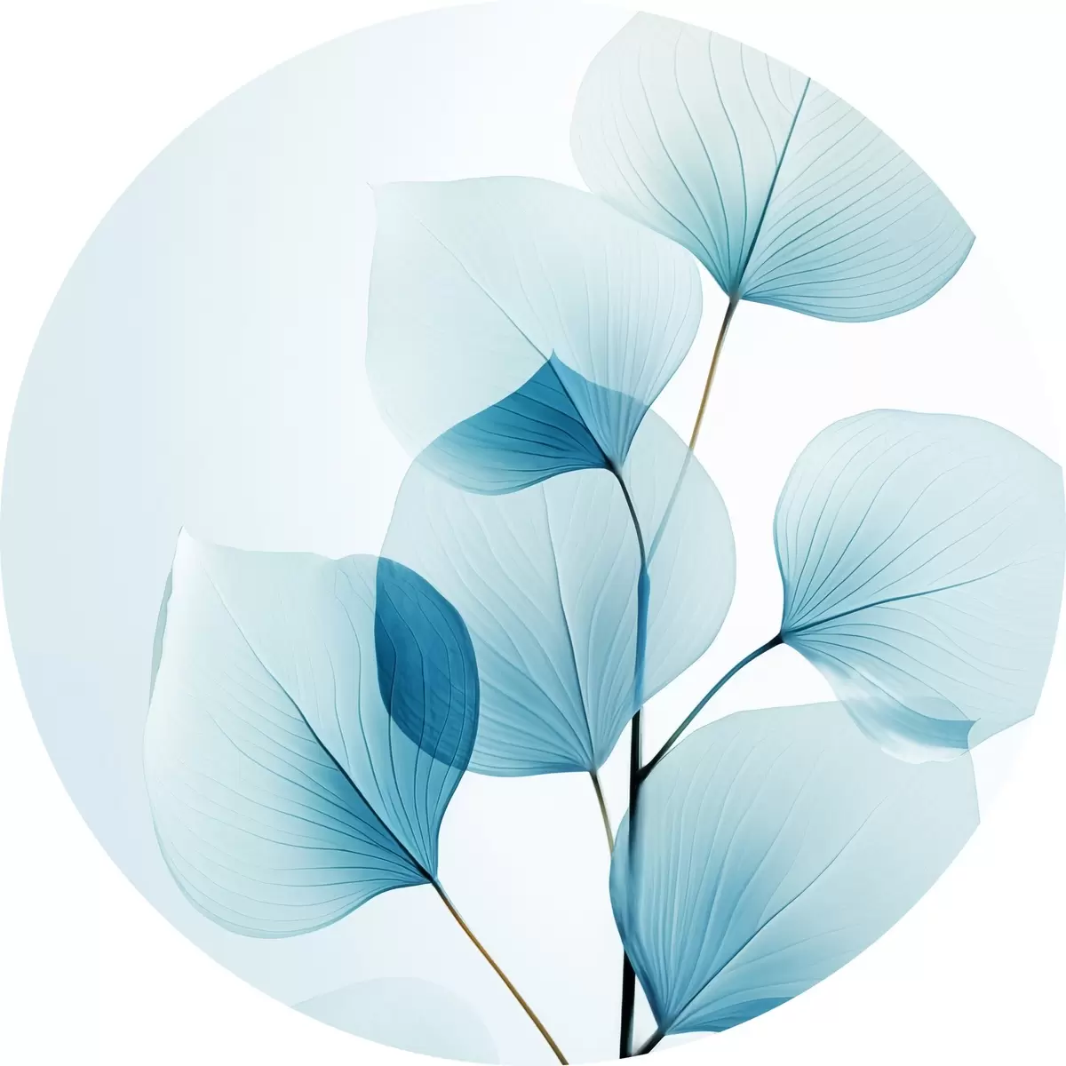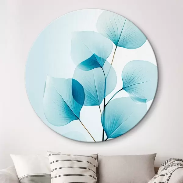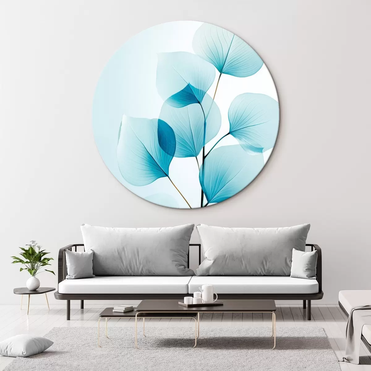 Tableaux ronds Branche avec des feuilles bleues translucides, veines délicates visibles, composition légère et calme, esthétique minimaliste r45175
