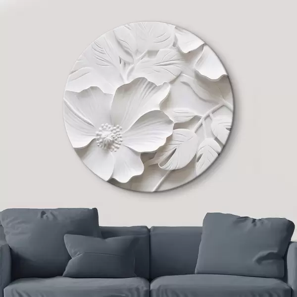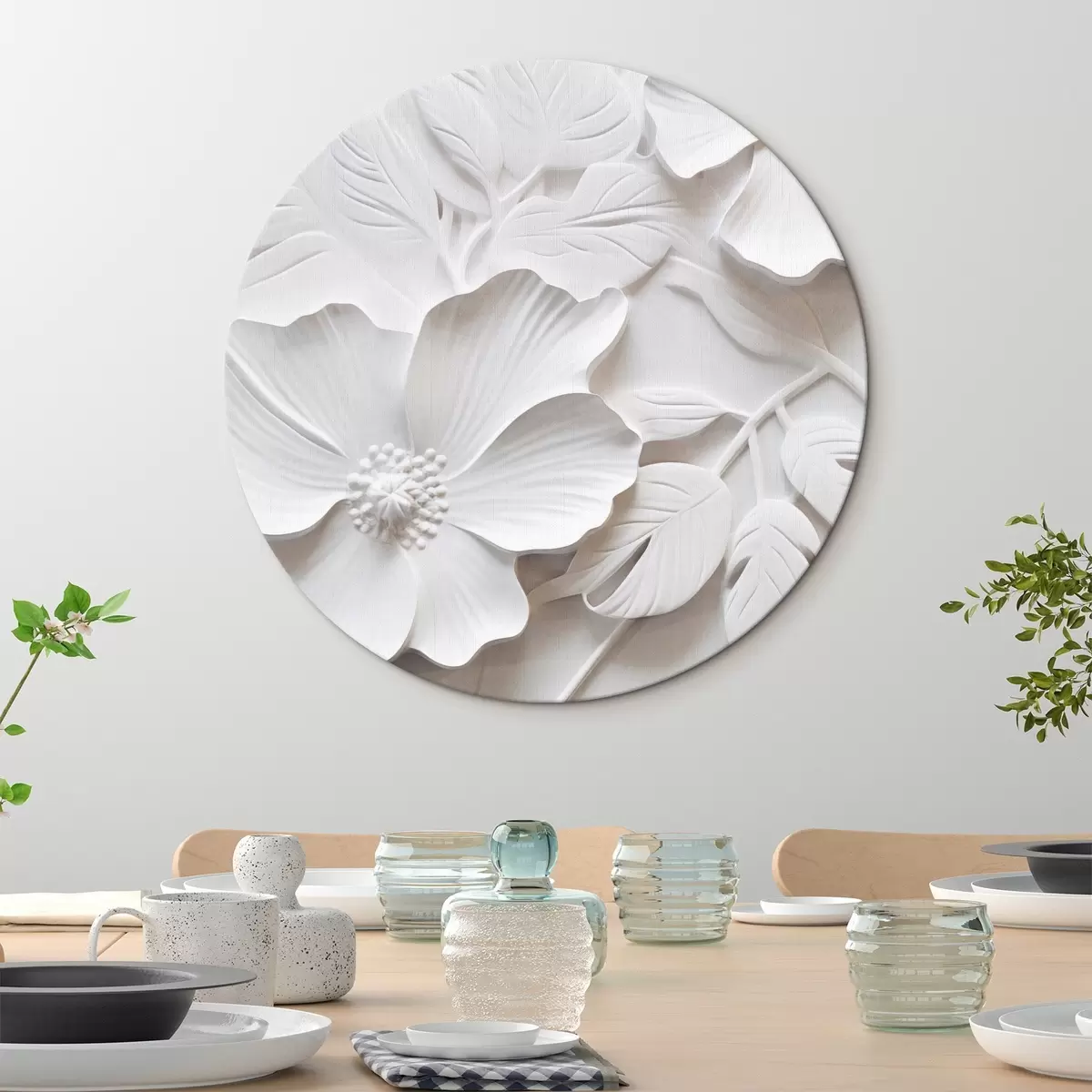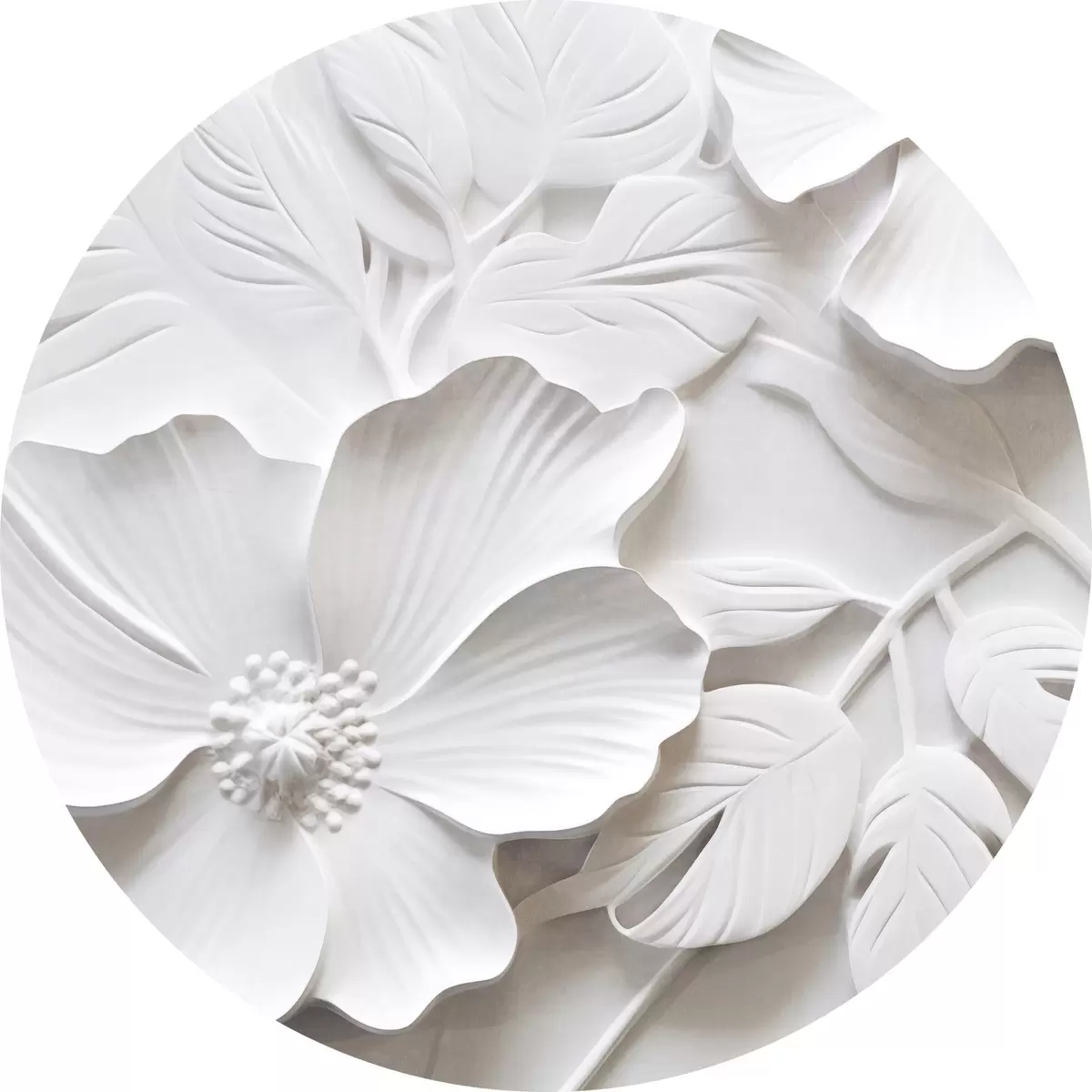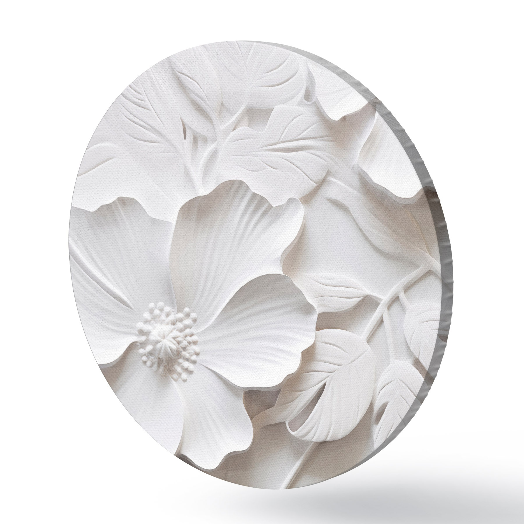 Tableaux ronds Fleurs blanches décoratives minimalistes avec feuilles, imitation relief, fond blanc r45180