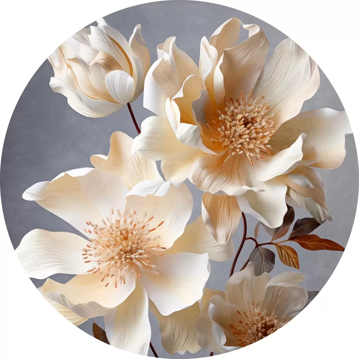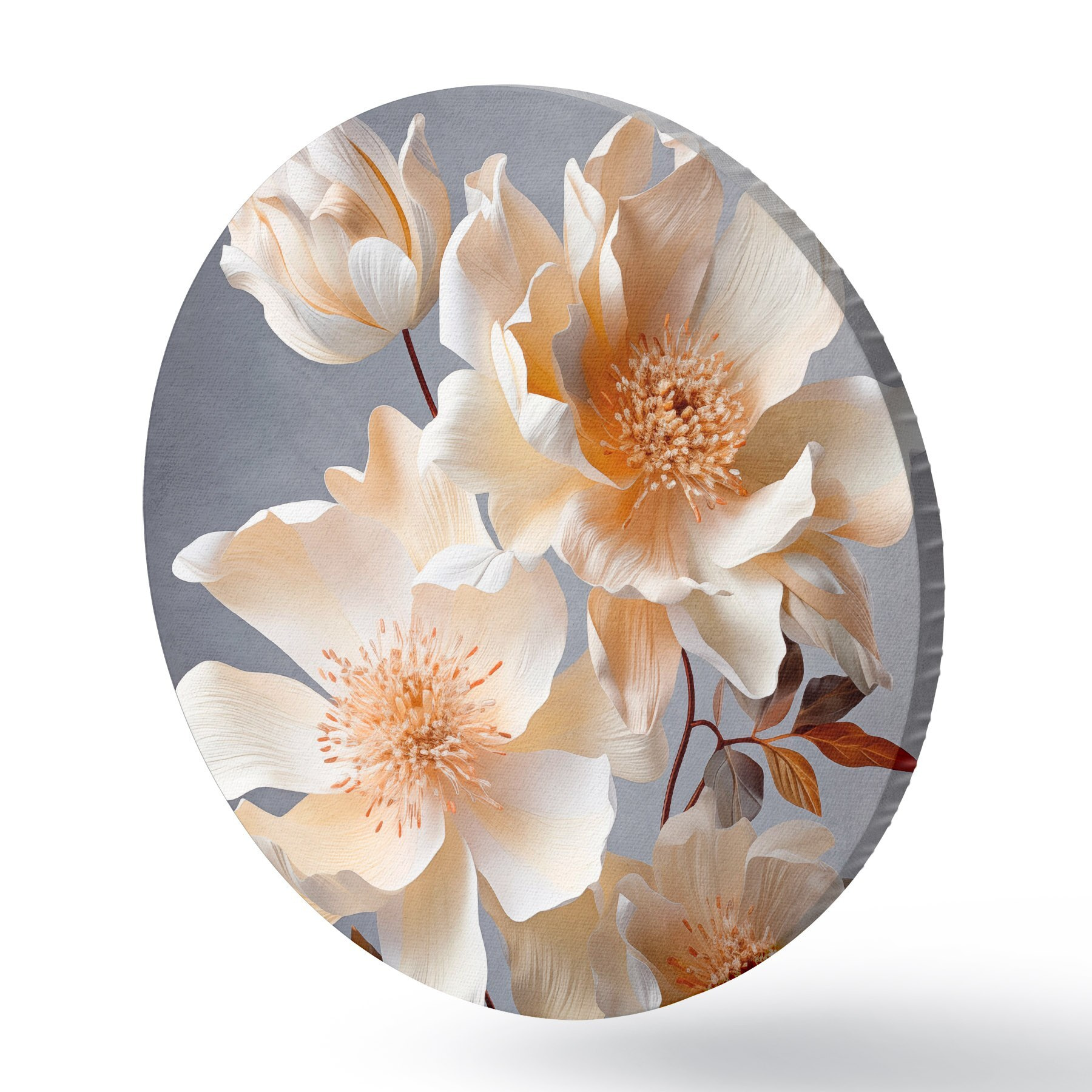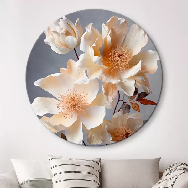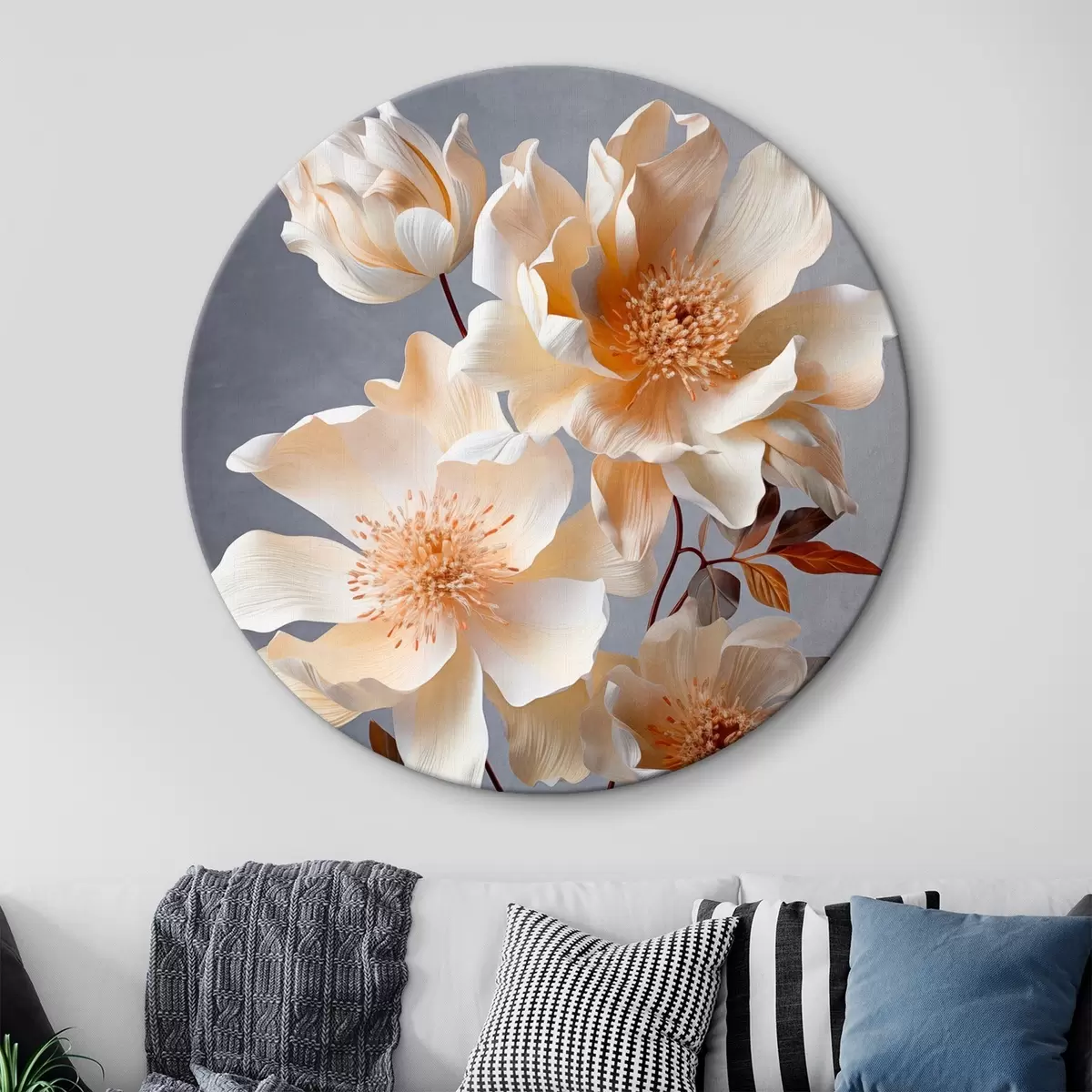 Tableaux ronds Fleurs texturées avec pistils orange et feuilles orange sur fond gris, lumière douce, élégant, détaillé, réaliste r45181