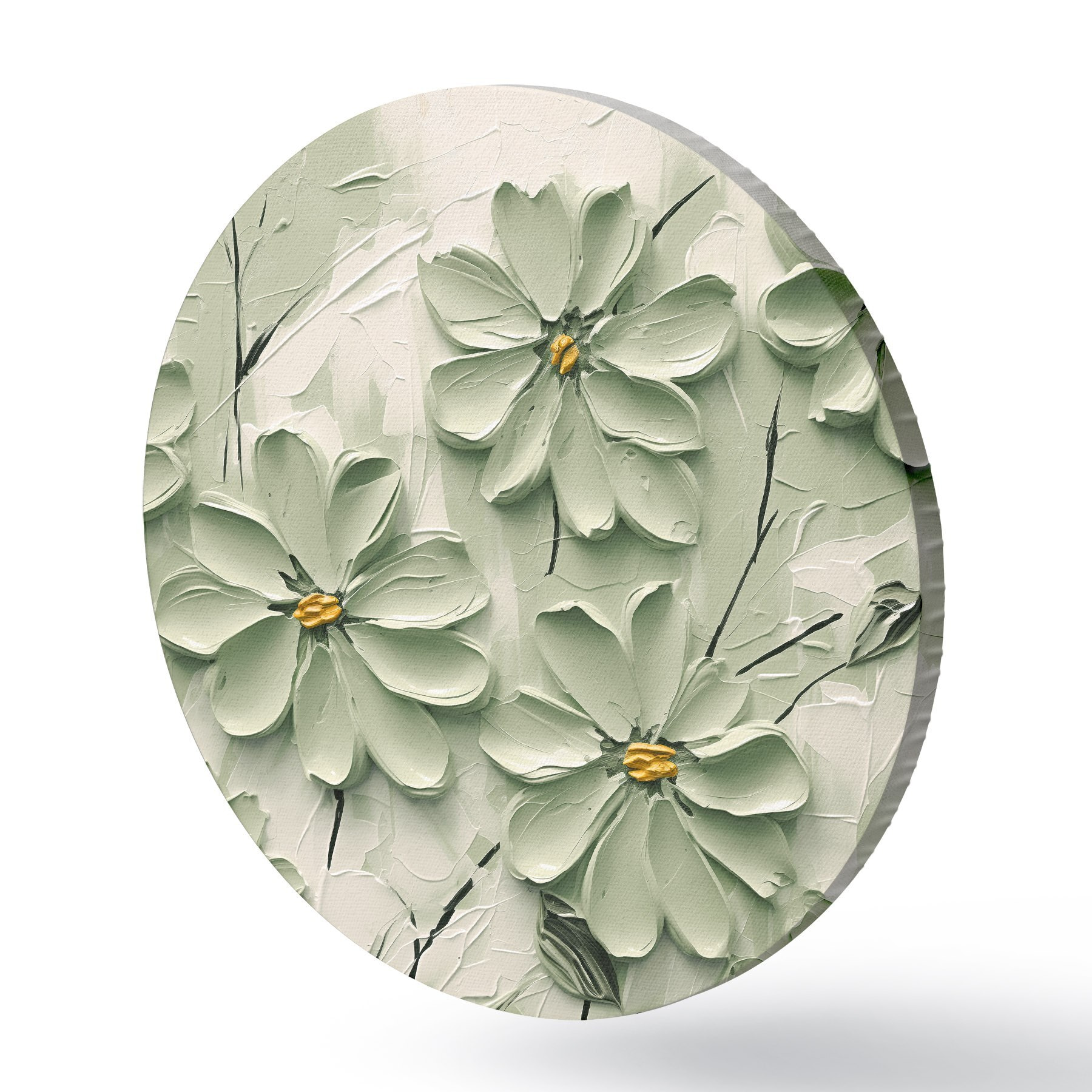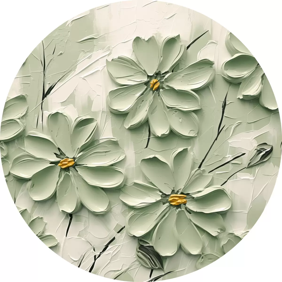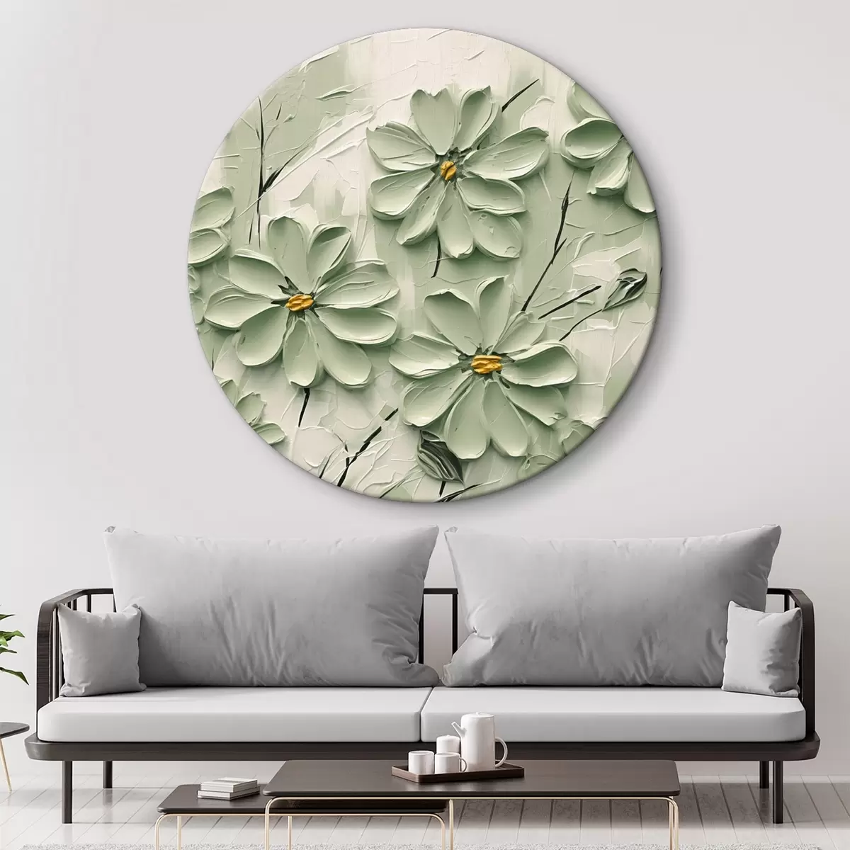Tableaux ronds Fleurs vertes à centre jaune peintes à grands coups de pinceau sur fond clair r45265