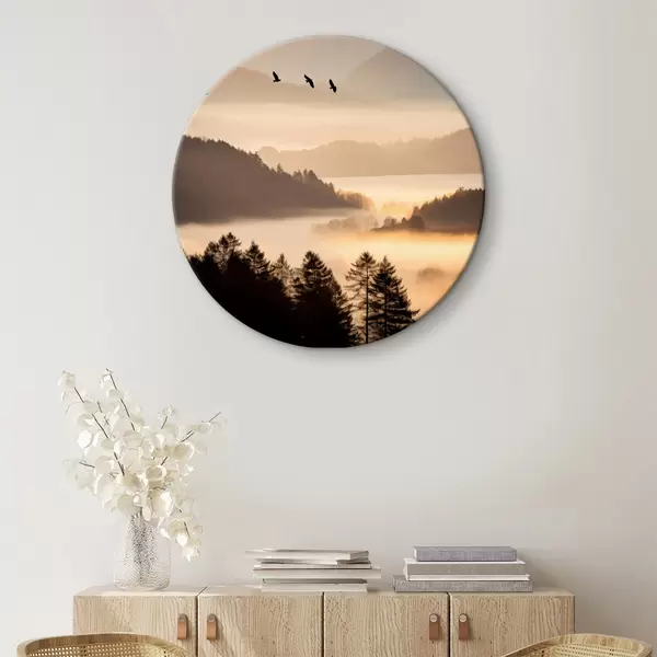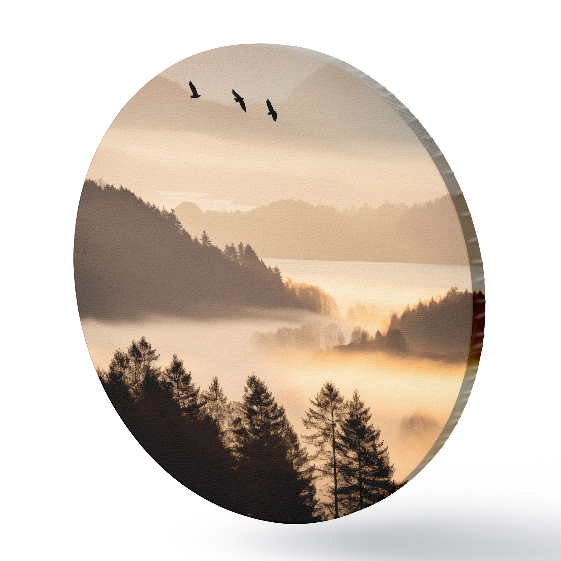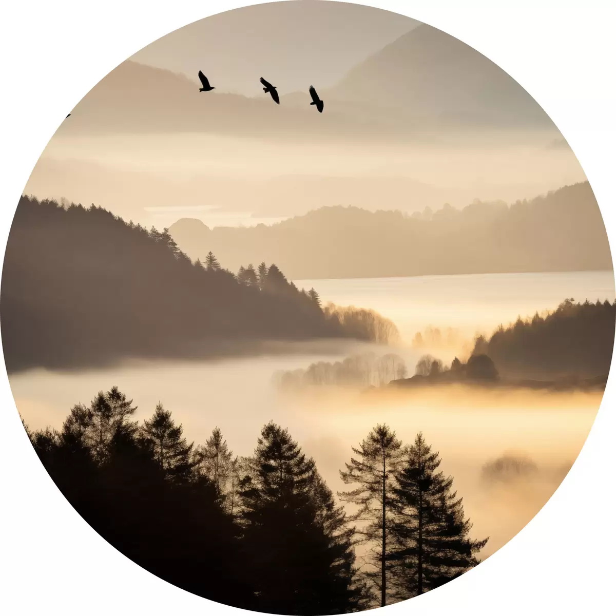 Tableaux ronds Un paysage de montagne avec une forêt et des oiseaux volant dans le ciel, le tout recouvert d'une épaisse couche de brouillard au lever du soleil r45564