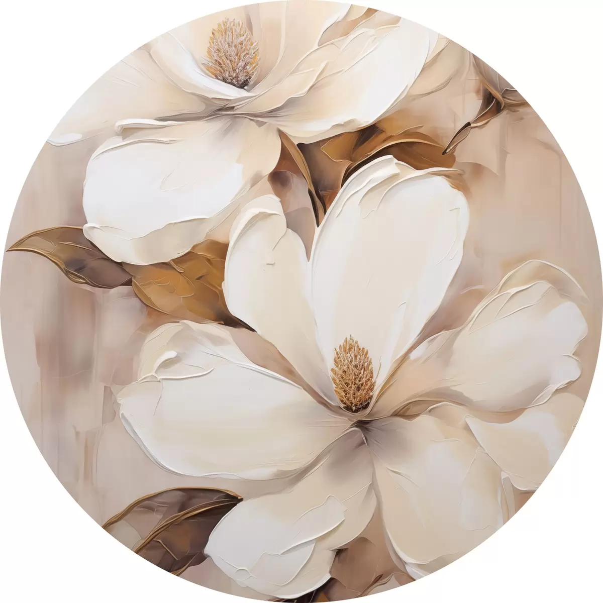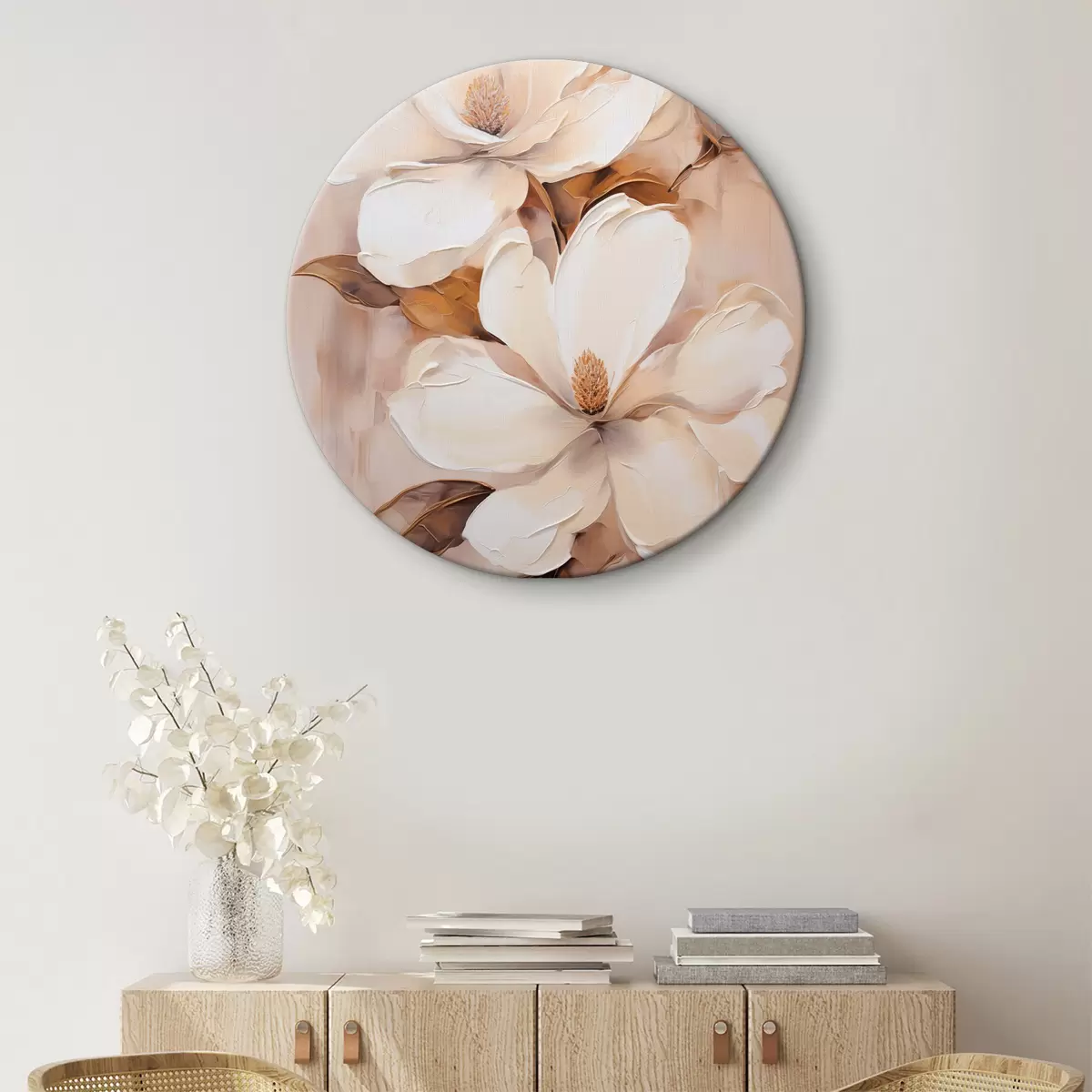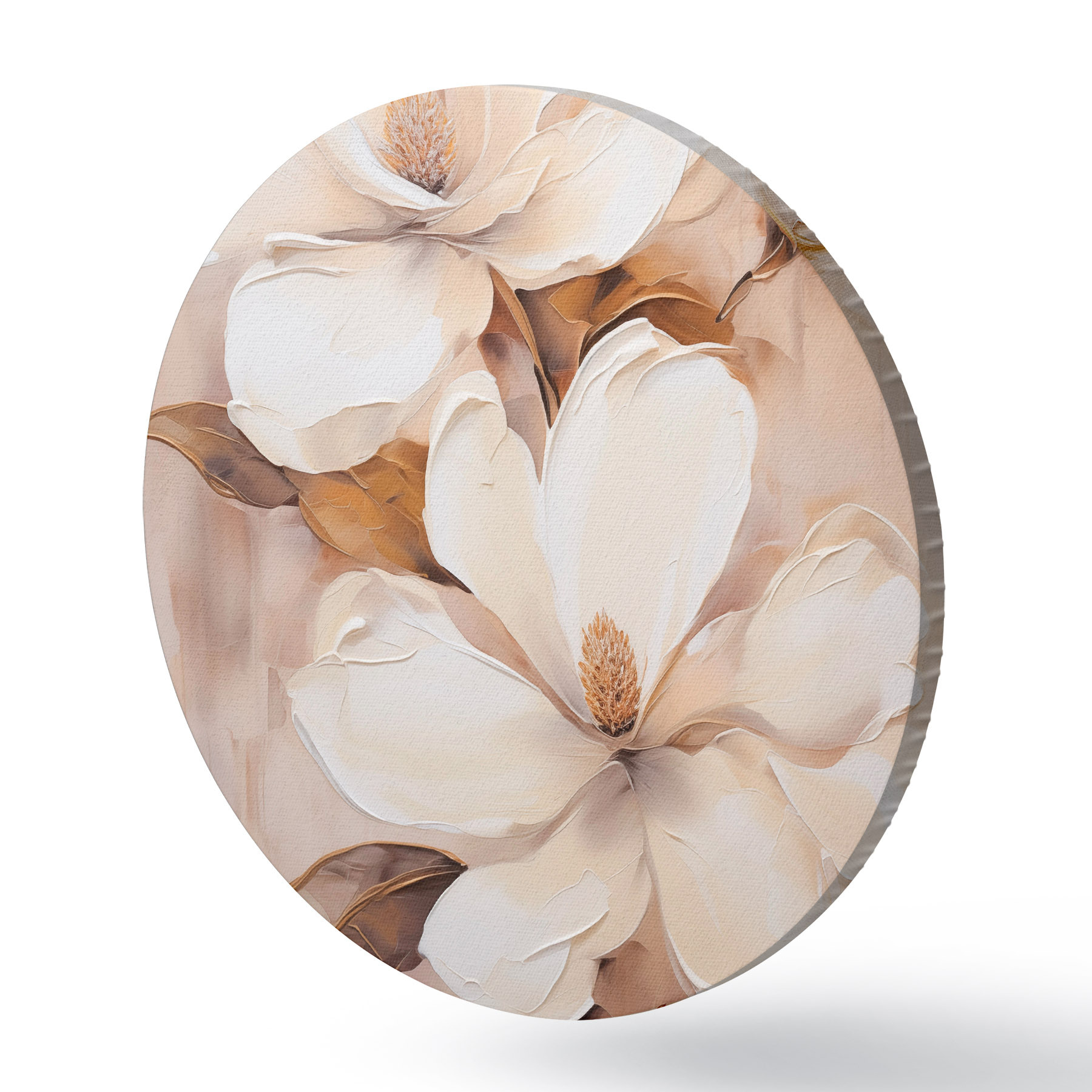 Tableaux ronds Fleurs de magnolia blanches sur un fond doux et flou de tons beiges et bruns, style peinture r45572