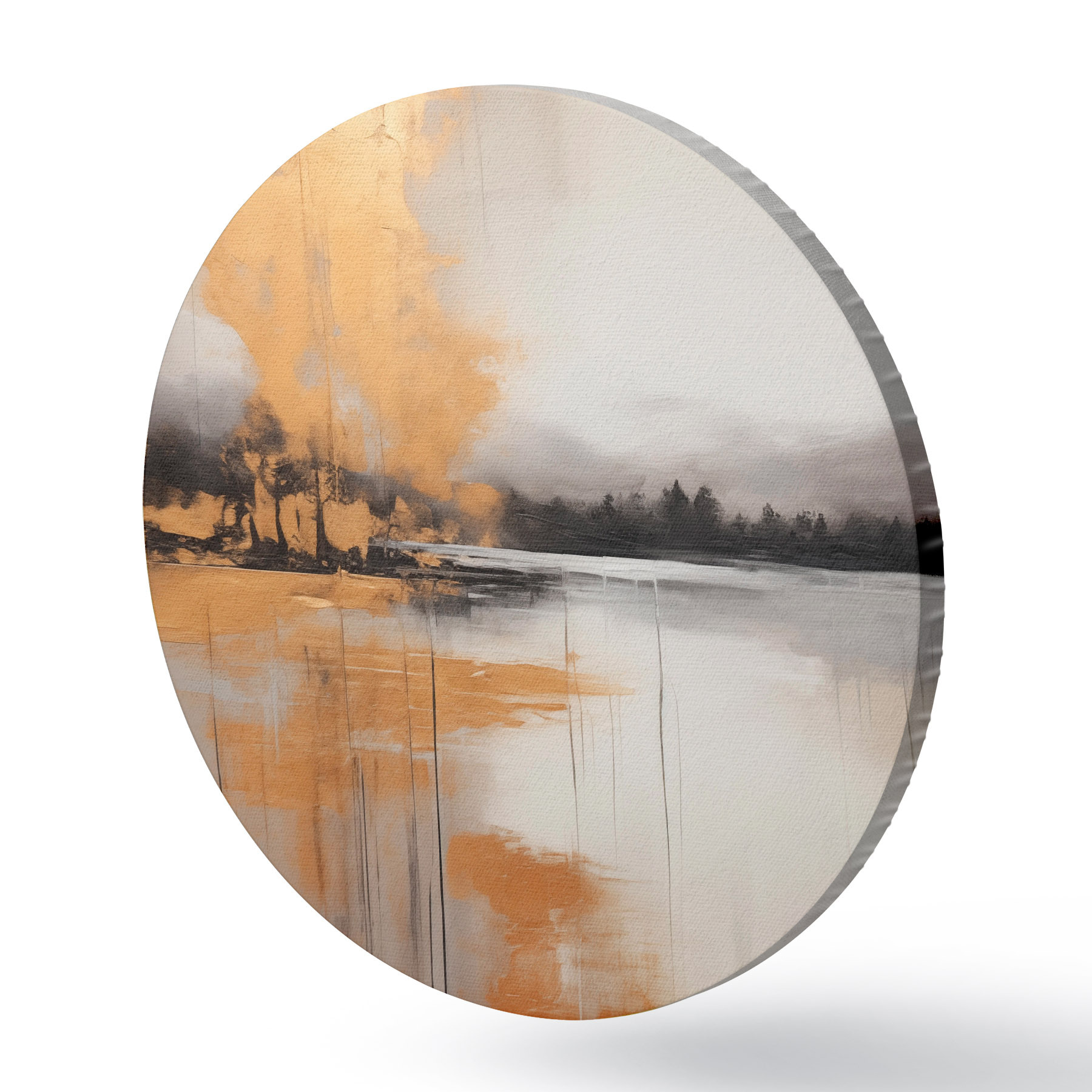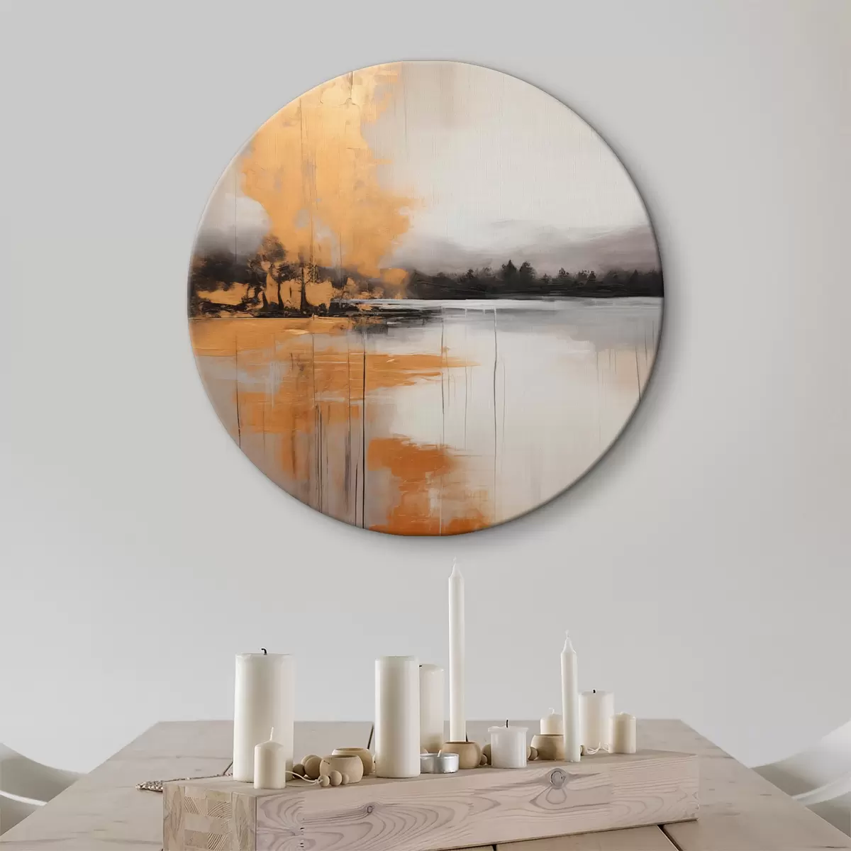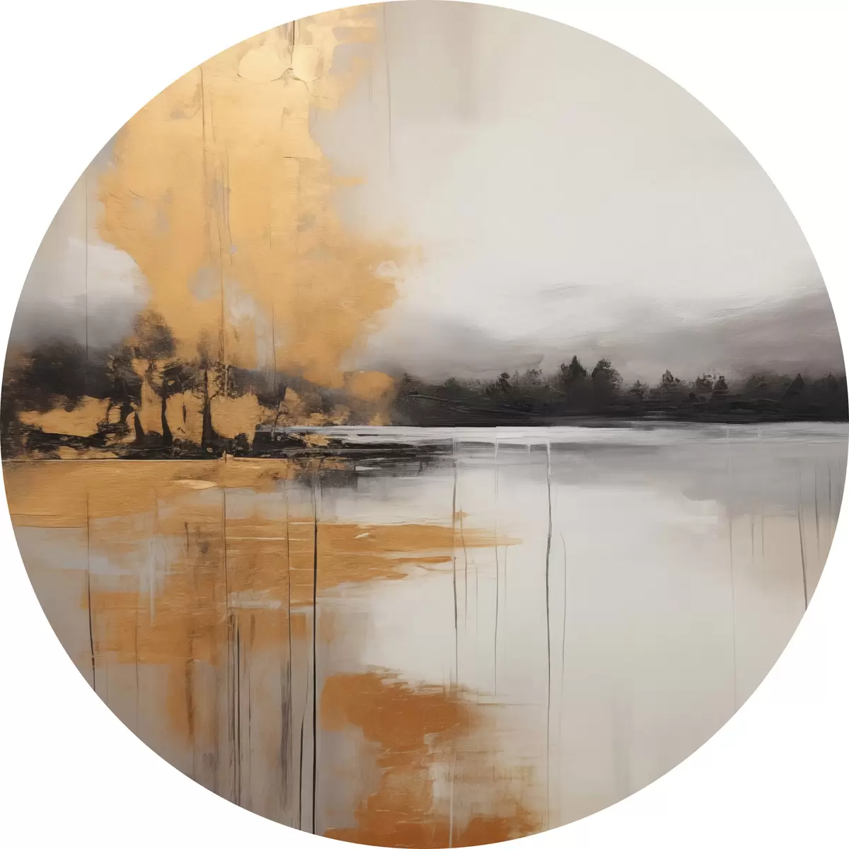 Tableaux ronds Un paysage abstrait avec un lac, un arbre et un brouillard jaune, l'eau se reflète et le ciel est nuageux r45575