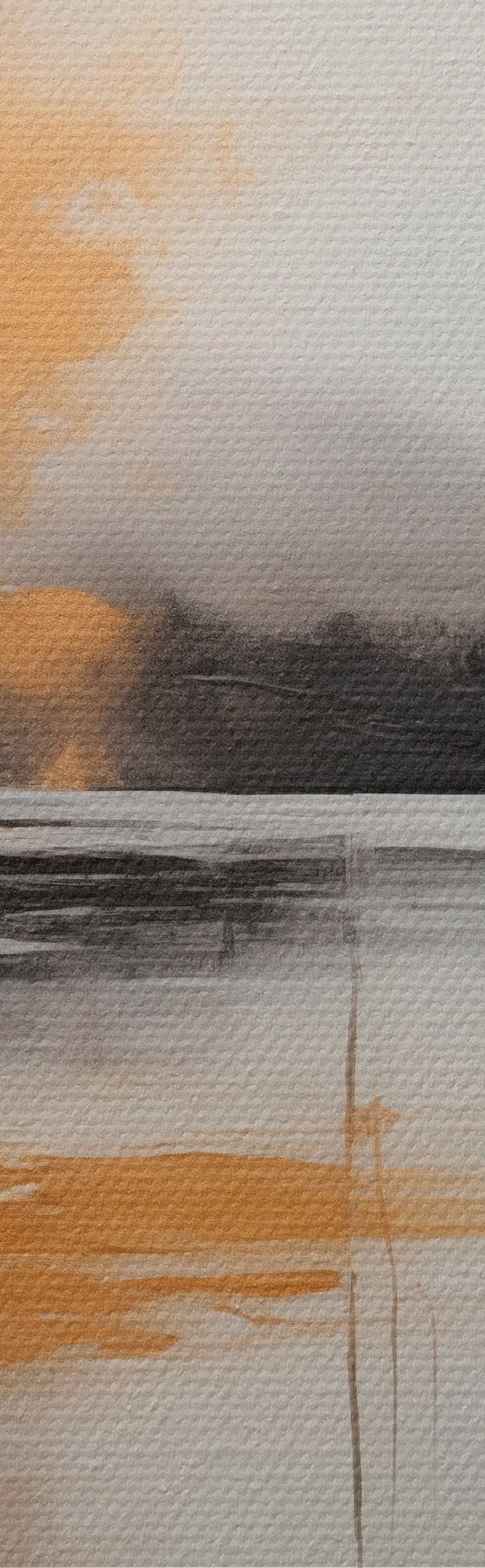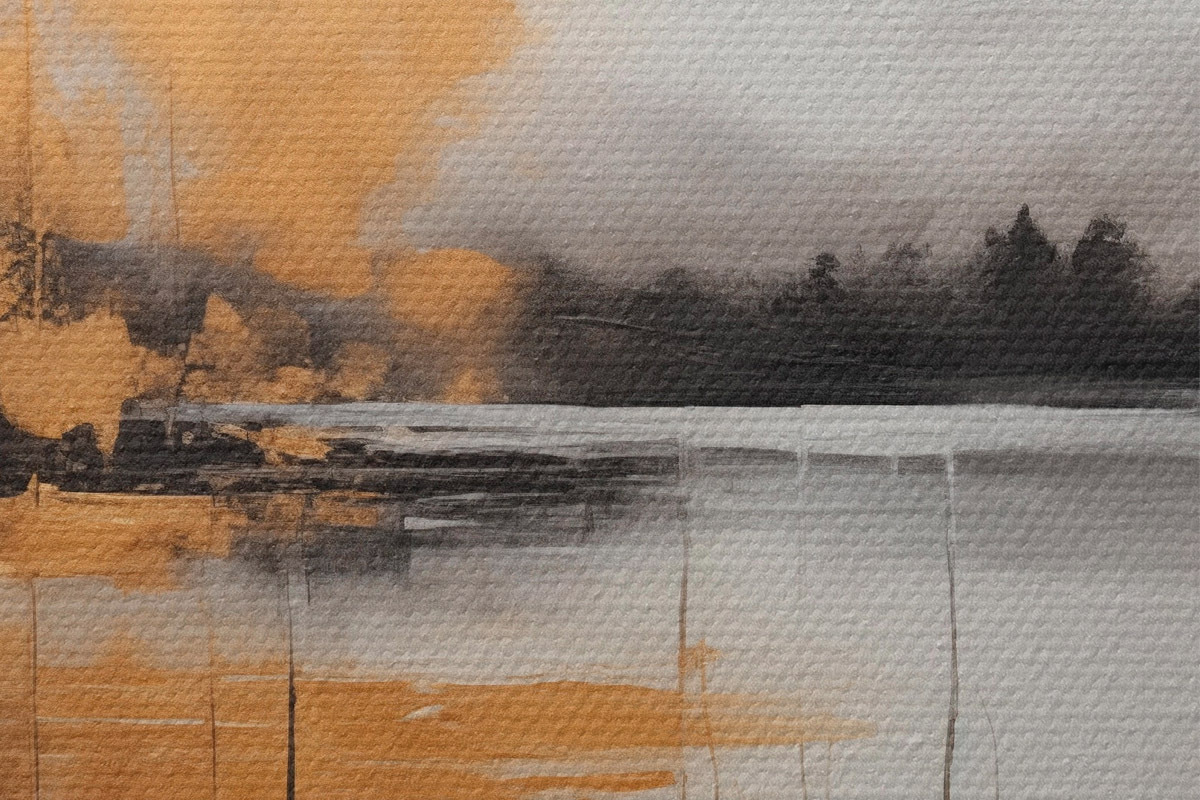 Image Un paysage abstrait avec un lac, un arbre et un brouillard jaune, l'eau se reflète et le ciel est nuageux Nr r45575