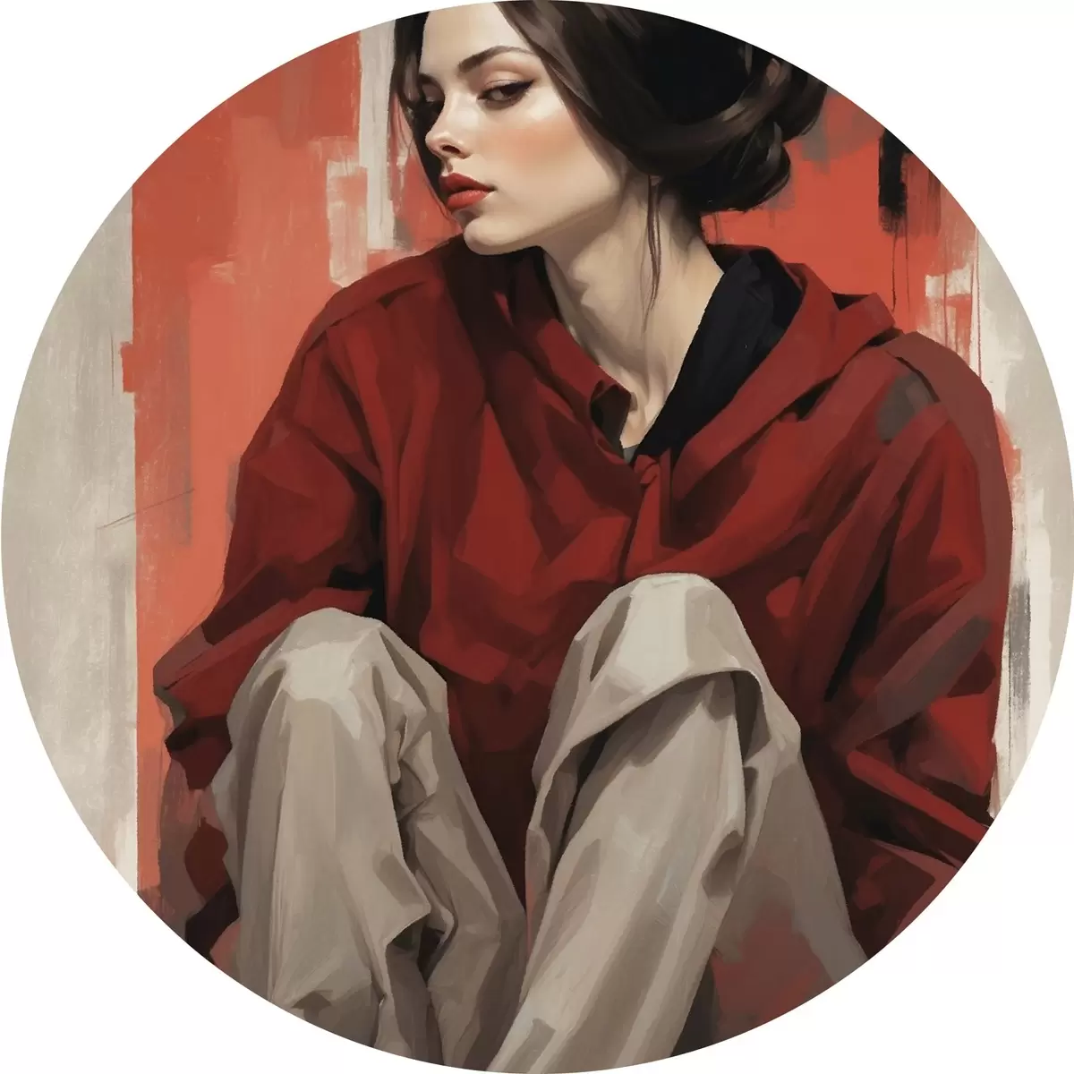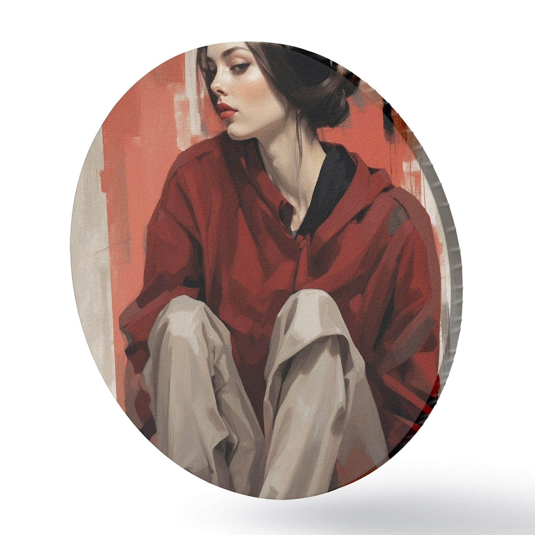 Tableaux ronds Fille vêtue d'une cape rouge, assise, les jambes repliées r45624