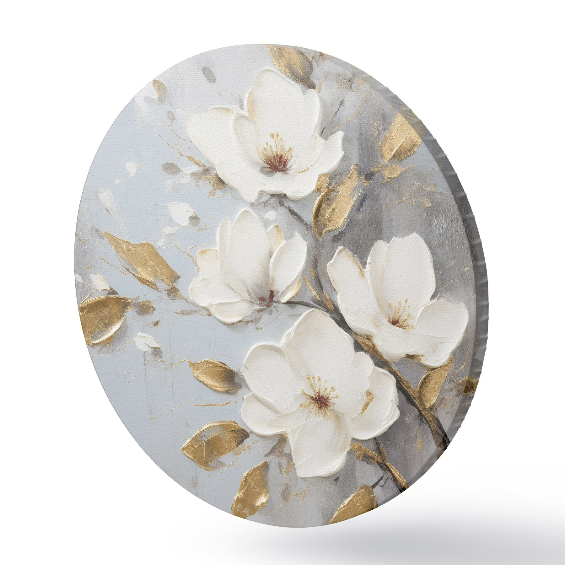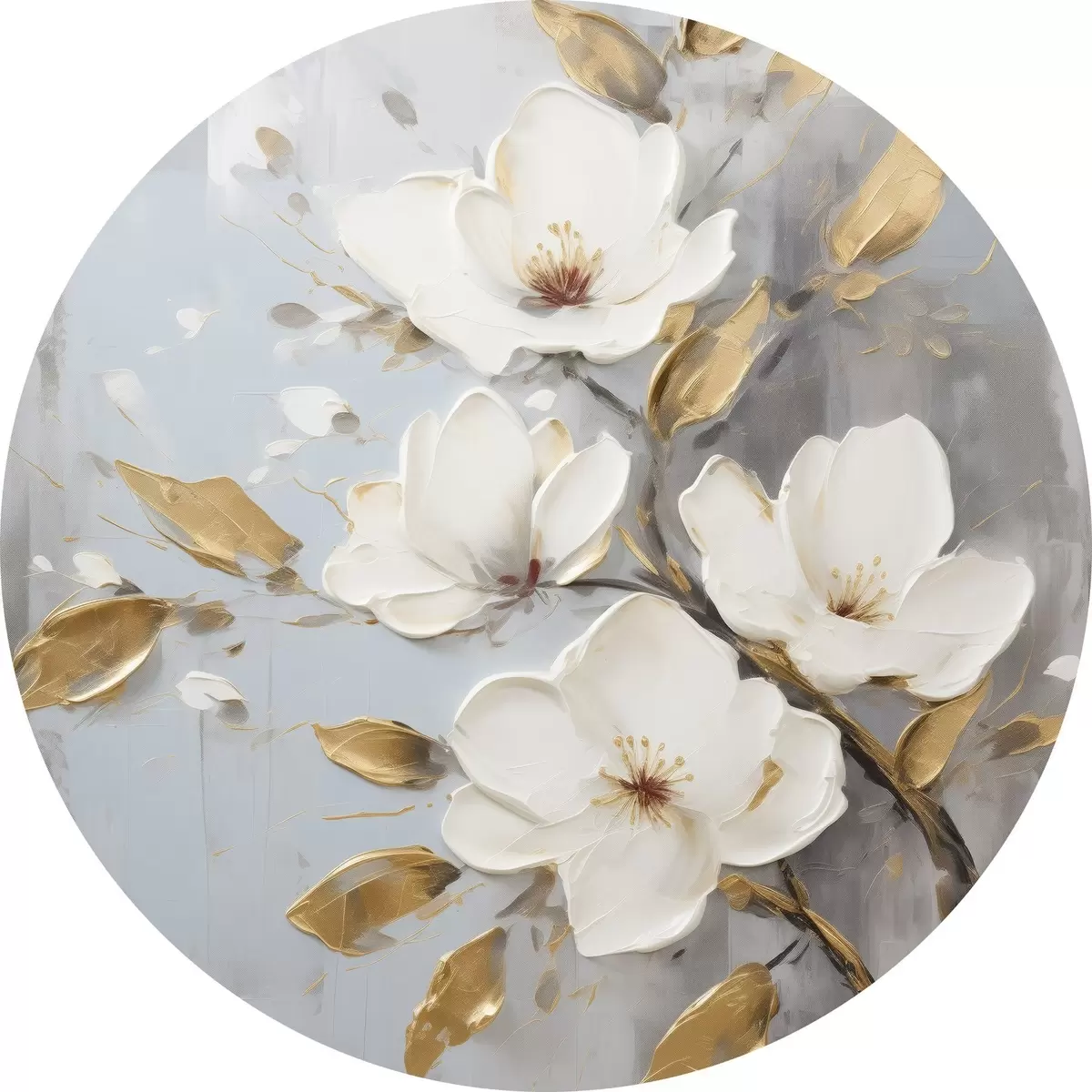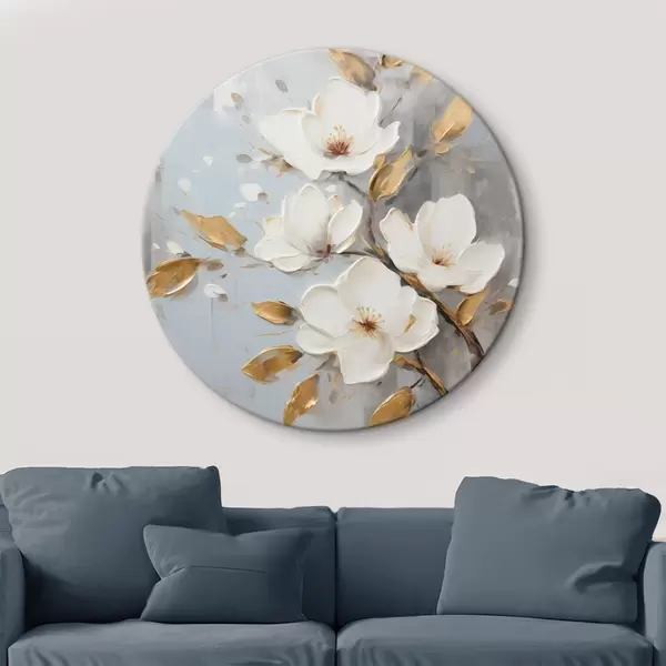 Tableaux ronds Branche avec des fleurs blanches et des feuilles jaune-orange r45692