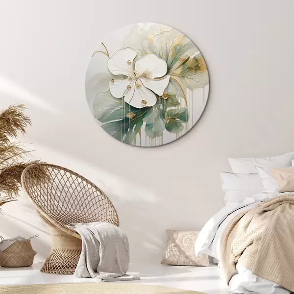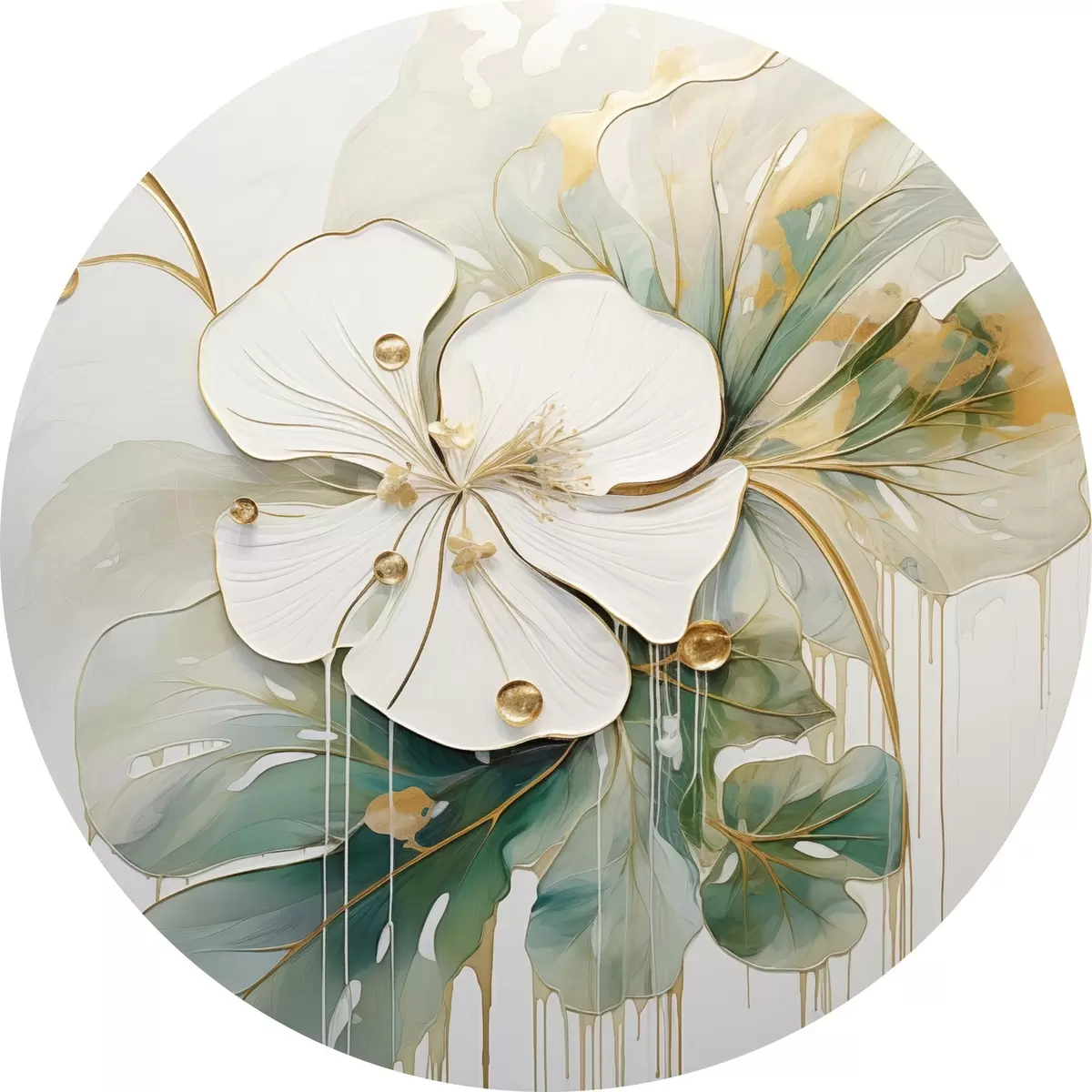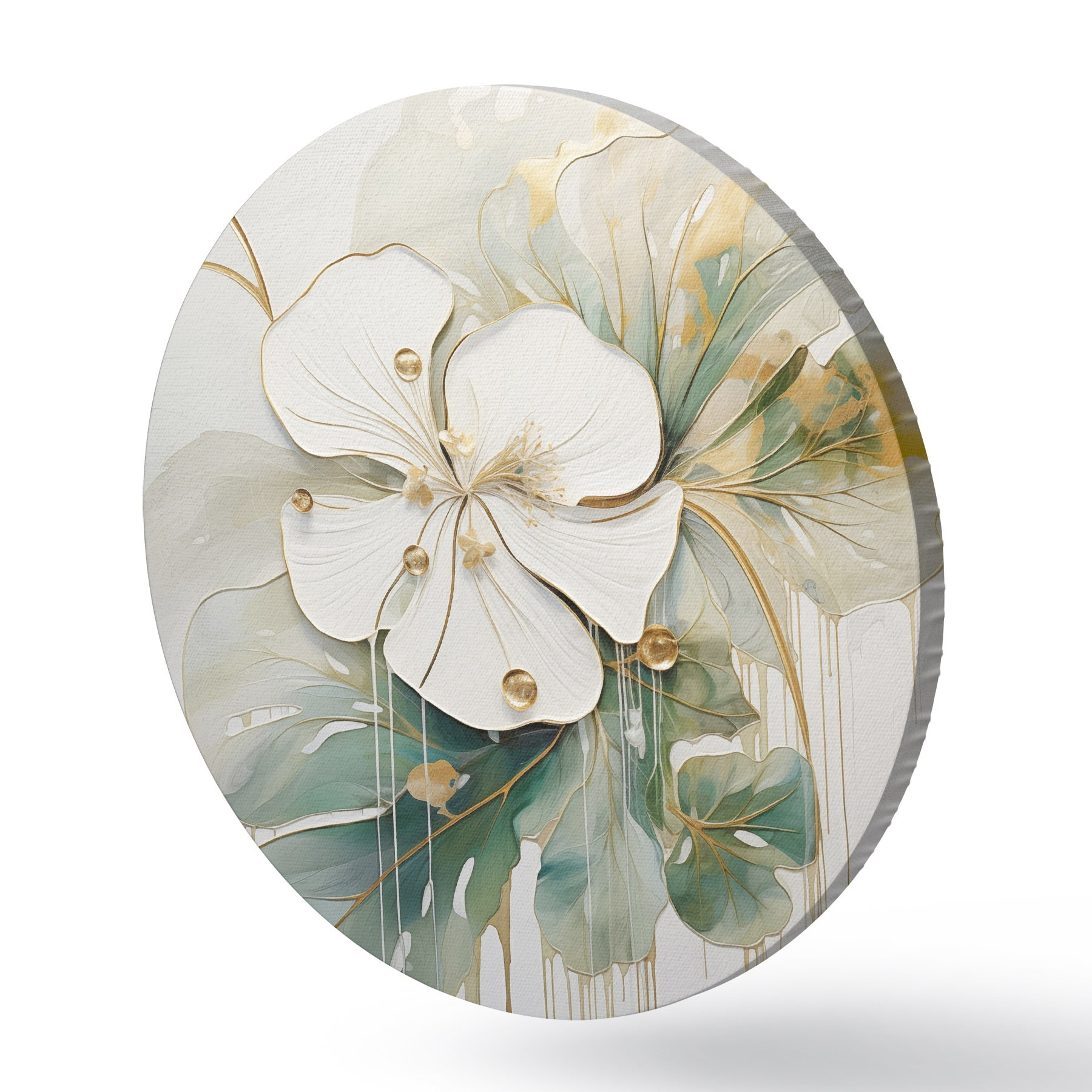 Tableaux ronds Une fleur blanche avec des détails jaune-orange et des feuilles vertes r45815