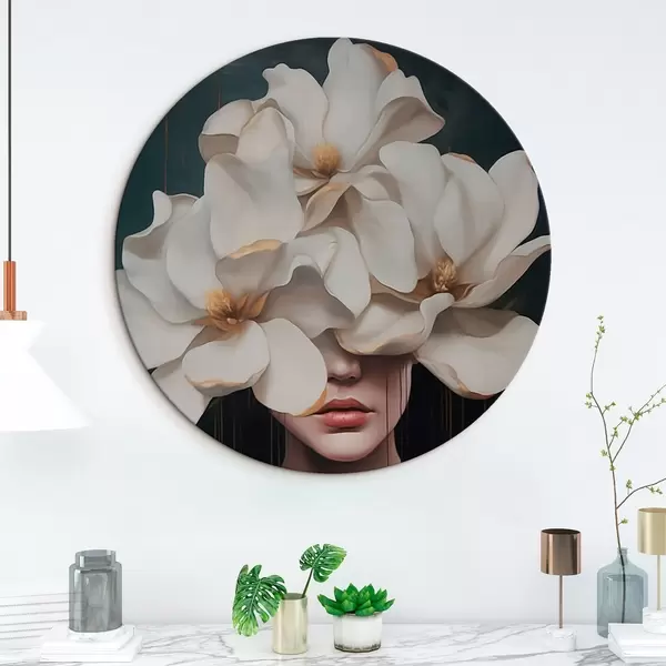 Tableaux ronds Femme avec des fleurs blanches sur la tête r45843