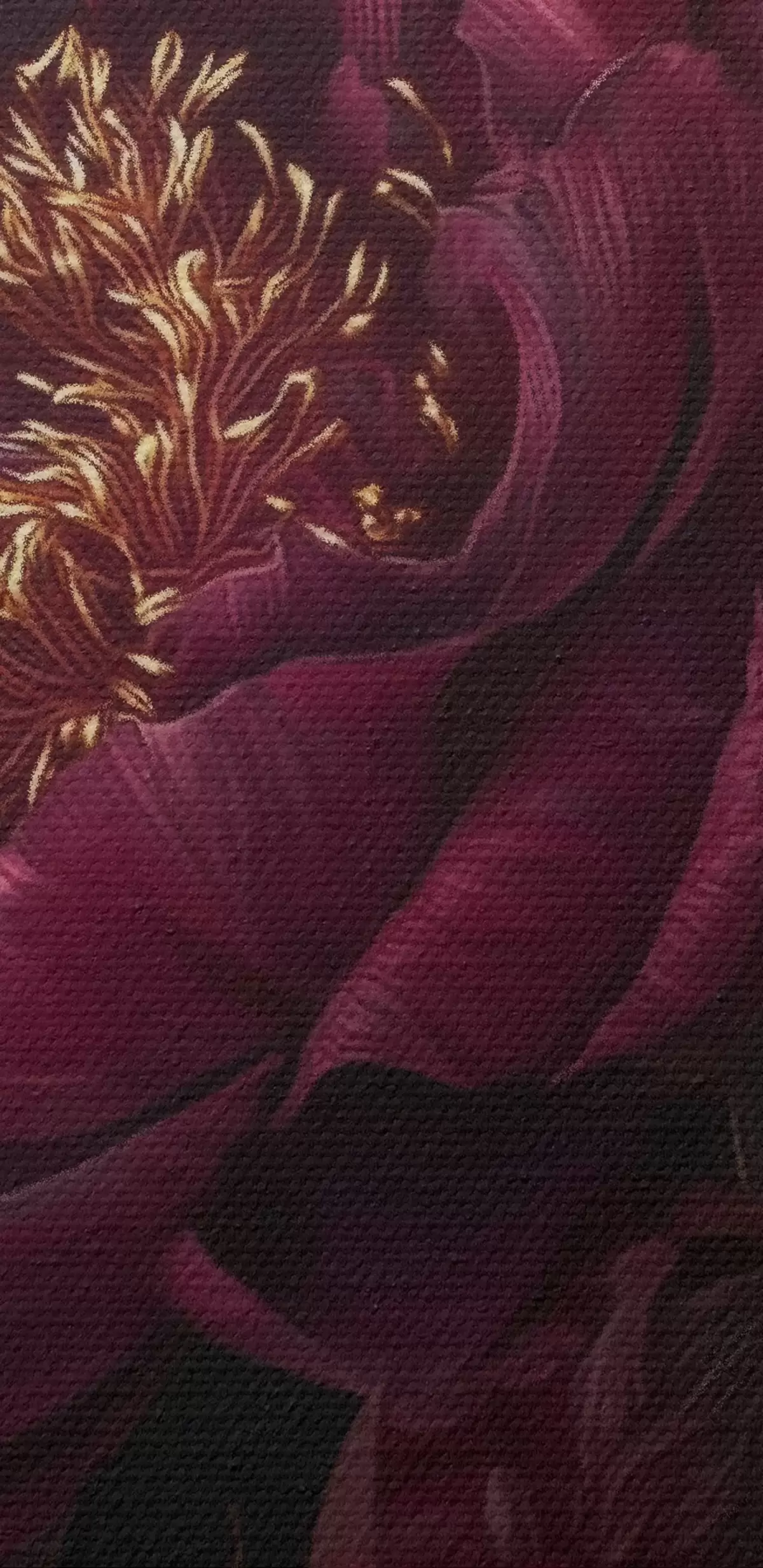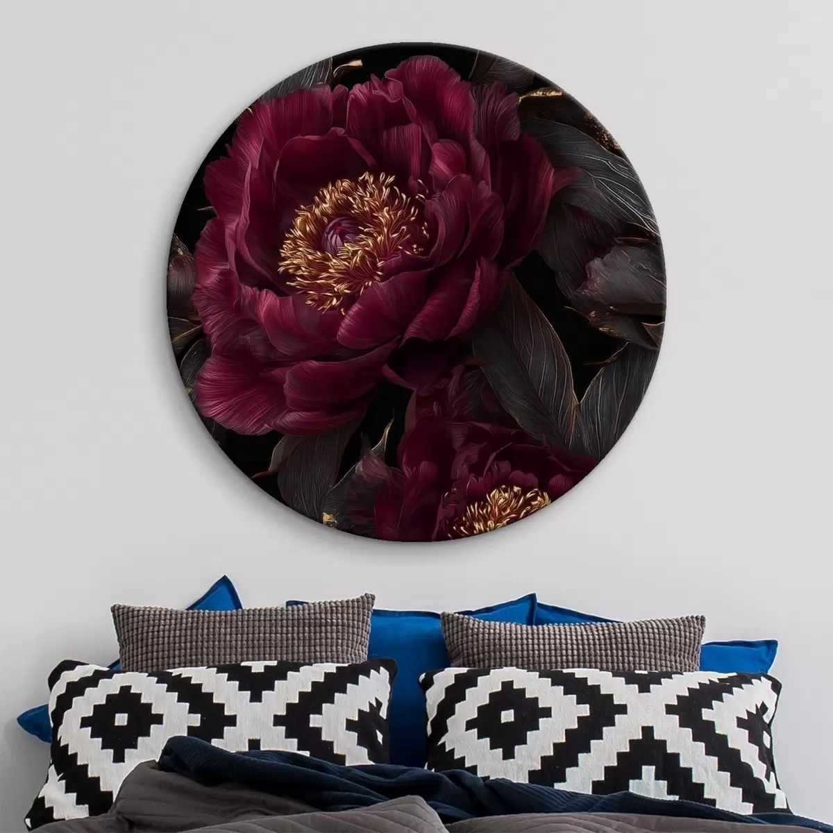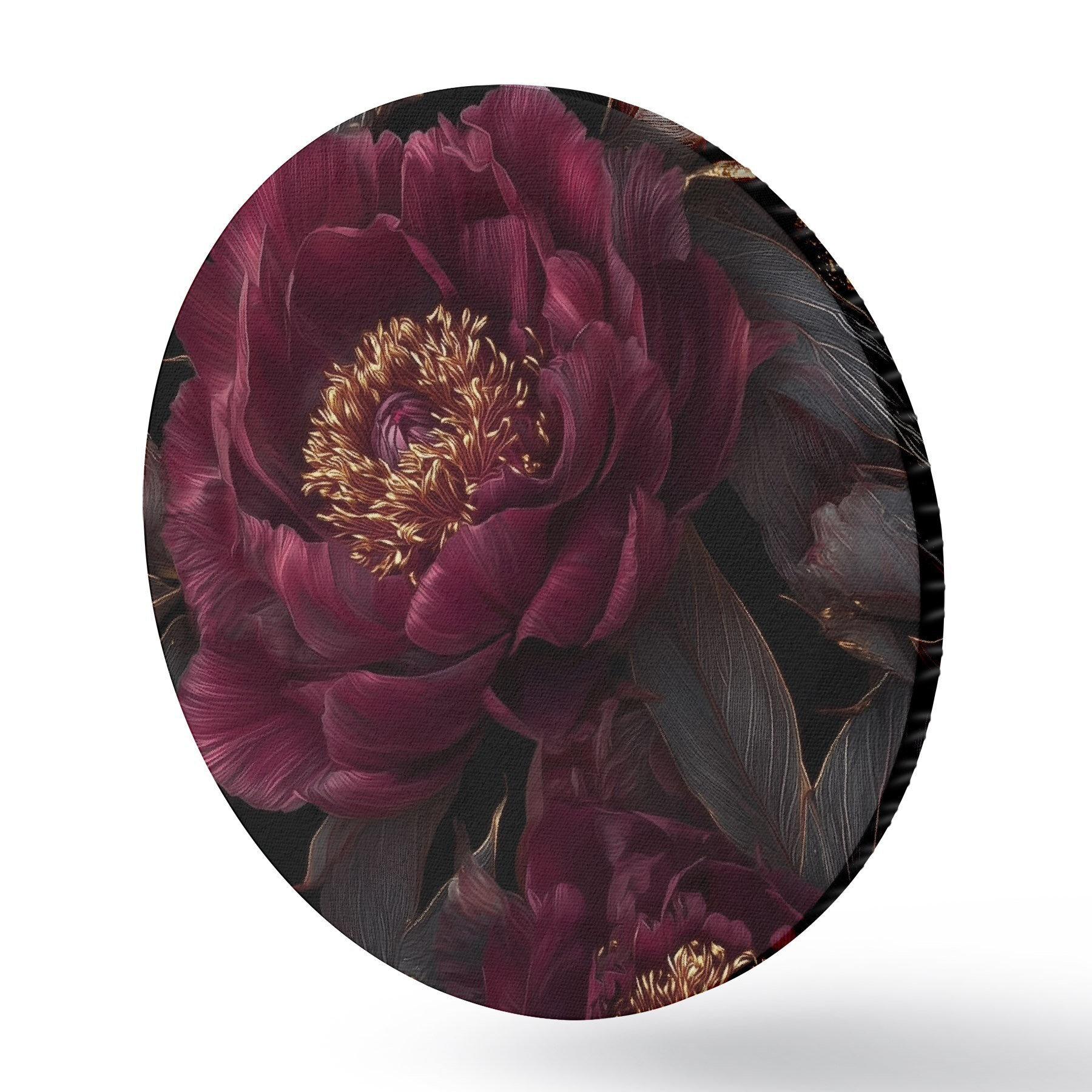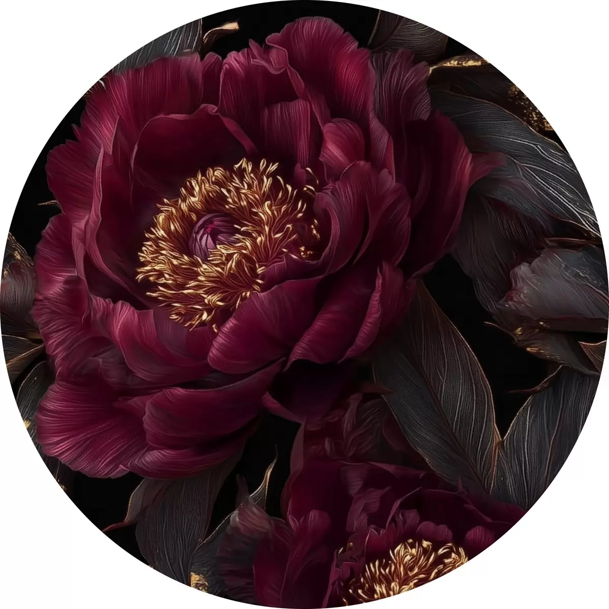 Tableaux ronds Pivoines bordeaux sur fond noir avec des touches de jaune r45877