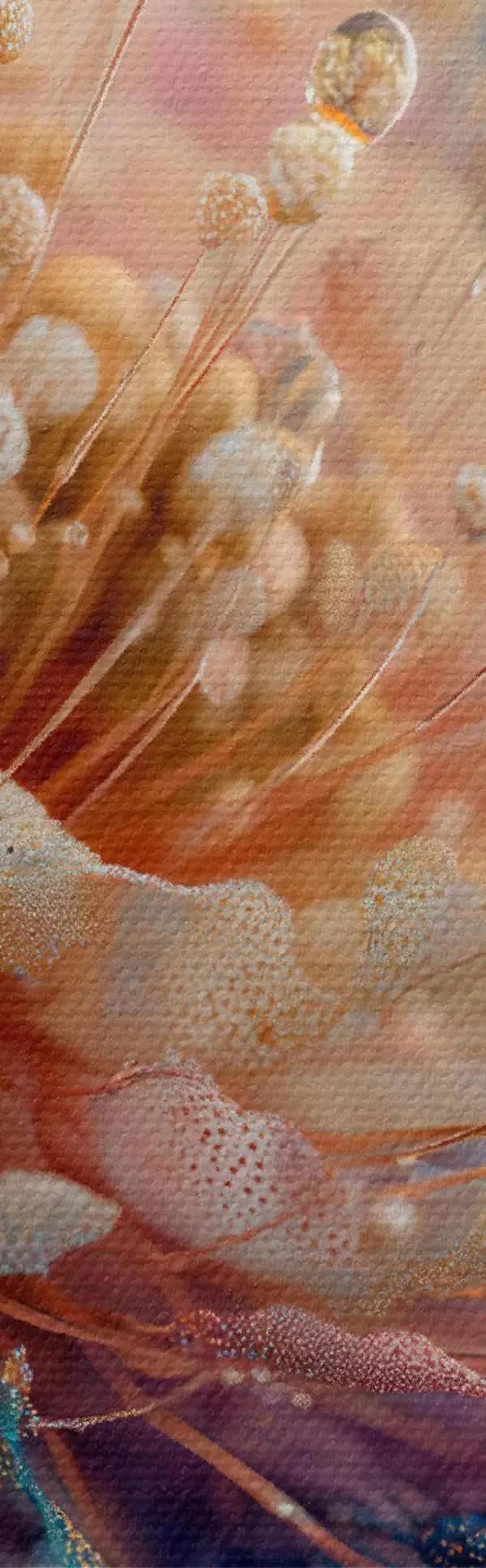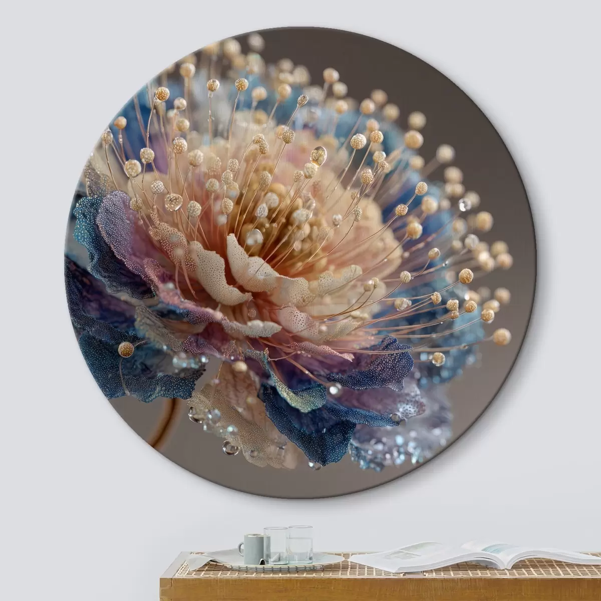Tableaux ronds Fleur nacrée avec des gouttes de rosée, pétales couleur pêche et bleu r45911