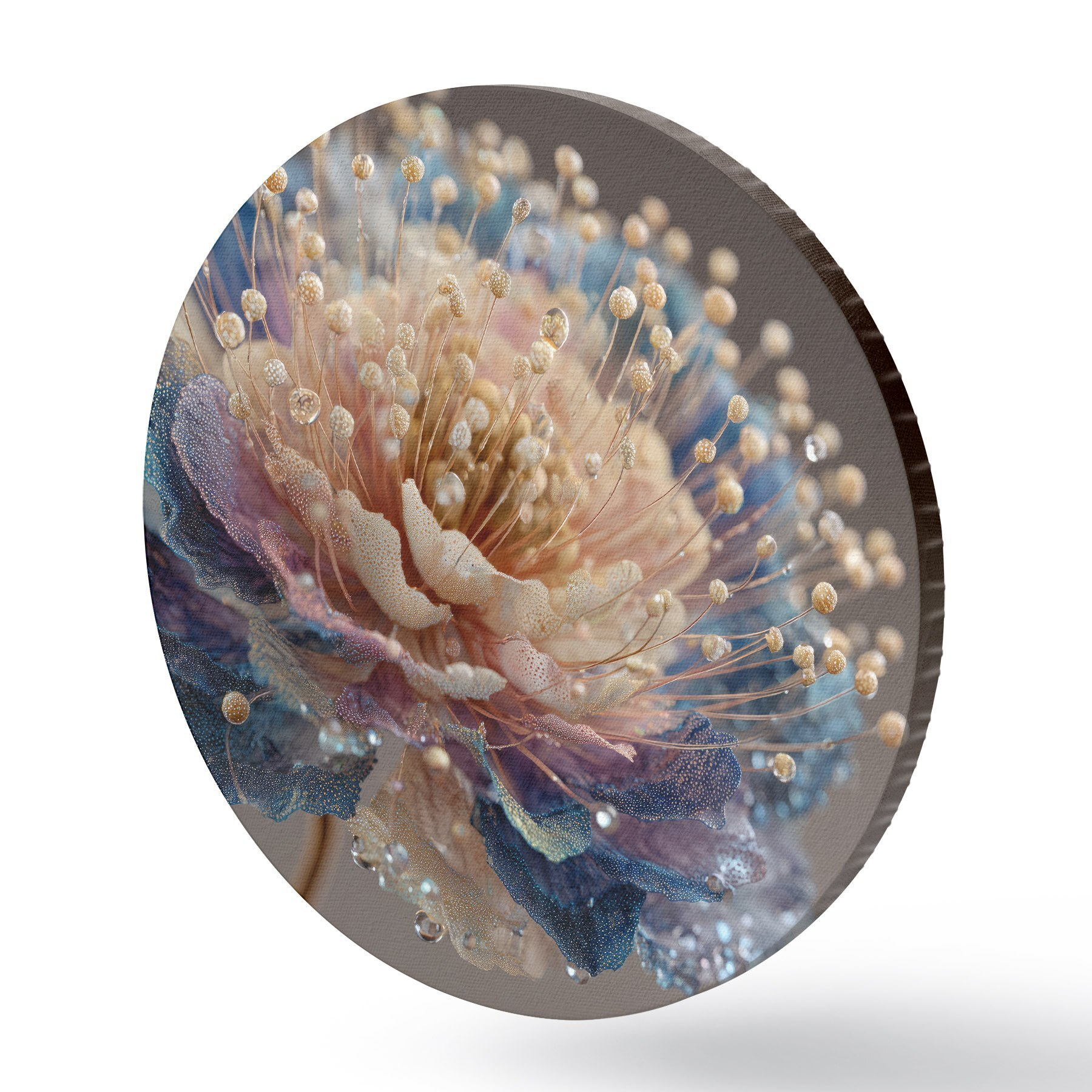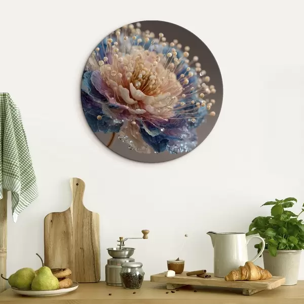 Tableaux ronds Fleur nacrée avec des gouttes de rosée, pétales couleur pêche et bleu r45911