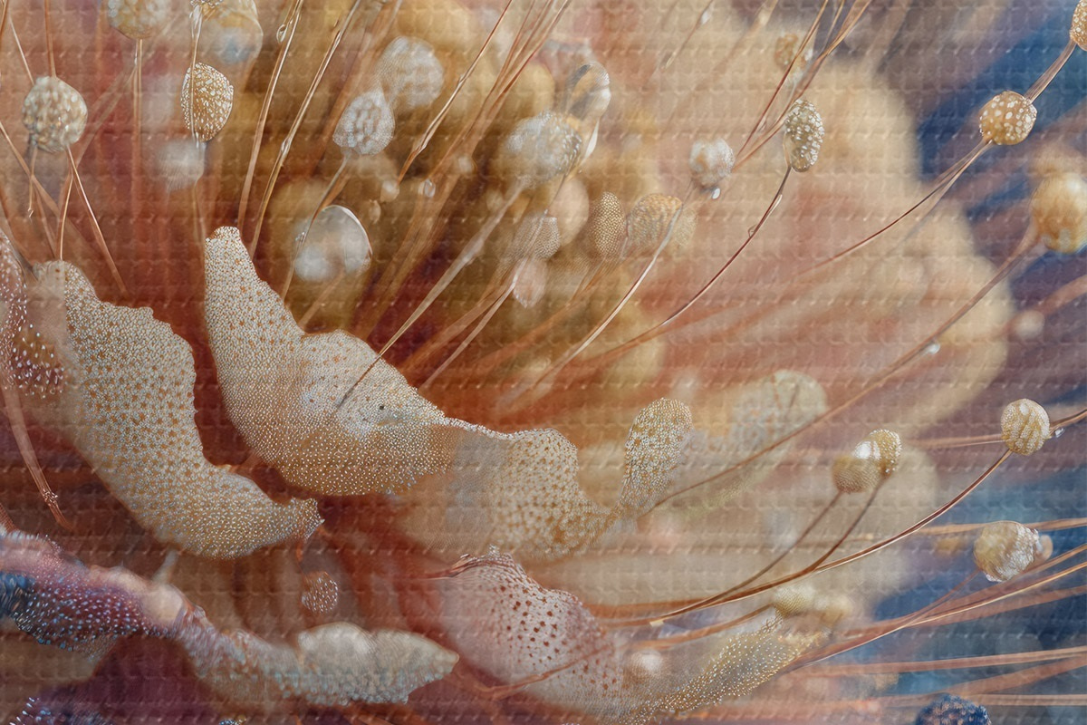 Image Fleur nacrée avec des gouttes de rosée, pétales couleur pêche et bleu Nr r45911
