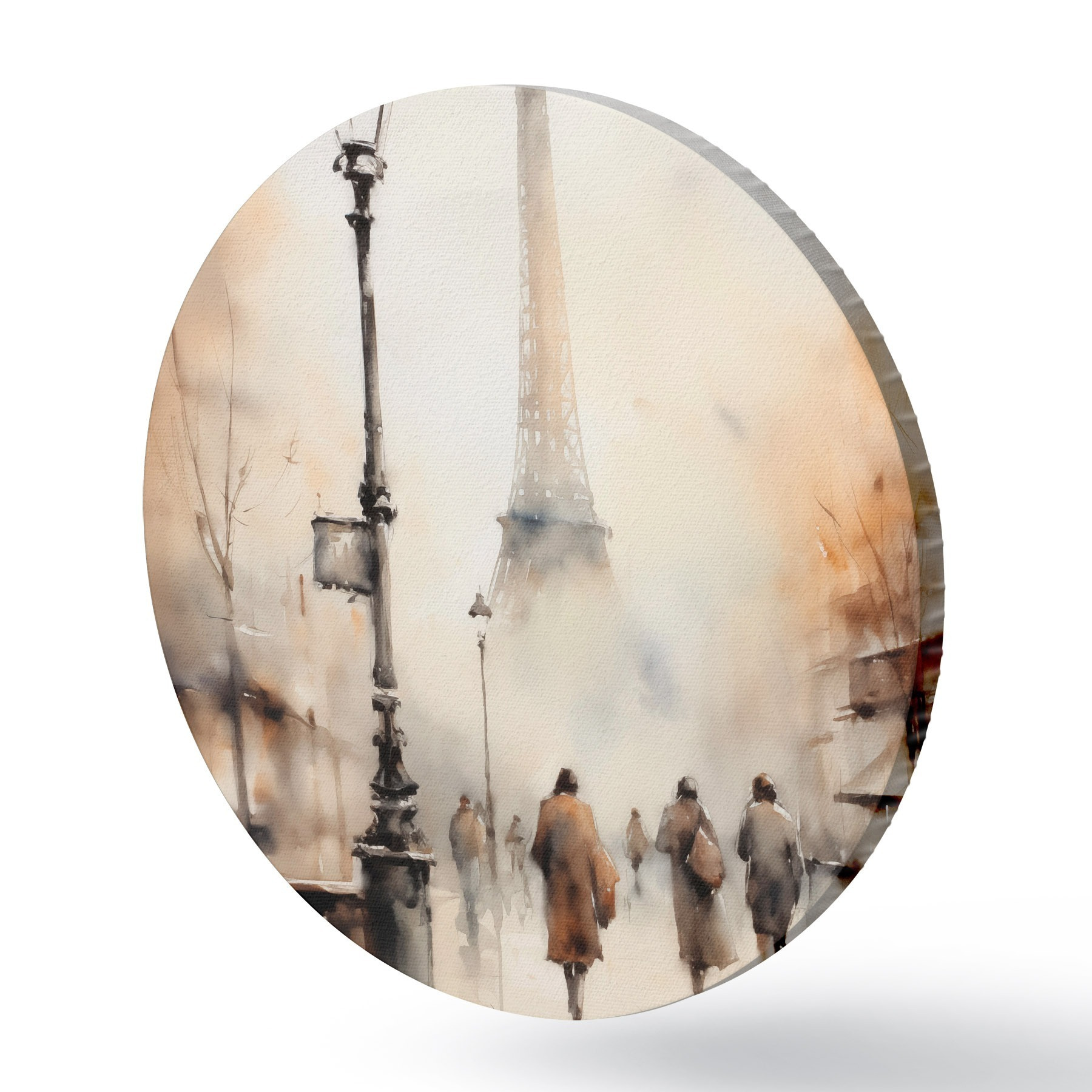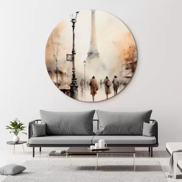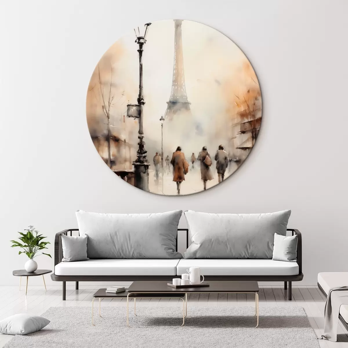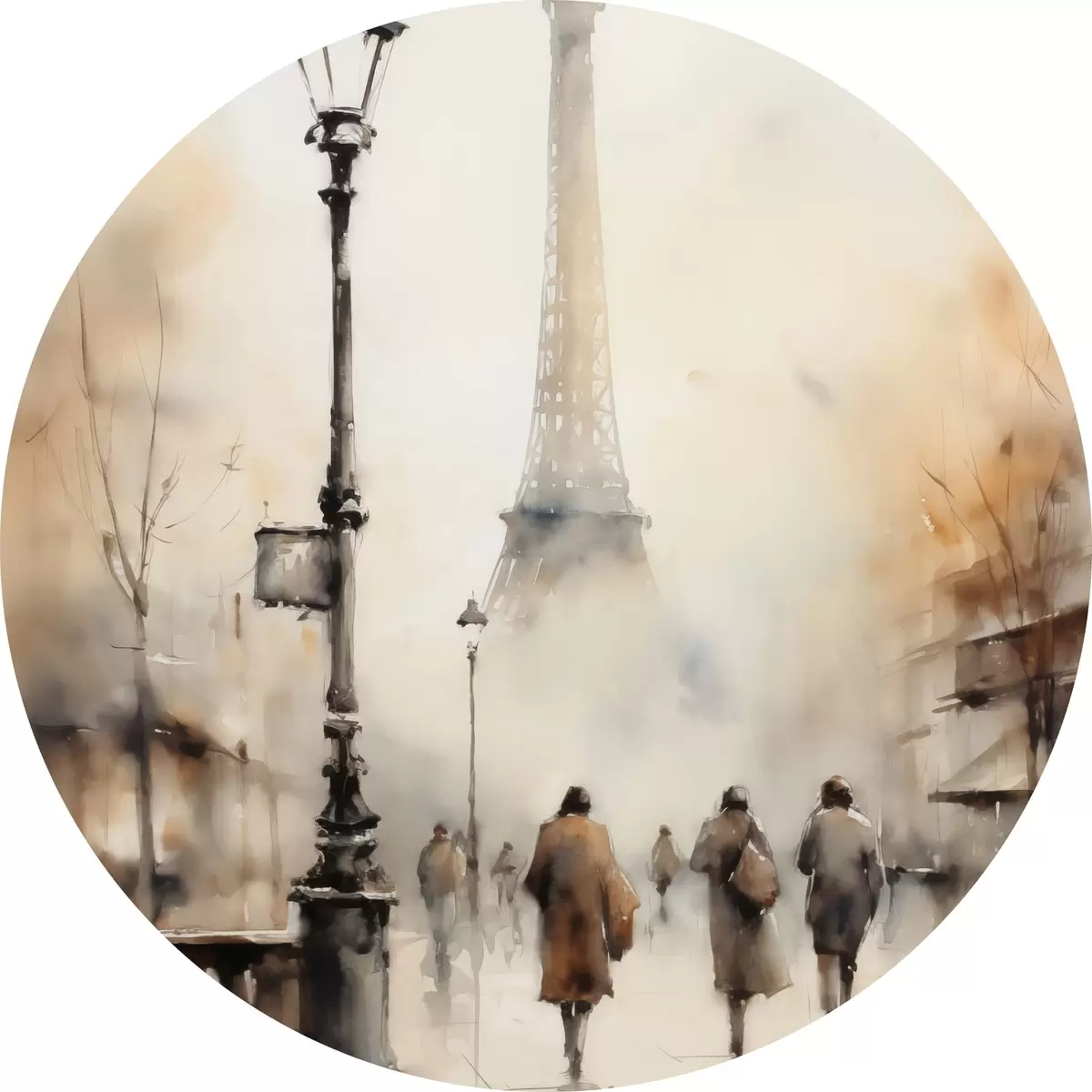 Tableaux ronds Une journée pluvieuse d'automne à Paris avec la Tour Eiffel en arrière-plan et des lampadaires vintage r45931