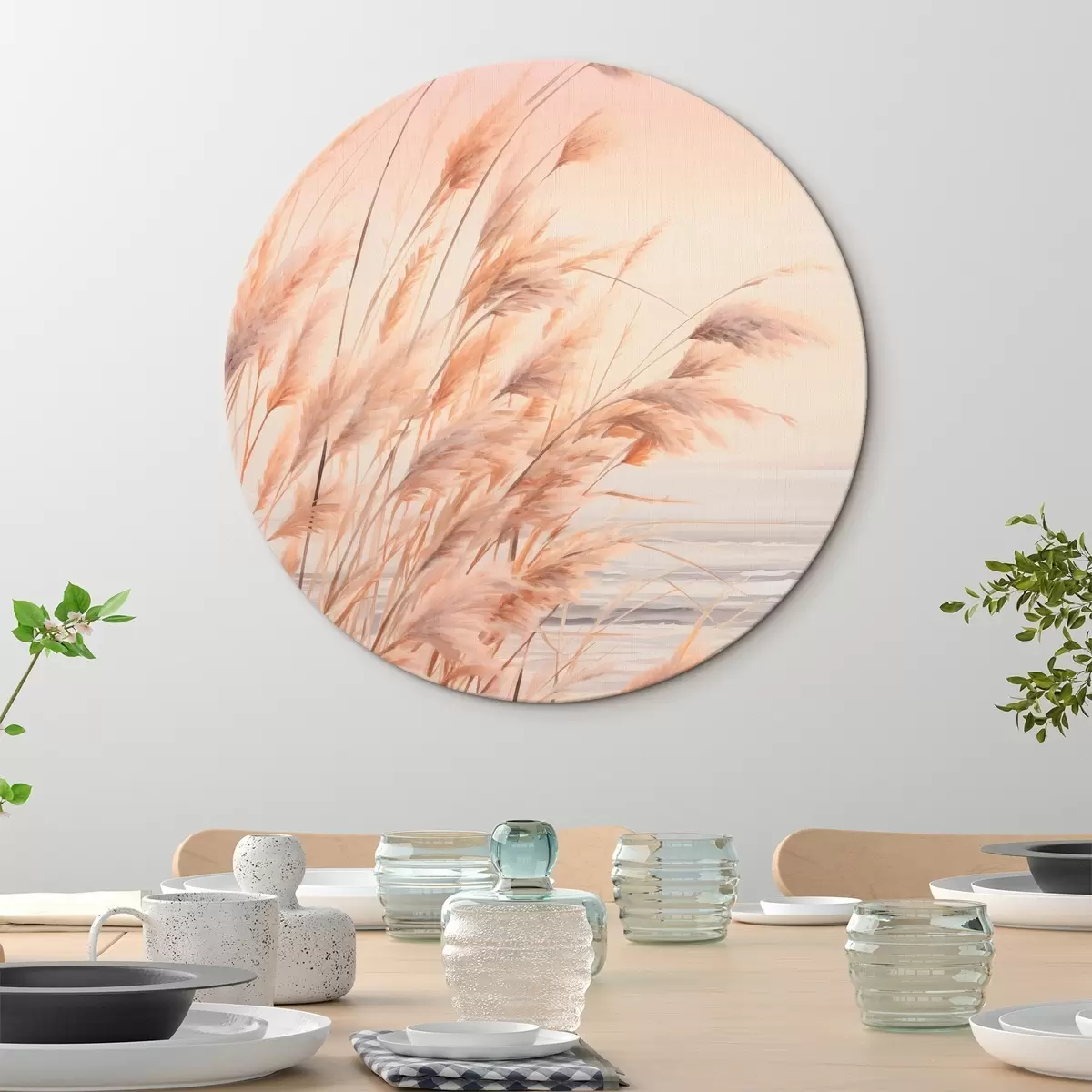 Tableaux ronds Herbe de la pampa avec une palette de couleurs orange pastel, un ciel rose pâle, un paysage paisible r45934