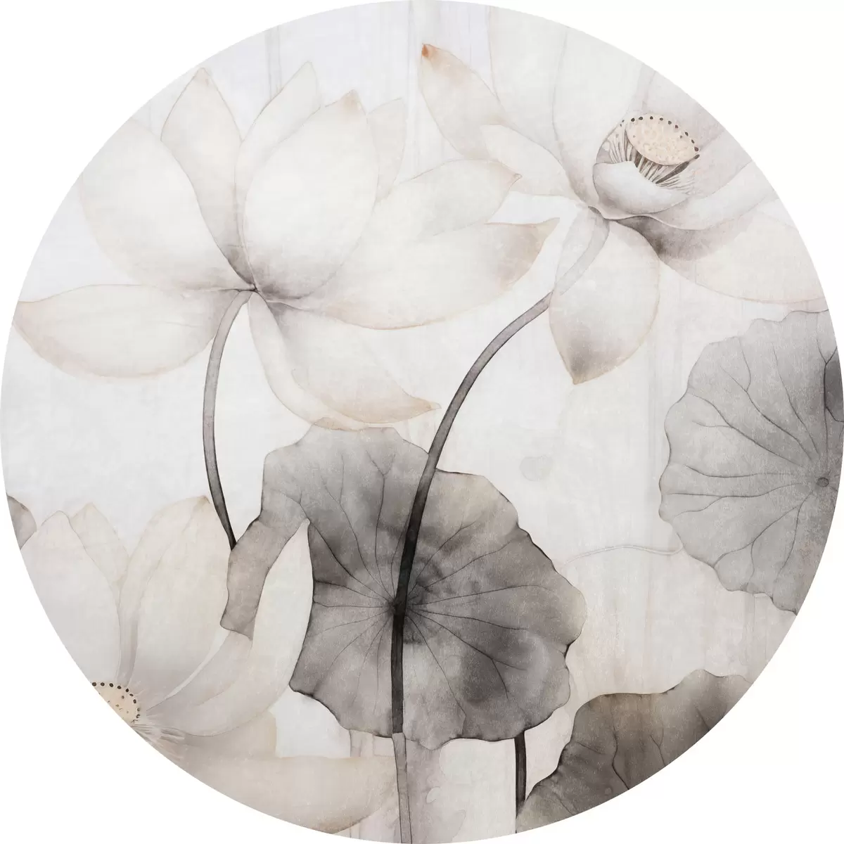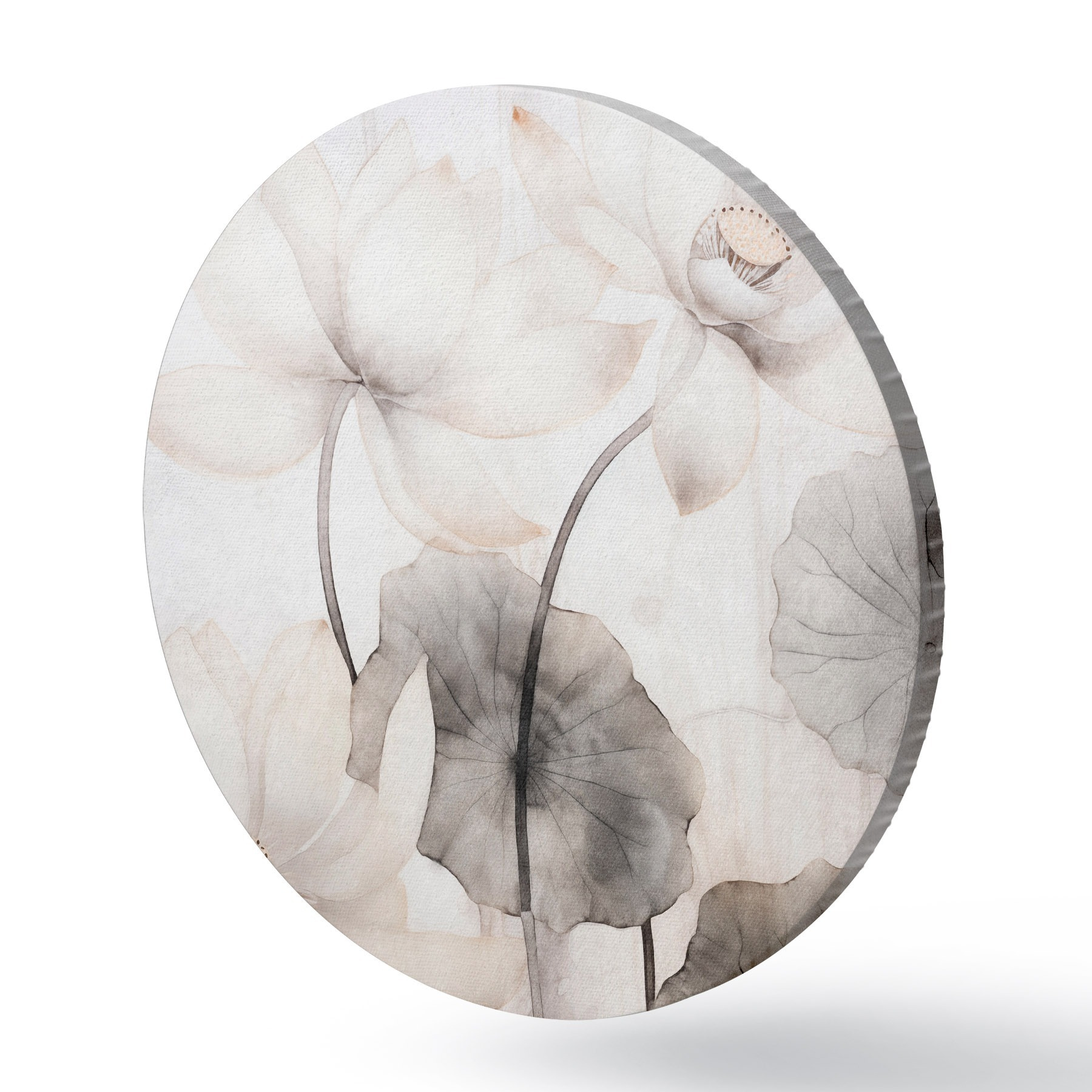 Tableaux ronds Fleurs de lotus blanches texturées avec des feuilles foncées, fond clair, design minimaliste r45937