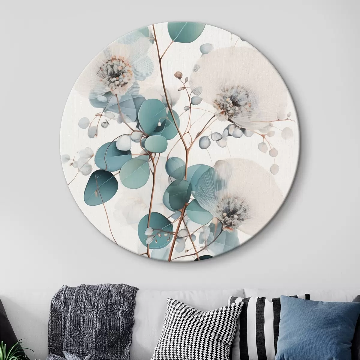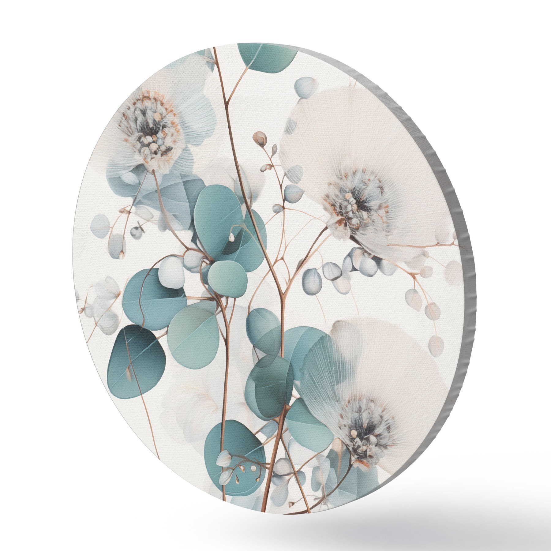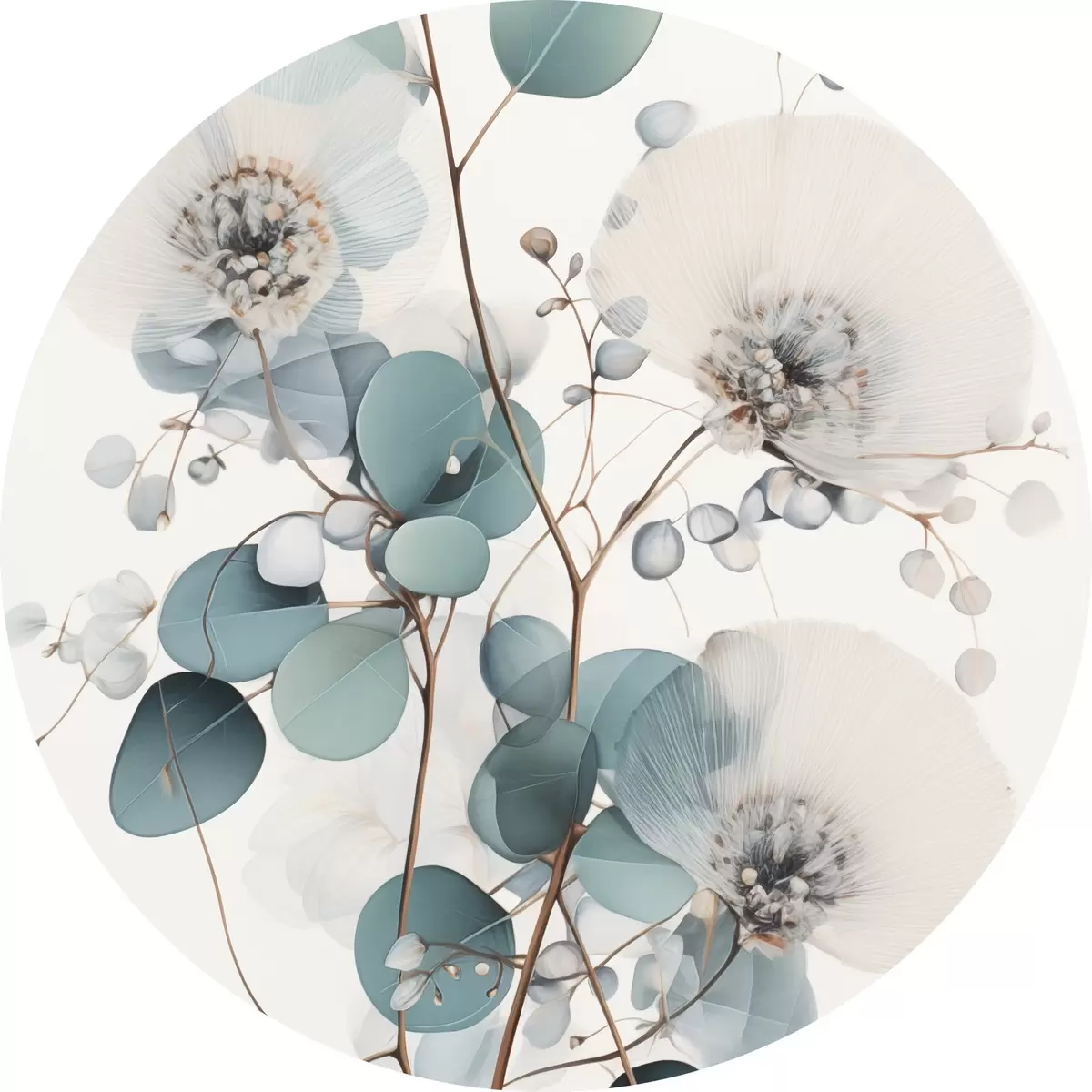 Tableaux ronds Fleurs abstraites d'eucalyptus aux pétales blancs, feuilles vert pâle sur les branches r45946