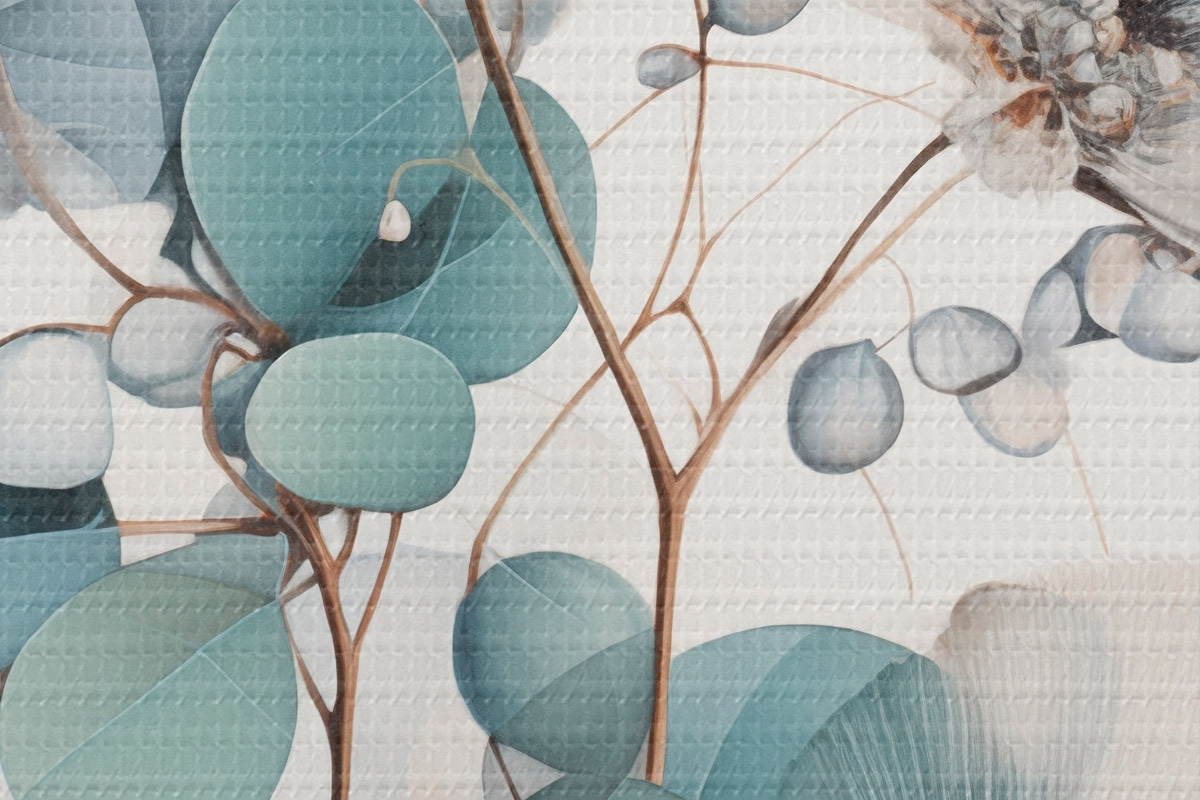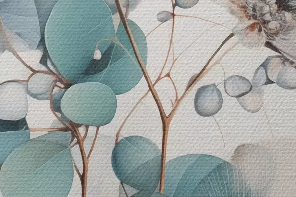Image Fleurs abstraites d'eucalyptus aux pétales blancs, feuilles vert pâle sur les branches Nr r45946