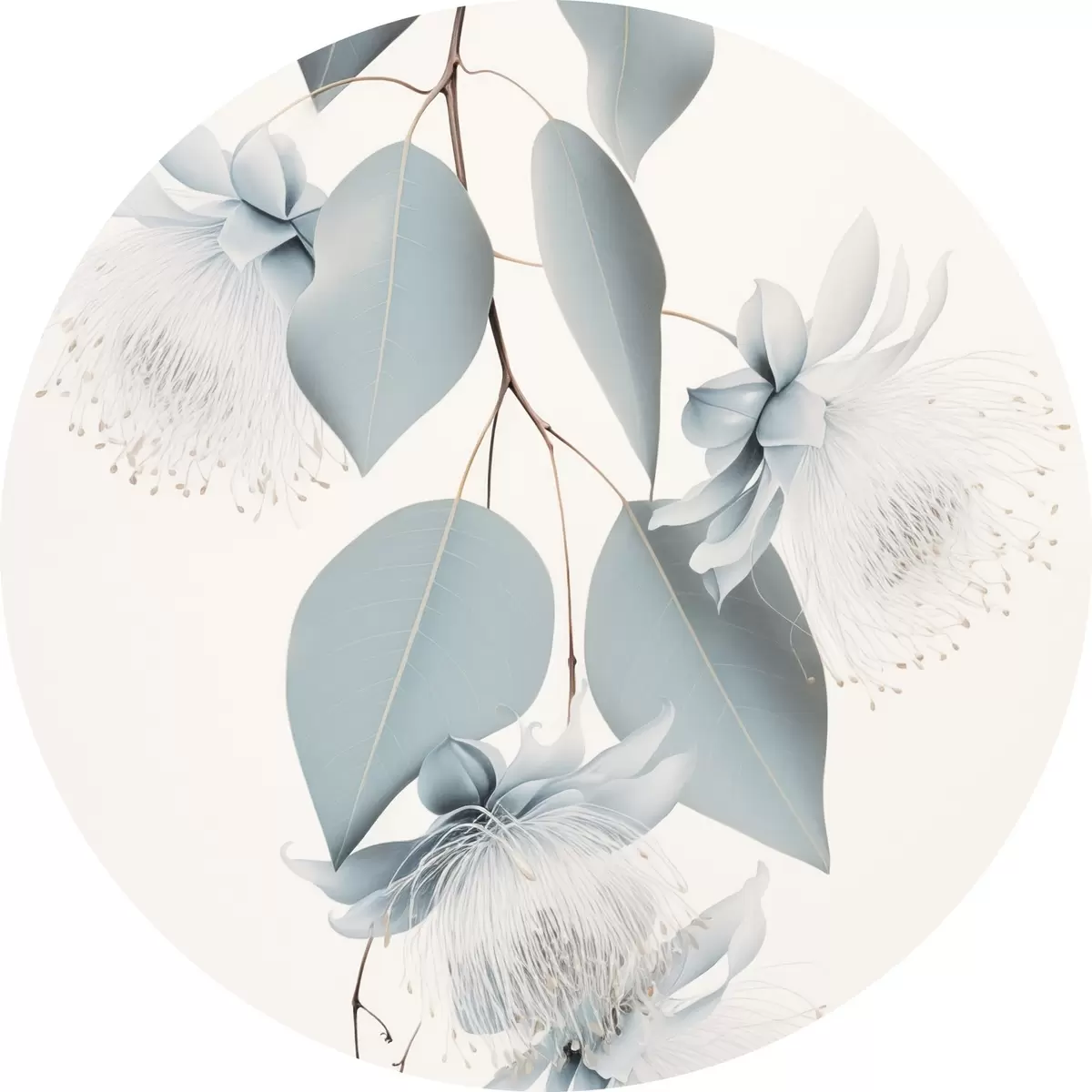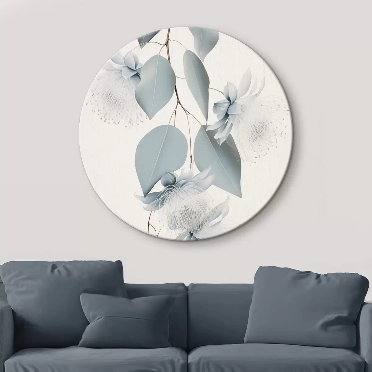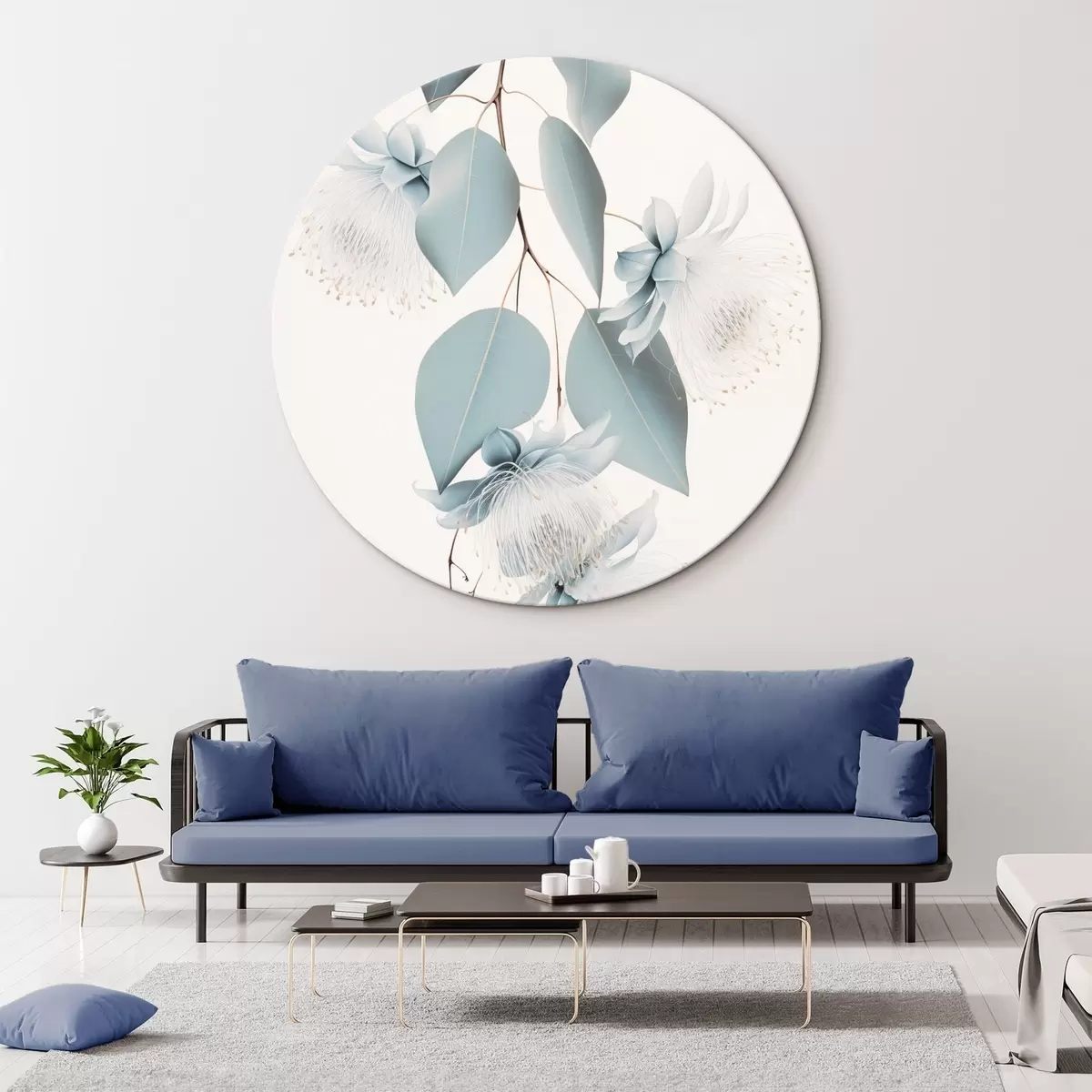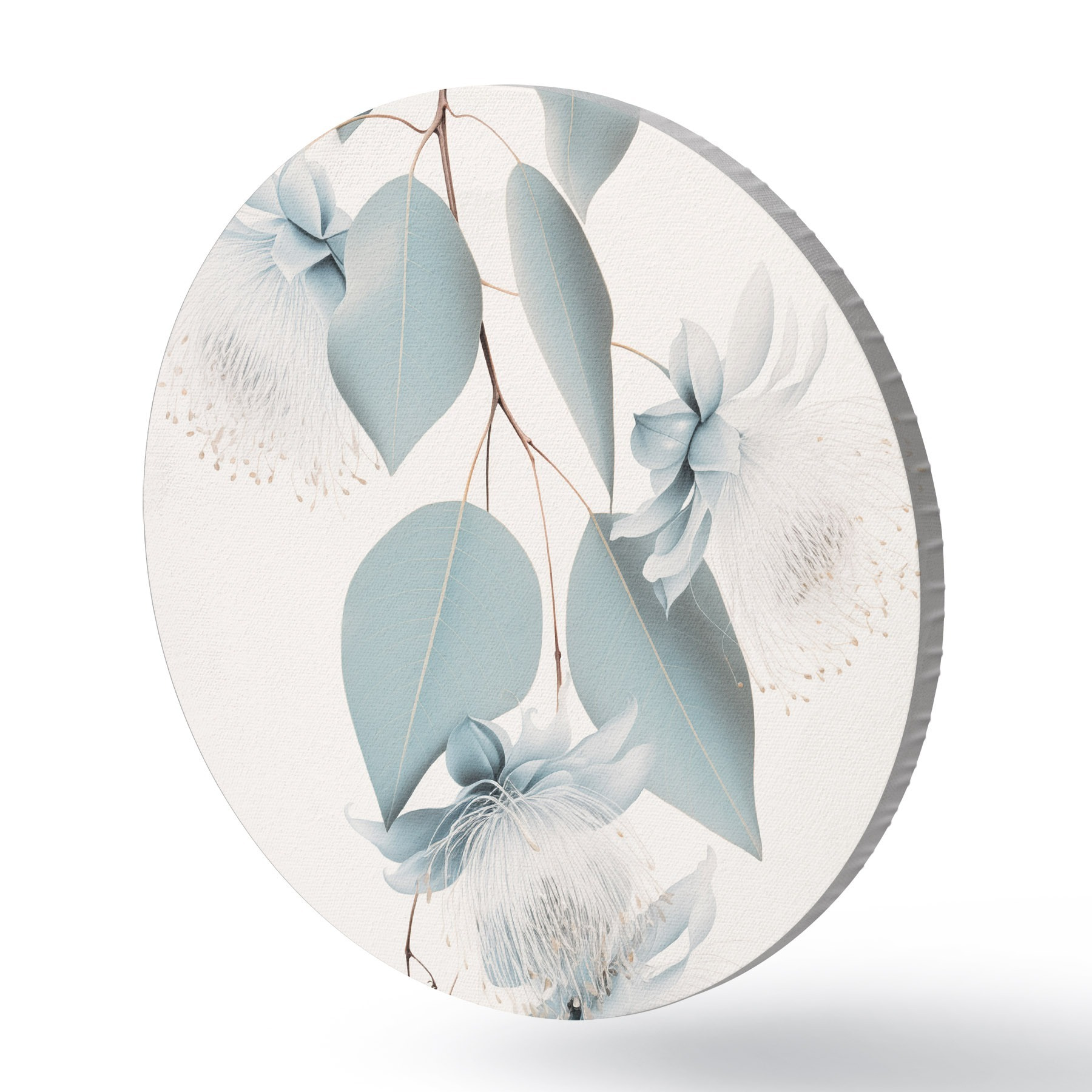 Tableaux ronds Branche d'eucalyptus avec des feuilles bleues et des fleurs blanches, fond clair r45947