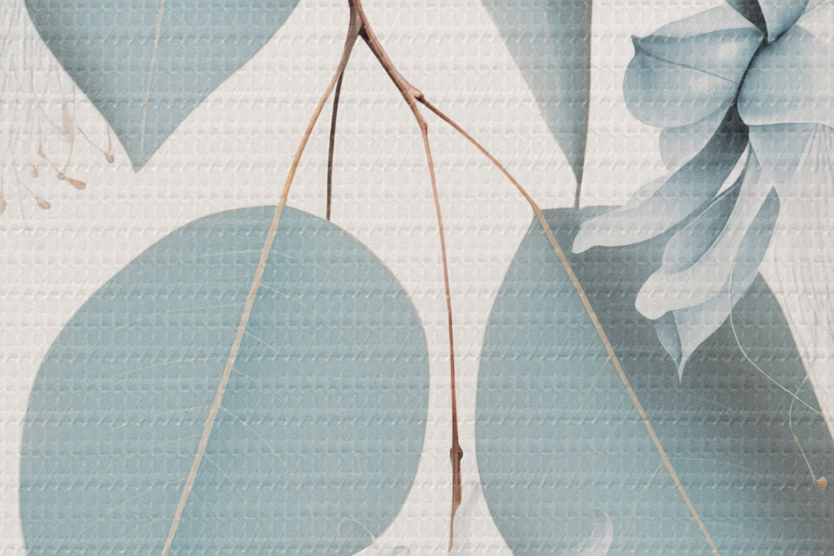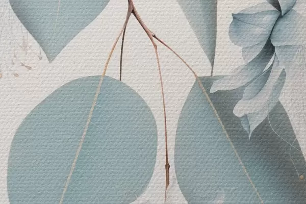 Image Branche d'eucalyptus avec des feuilles bleues et des fleurs blanches, fond clair Nr r45947