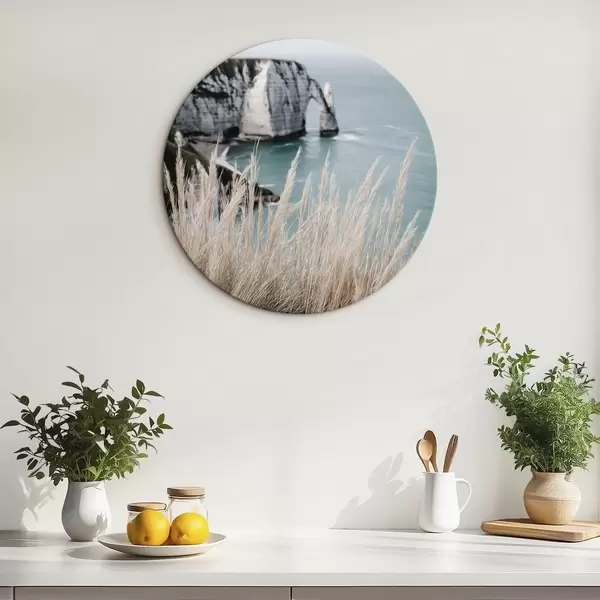 Tableaux ronds Mer et arche rocheuse, vue à travers les herbes sèches r46142